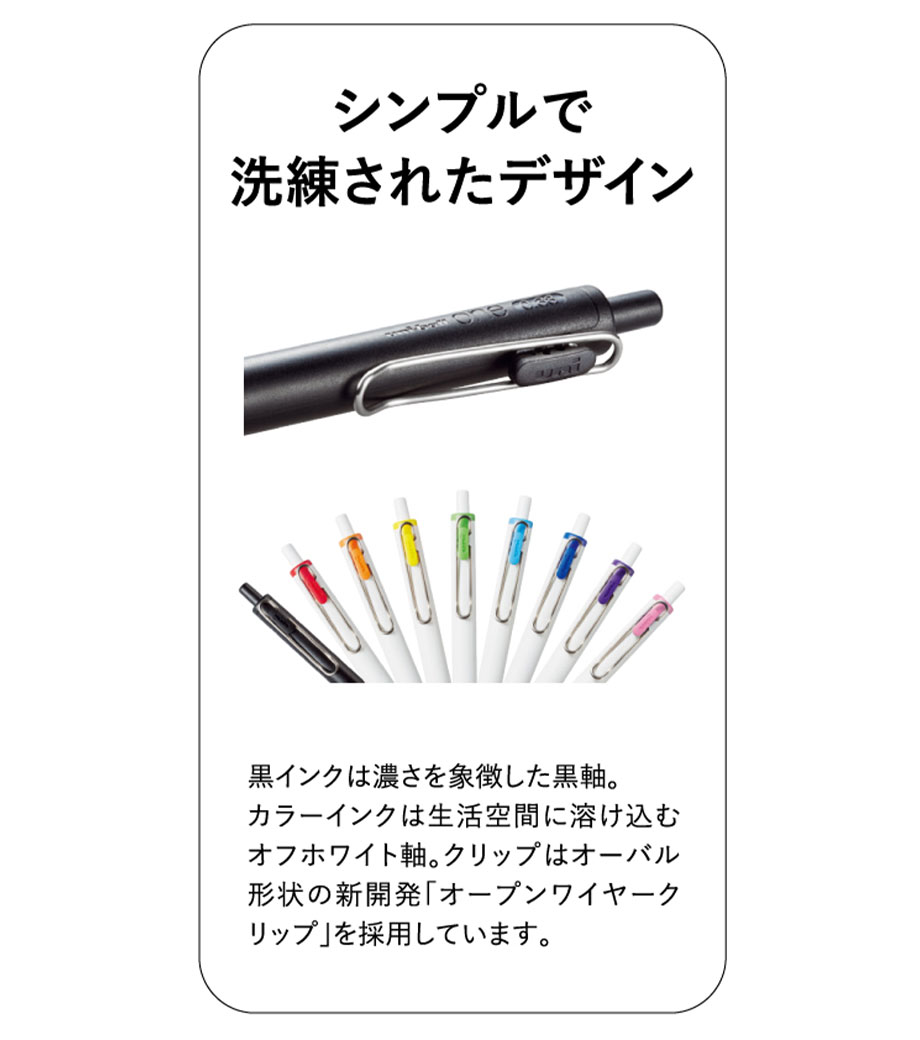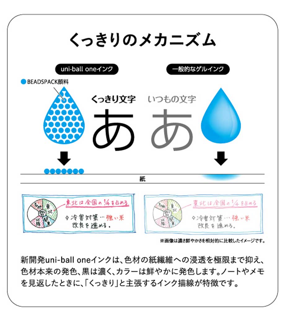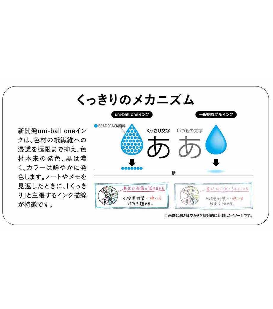 ユニボールワンは、新技術ビーズパック顔料を使用した新インクで、一層色濃い文字が書け、 記憶に残りやすい効果が実証されています。1色またはフルカラーで名入れをして、スクールグッズやノベルティの制作にいかがですか。