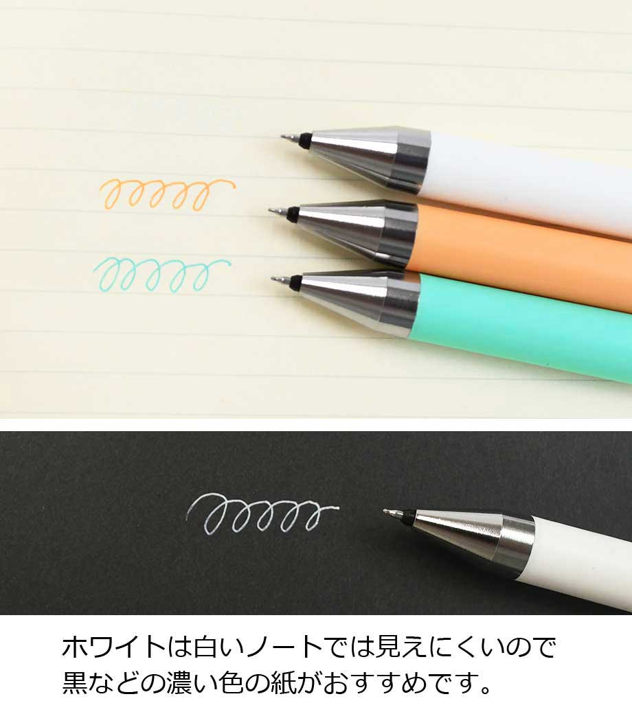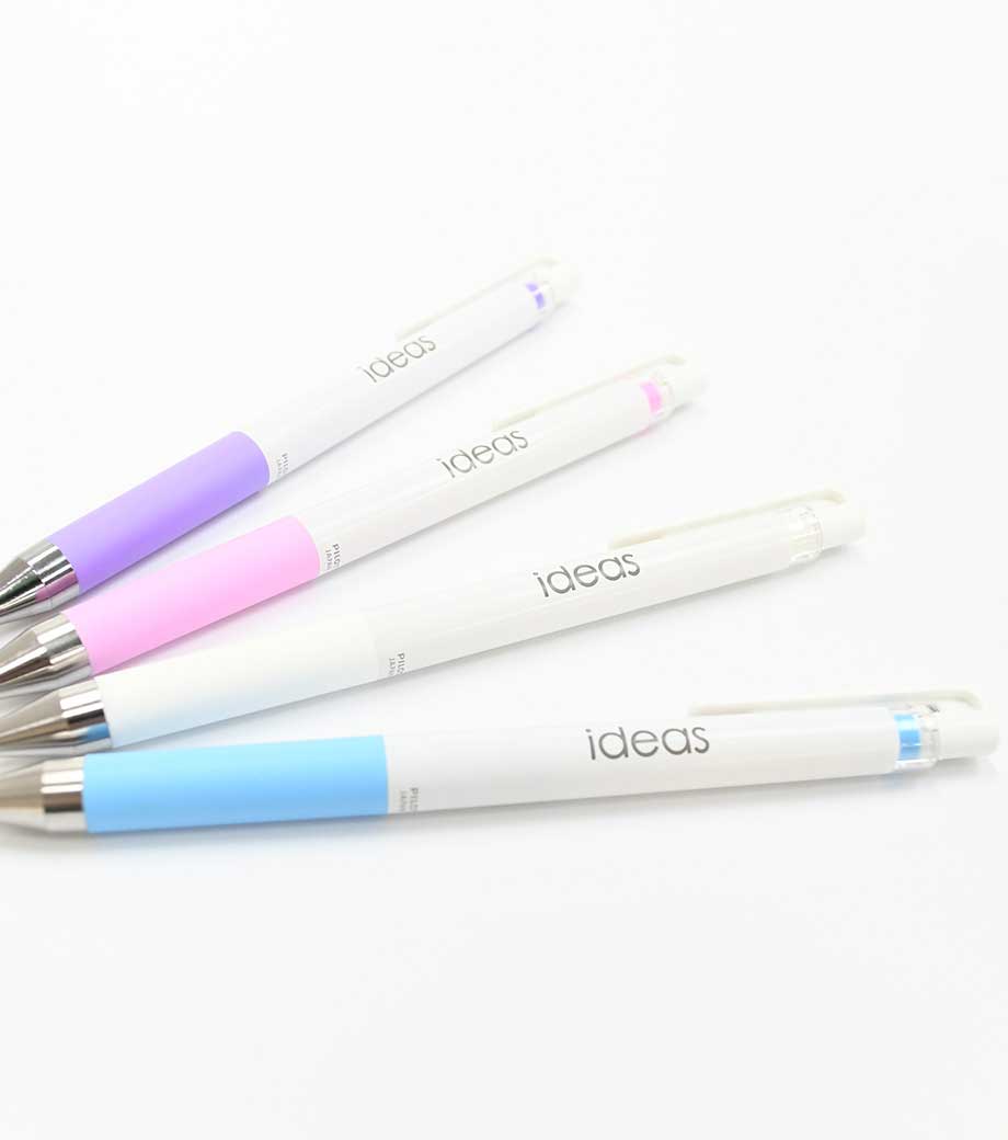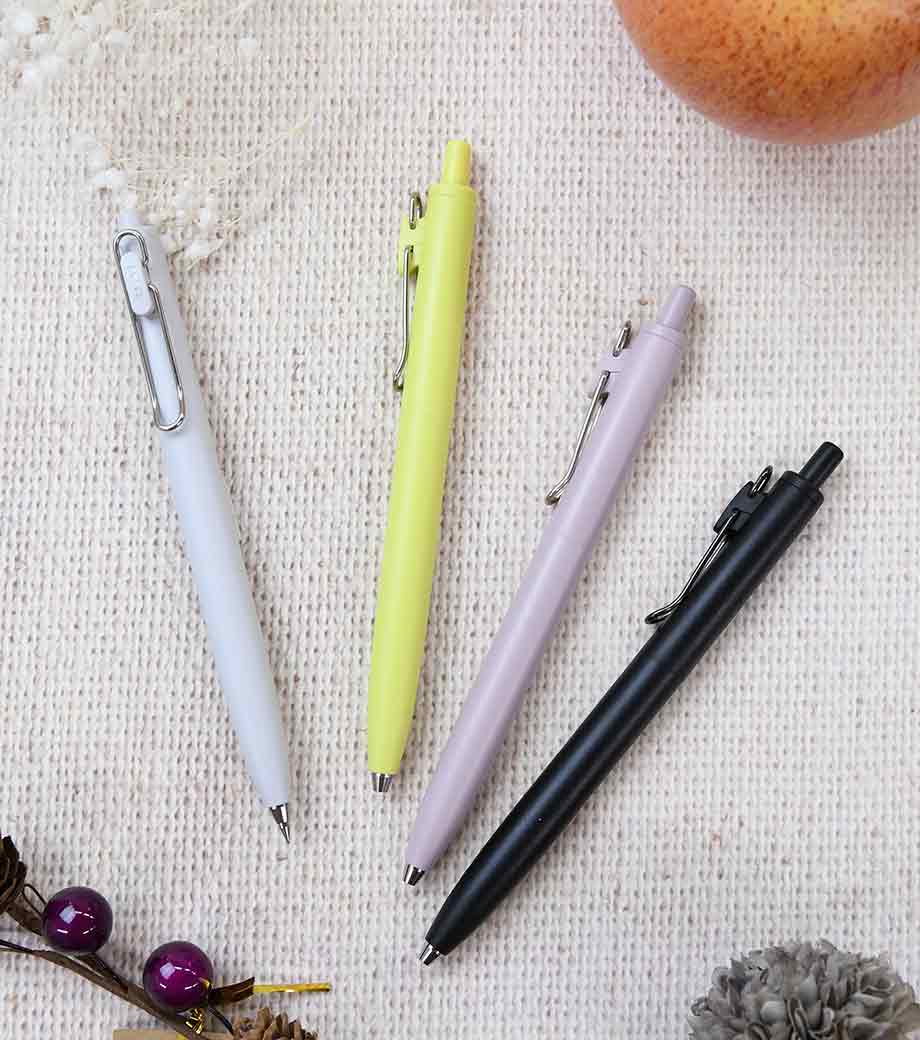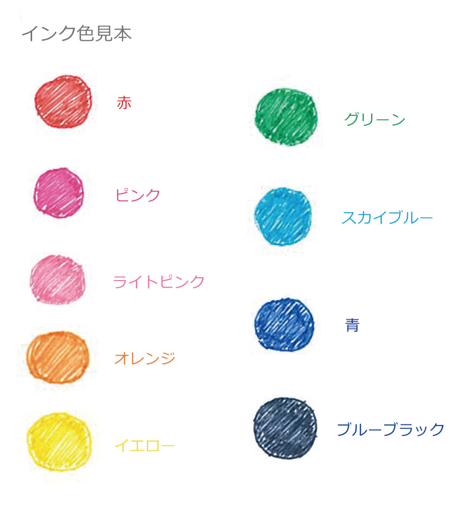 インク色は全10色。オフホワイト軸をベースにインク色がポイントカラーになっています。黒インクのみ黒軸もお選びいただけます。軸部分に1色またはフルカラー名入れが可能です。学習塾の体験学習やデザイン関連企業の説明会・展示会など多岐にわたるノベルティを制作できます。
