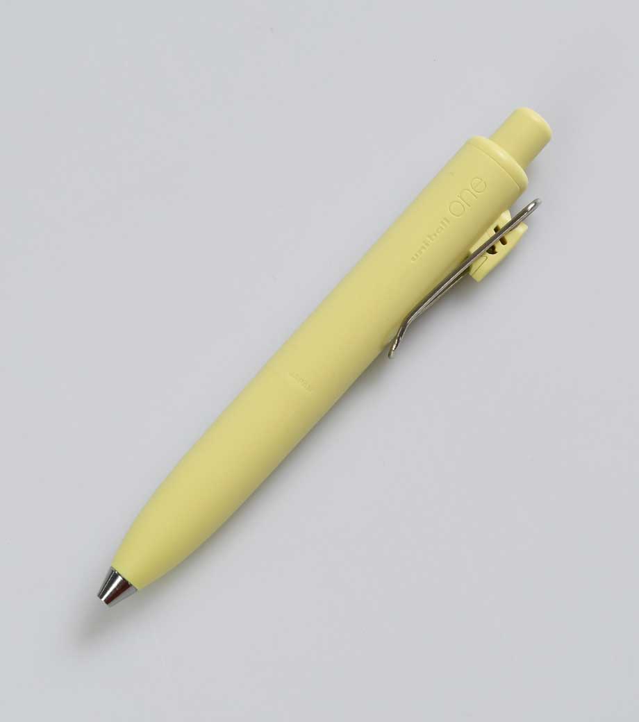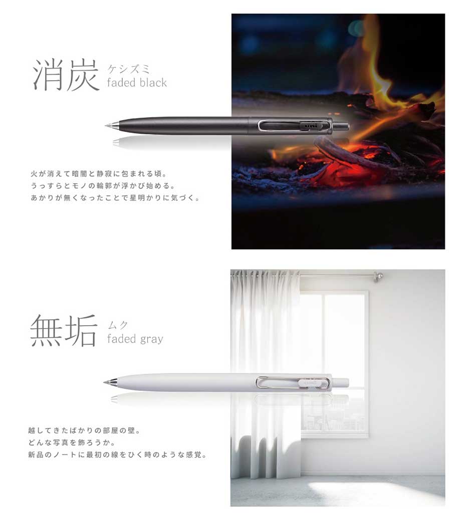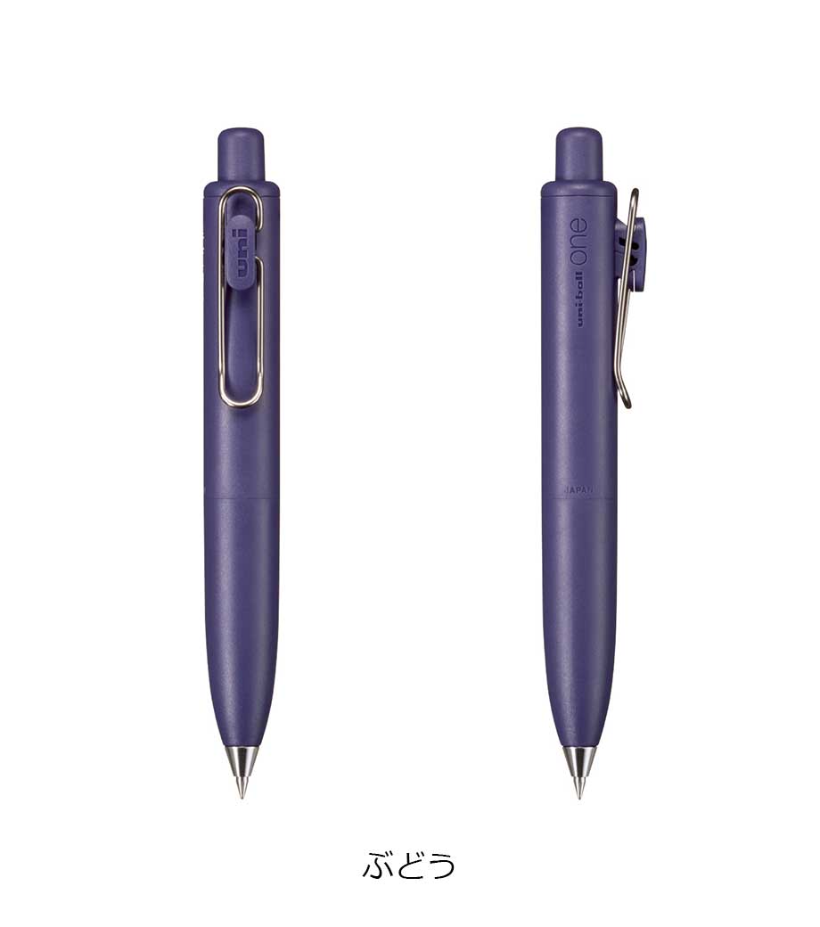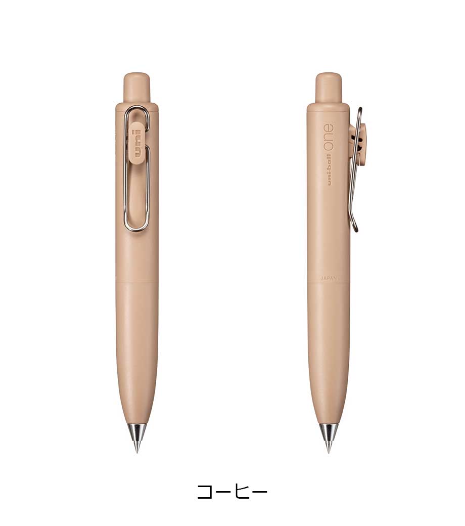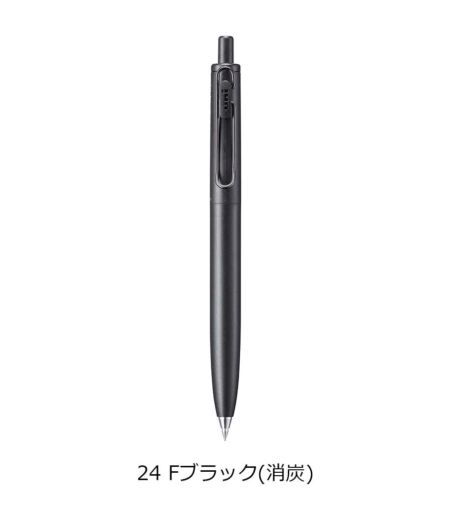 三菱鉛筆 ユニボール ワン F 0.38mmは、日常で何気なく目にする景色を表現したくすみカラー軸。主張しすぎない色合いと独特な色名が情緒的でおしゃれです。本体色ブラック(消炭)は、クリップも黒メッキになってます。凹凸を限りなく減らした流線型が軸全体に一体感を与え、シャープで洗練された印象に。