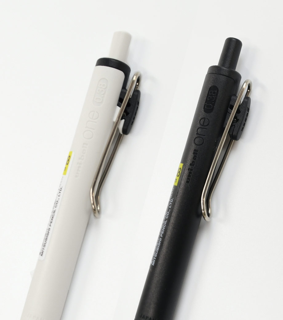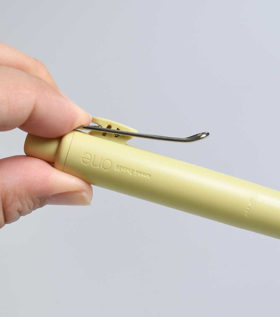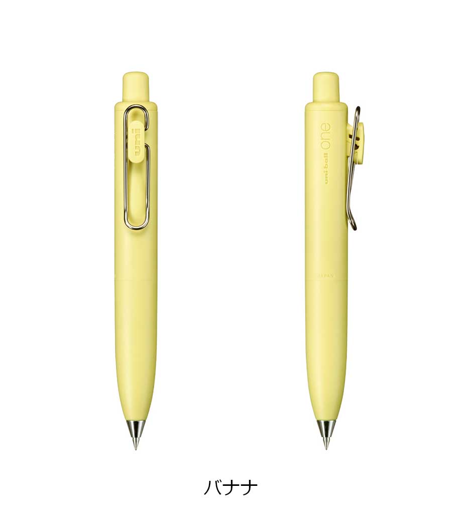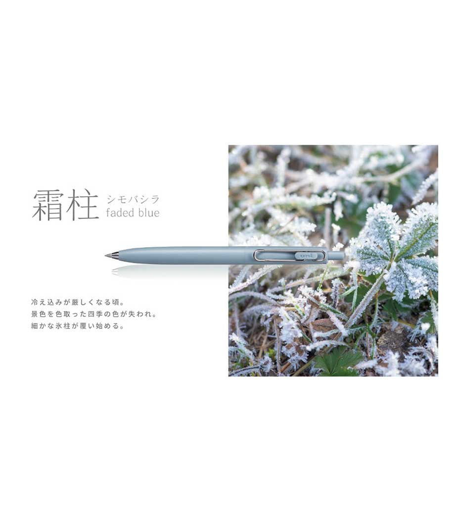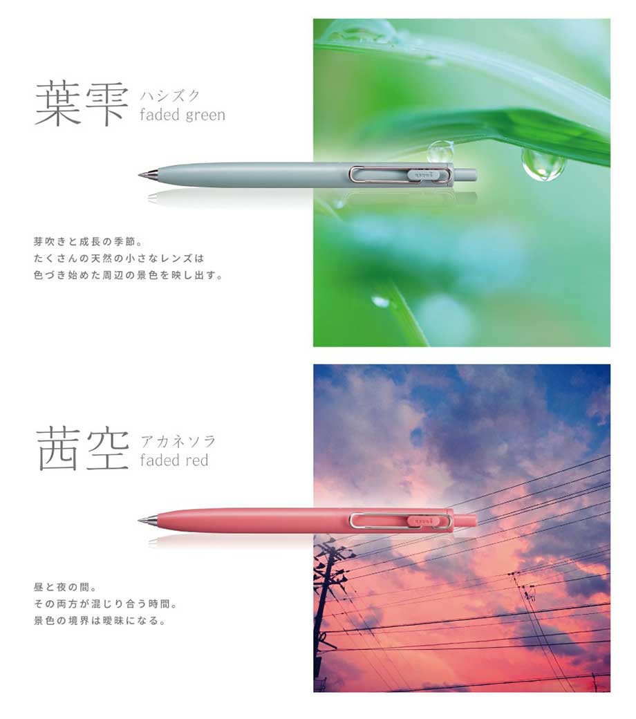 三菱鉛筆 ユニボール ワン F 0.38mmは、日常で何気なく目にする景色を表現したくすみカラー軸。主張しすぎない色合いと独特な色名が情緒的でおしゃれです。本体色ブラック(消炭)は、クリップも黒メッキになってます。凹凸を限りなく減らした流線型が軸全体に一体感を与え、シャープで洗練された印象に。