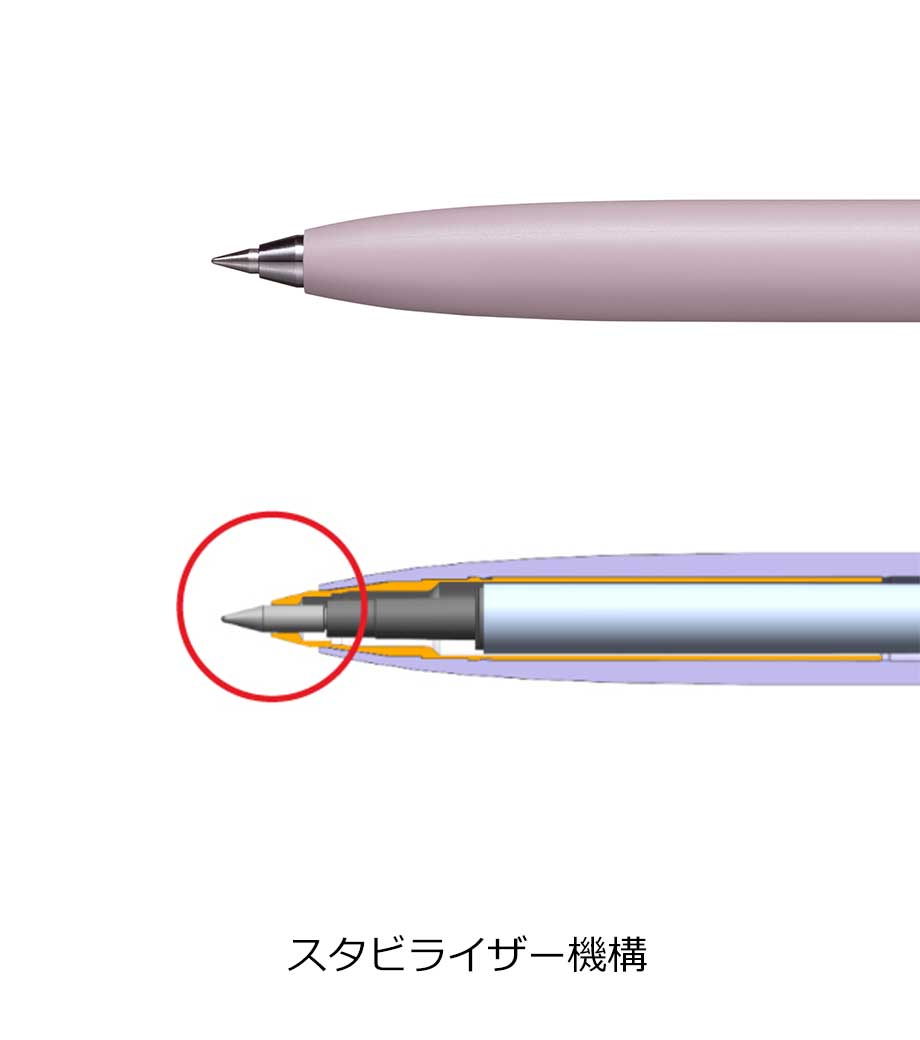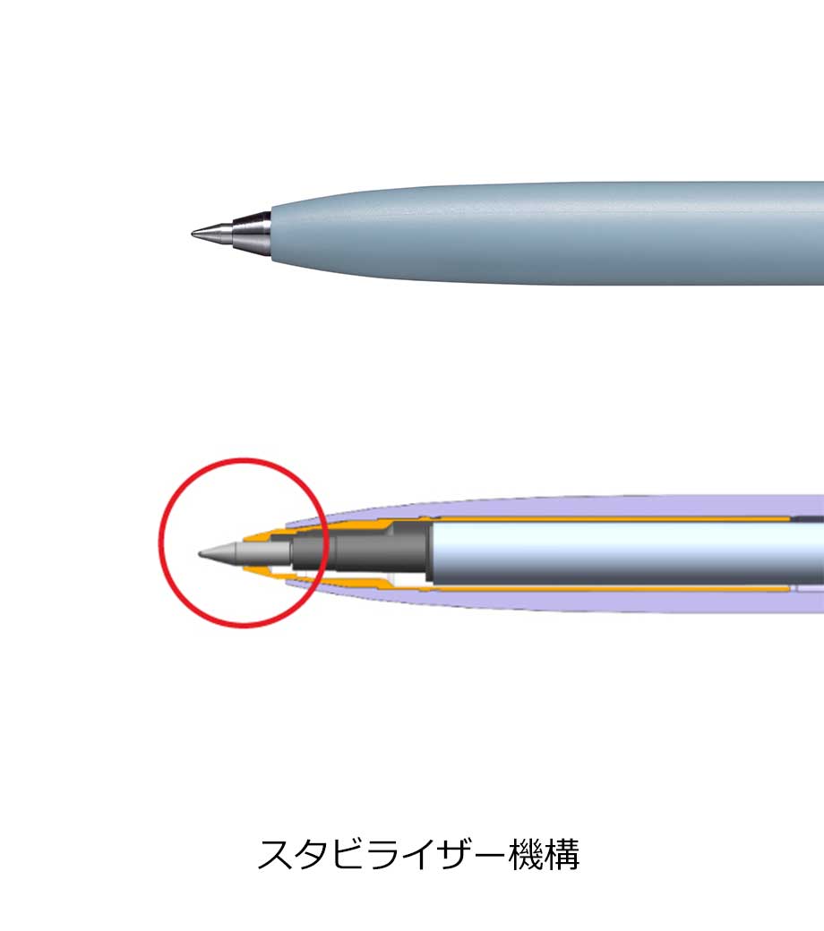 先端は金属製のパーツを使用した「スタビライザー機構」。軸前方の内側まで金属パーツで覆うことで適度な重量感を与え、低重心の安定した筆記を実現しています。1色かフルカラーで名入れをすれば、誰もがもらって嬉しいノベルティに。