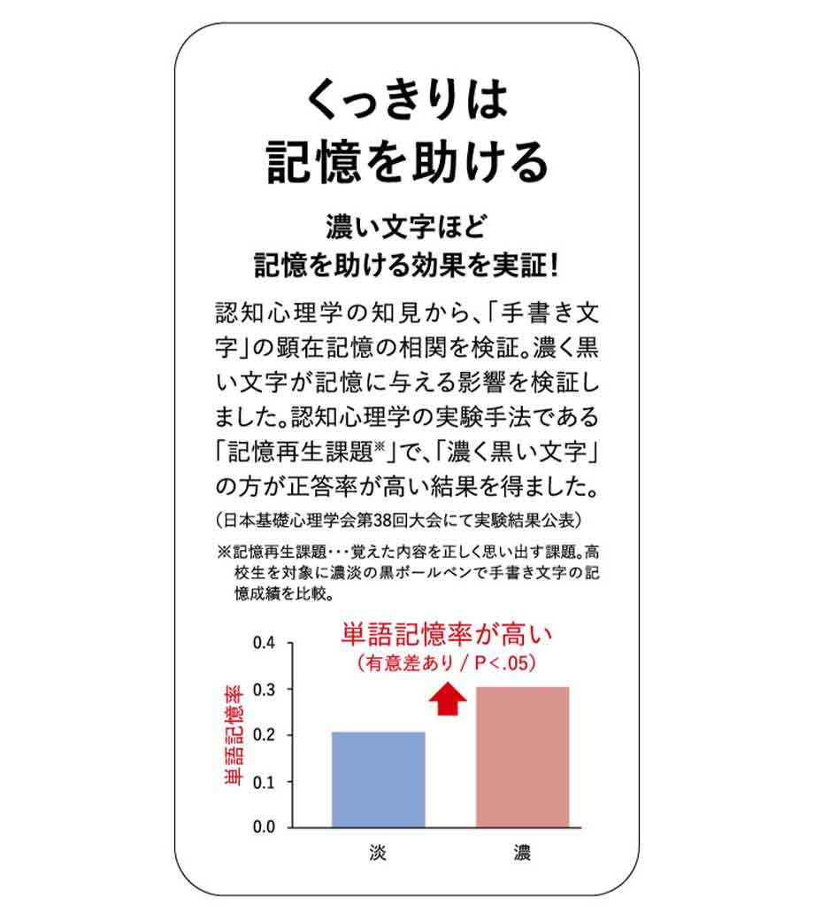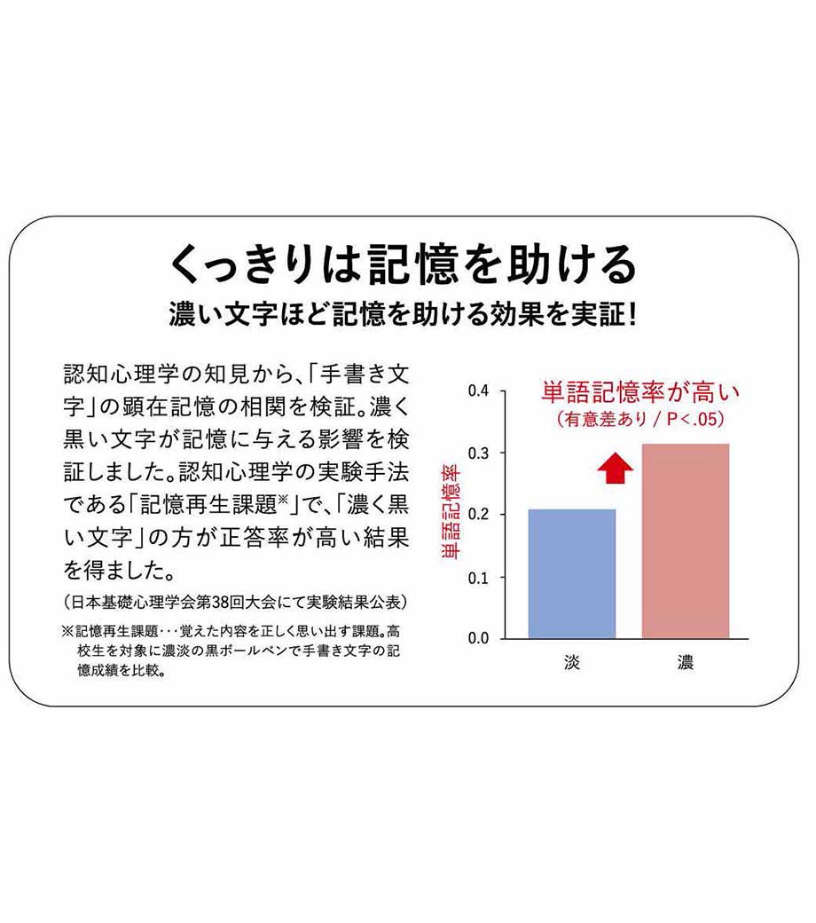 インクは新開発のビーズパック顔料を採用し、にじまず裏抜けしない速乾性があります。濃く、くっきりと筆記できるインクは記憶に残りやすいことが研究により立証されており、暗記学習にもおすすめです。