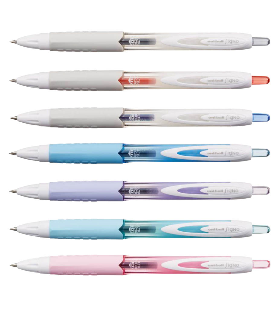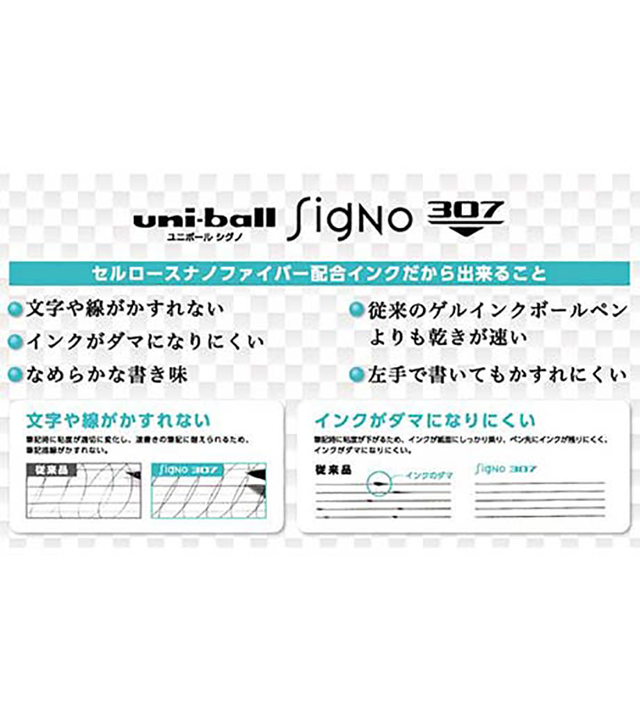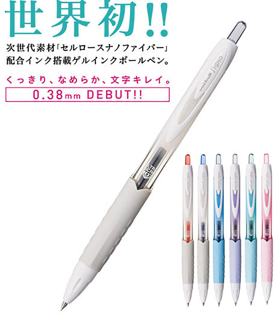 「三菱鉛筆 ユニボール シグノ 307 白軸 0.38mm」は次世代素材「セルロースナノファイバー」を世界で初めて実用化した新開発ゲルインクボールペンです。従来のゲルインクよりも乾きが速く、ペン先にインクが残りにくくダマになりにくいのが特徴。
