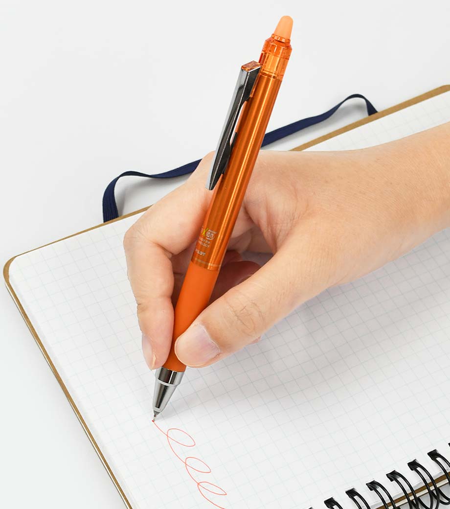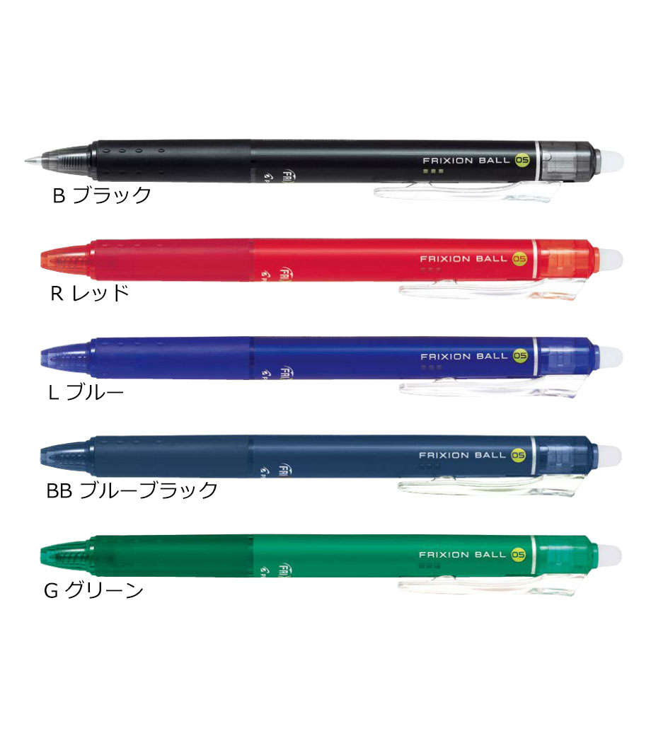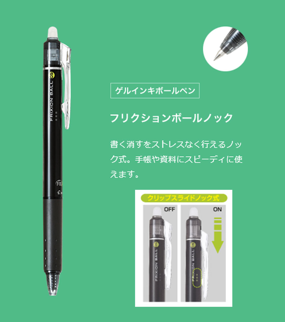 「フリクションボール ノック05」は、世界中で大ヒットのフリクションシリーズがさらに便利になった、ノック式のフリクションボールペン(0.5mmタイプ)です。クリップスライドノック式を採用し、ノック面は大きく、ノックしやすくなっています。ノックすると小窓からインク色がのぞくので、ONとOFFがわかりやすくなっています。