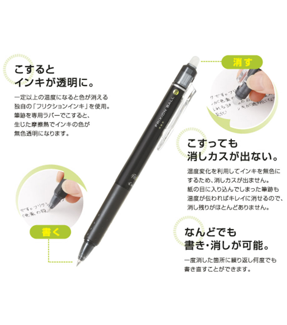 パイロット フリクションボール ノック【バイオマスプラスチック】(0.5mm)は、植物から生まれたバイオプラスチックを使用したフリクションペン。こすると書いた文字が消え何度でも書き直しができます。