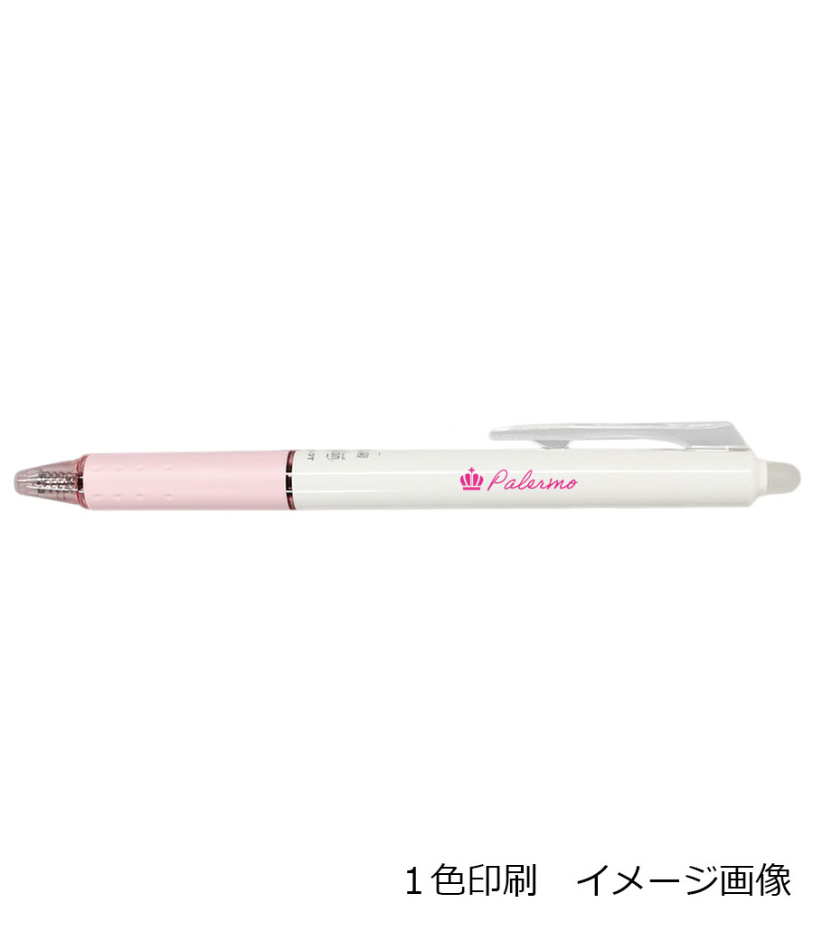 ノック式で手帳など細かい文字も描きやすいペン先0.5mm。印刷部分が目立ちやすい名入れ専用の白軸です。軸に1色・フルカラー印刷ができます。後部の専用ラバーで擦れば筆跡を消せるフリクションペンは大人気のノベルティ。ロゴや企業名を印刷して営業配布用、キャンペーン景品などに選ばれます。