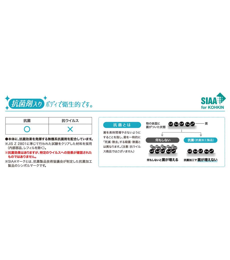 ※抗菌とは、菌を長時間増やさないようにすることを指し、菌を一時的に「死滅・除去」する殺菌・除菌とは異なります。(注意:抗ウイルス商品ではございません)