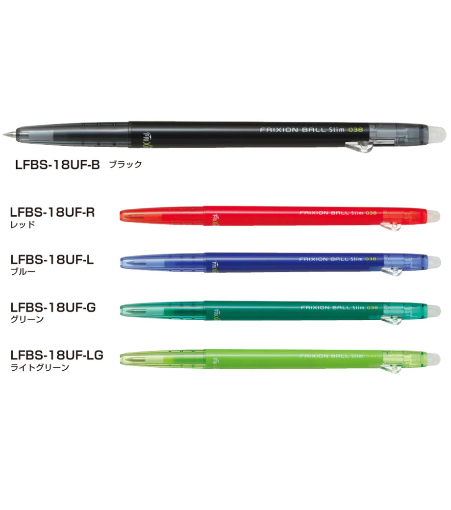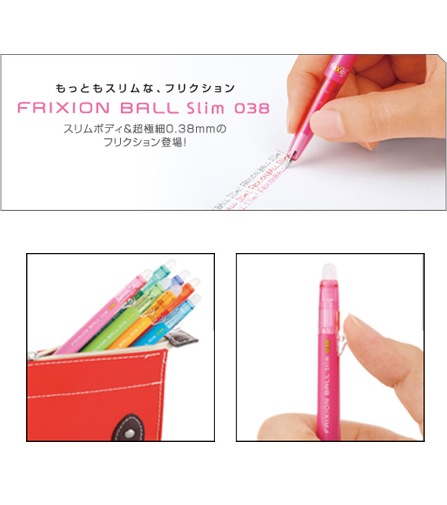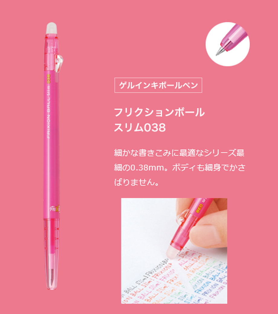 「フリクションボールスリム 038」は世界中で大ヒットのフリクションシリーズの中でも、2013年グッドデザイン賞を受賞した超極細0.38mmタイプです。ゲルインキの中でも最も細く、今まで書きづらかった場所にも、詳細に書き込むことができます。ボディもとてもスリムなので、ペンケースの中で場所を取りません。