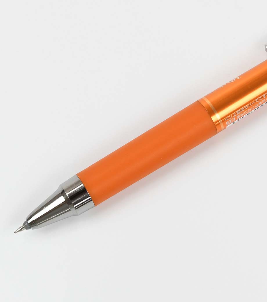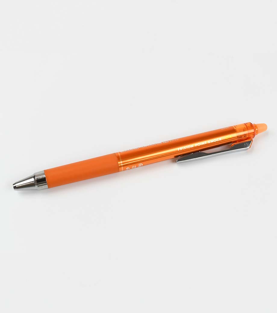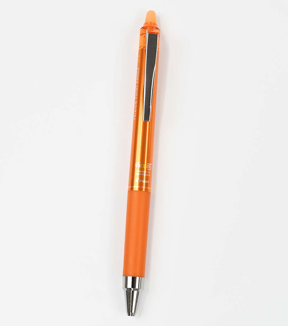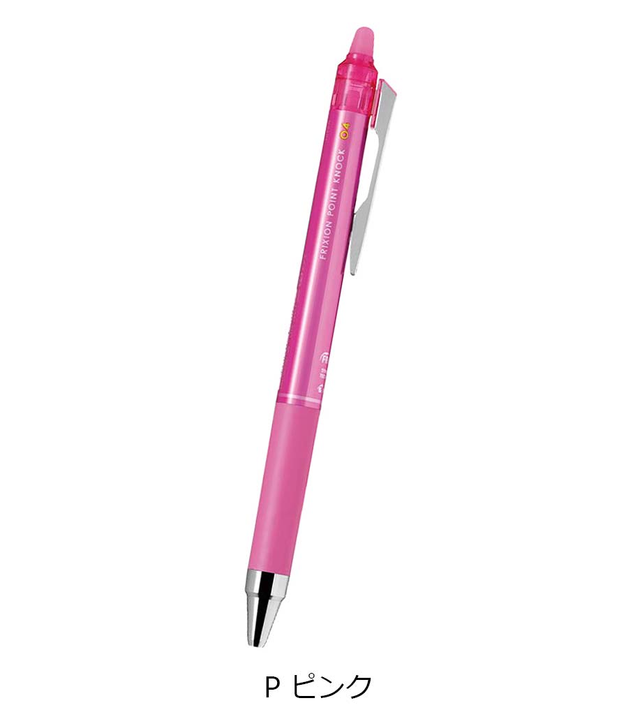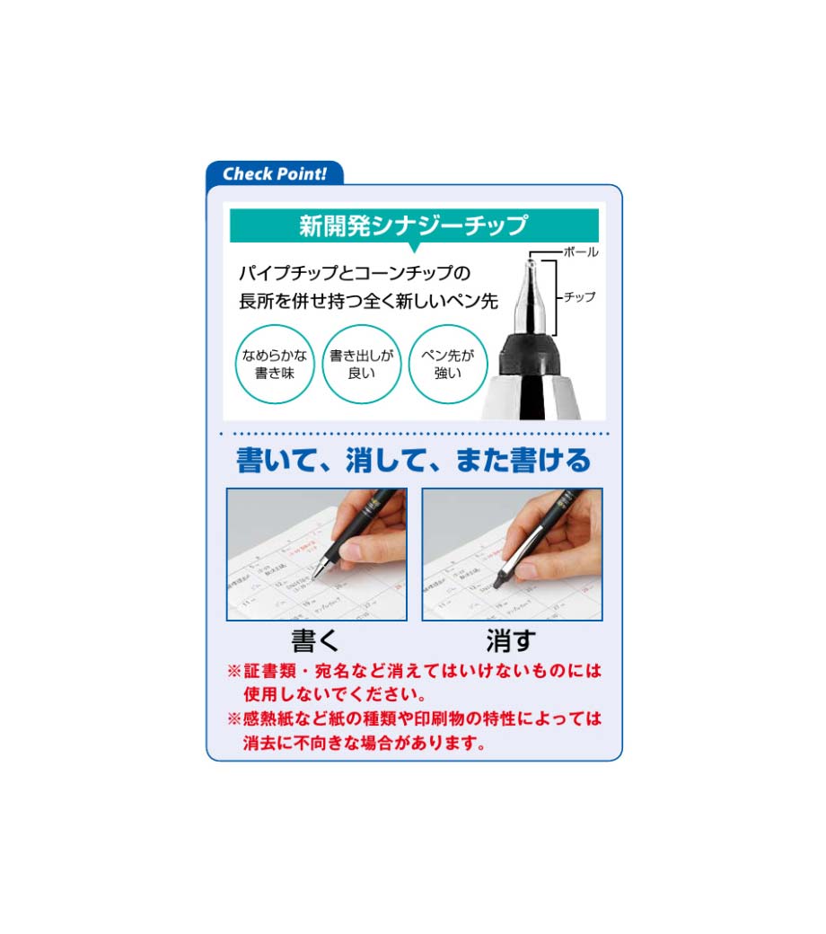 パイロット フリクションポイント ノック04はこすると消えるフリクションと、シナジーチップの特徴を活かしたペンです。シナジーチップとは、細書きに適した「パイプチップ」と、一般的なボールペンに使われる、チップ強度が強く安定して書きやすい「コーンチップ」のそれぞれの長所を併せ持っています。細書きに最適なペン先でありながら、ペン先の強度があり、なめらかな筆記ができます。