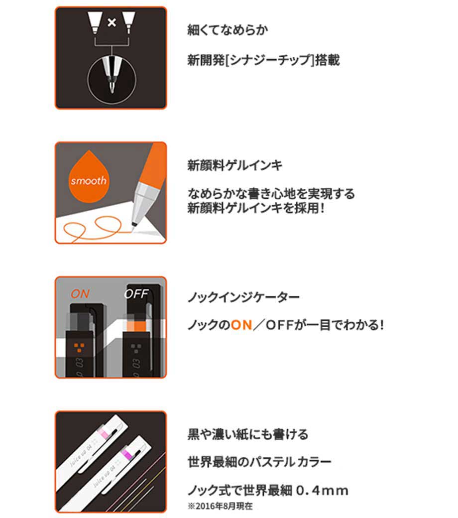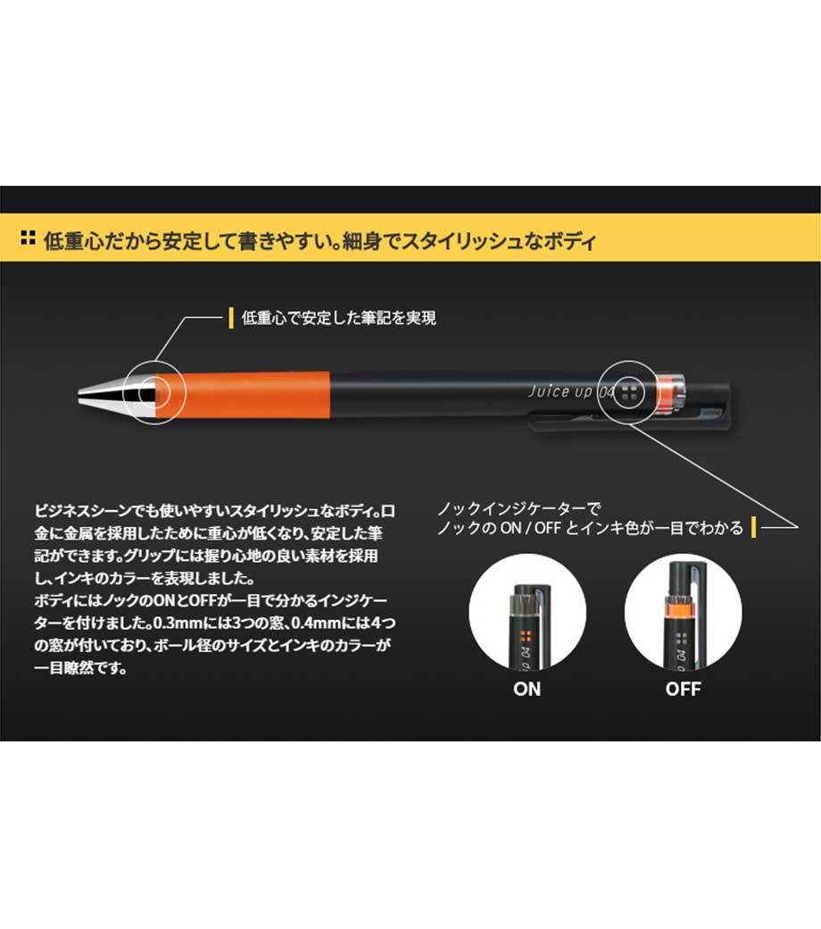 パイロット ジュースアップ04(超極細)は、鮮やかな発色と滑らかな書き心地が特徴のゲルインキボールペン。ペン先は0.4mmと超極細ながら細字をスムーズに書けるので、ノートや書類の行間への書き込みに最適。色数が多く、要点を色分けして記入する時にも大変便利です。インク色とグリップカラーが同色なので、使いたい色が一目瞭然!