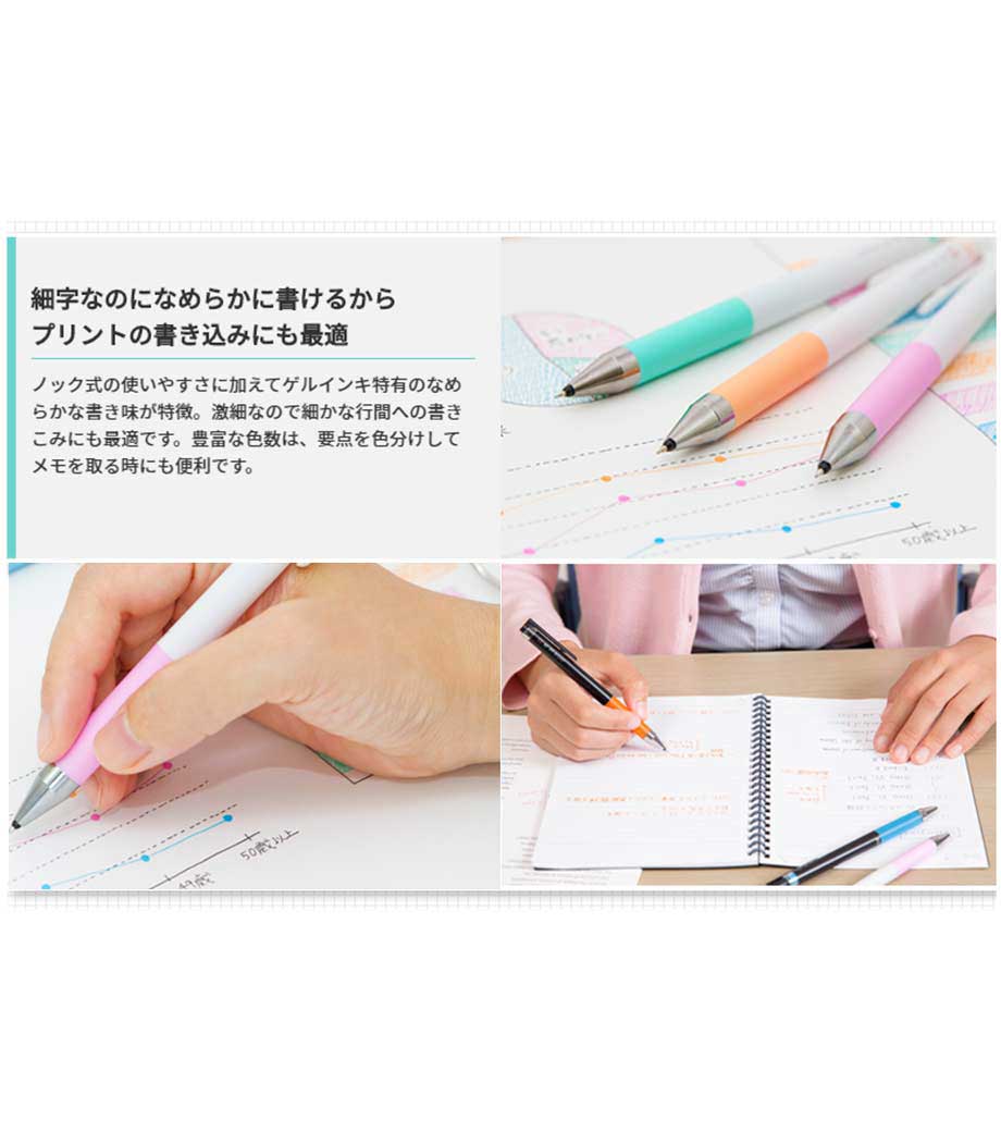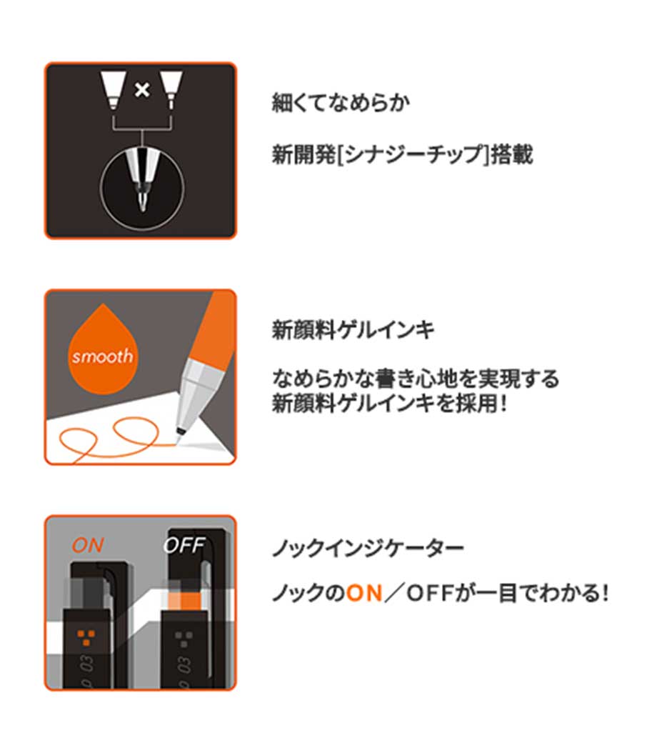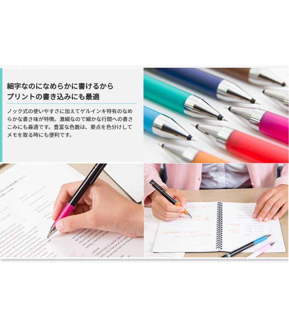 伊勢志摩サミットでは15,000本使われた実績をもち、くっきり・なめらか・文字キレイのゲルボールペン。ペン先は手帳などに記入しやすい0.38mm。キャンペーンやイベント、オープンキャンパスに人気です。