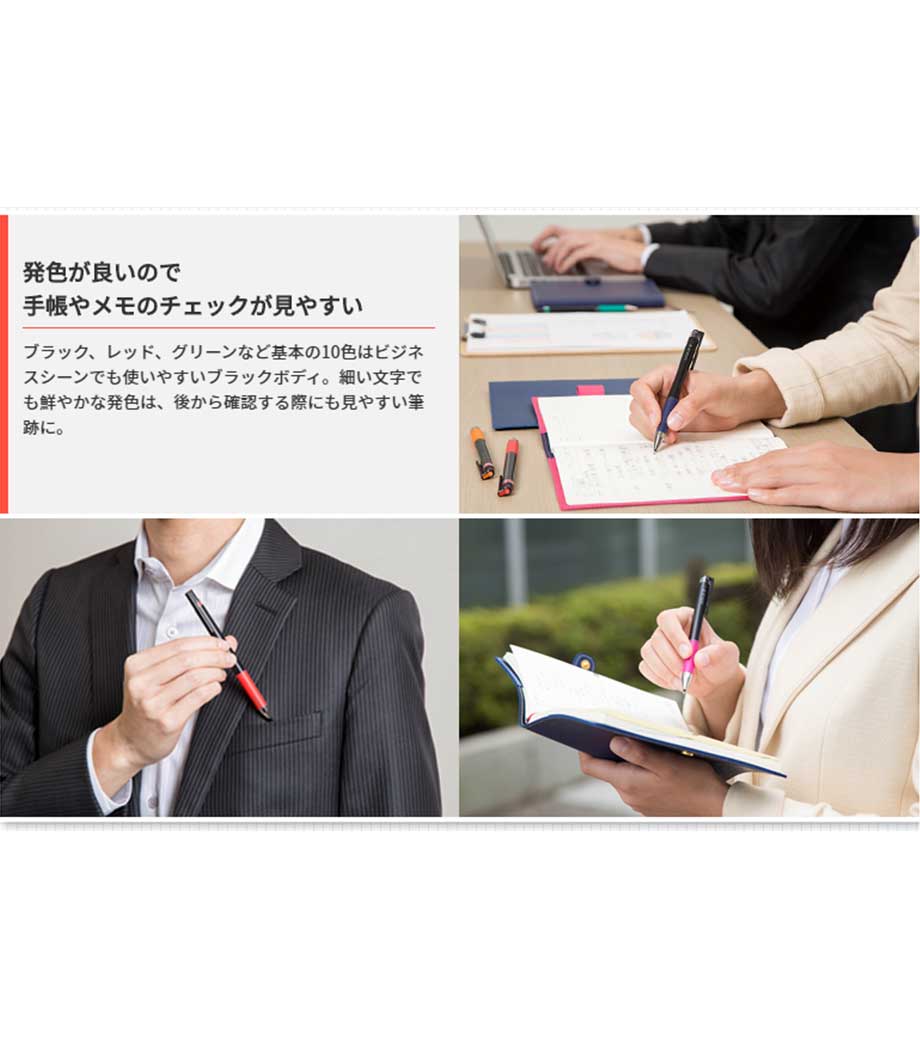 インクは新開発のビーズパック顔料を採用し、にじまず裏抜けしない速乾性。くっきりと色が出るので、見やすさが際立ちます。濃く、くっきりと筆記できる黒インクは記憶に残りやすいことが研究により立証されており、暗記学習にもおすすめです。