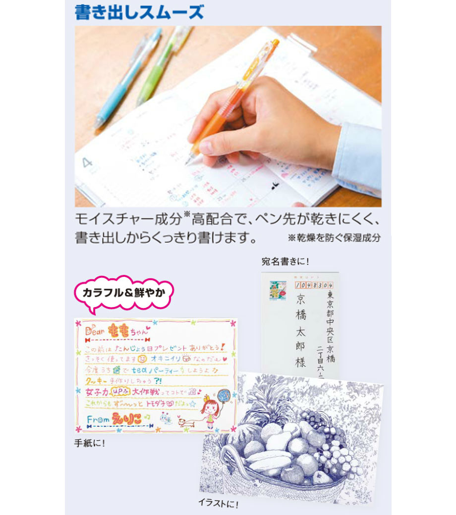 サラサの書き心地の秘密はジェルインクにあります。書いている人の筆圧を無意識に下げて、軽い力で書けて、より一層心地よい書き味を生み出しています。顔料インクのため耐水性、耐光性に優れているので、公式文書にも使用できます。