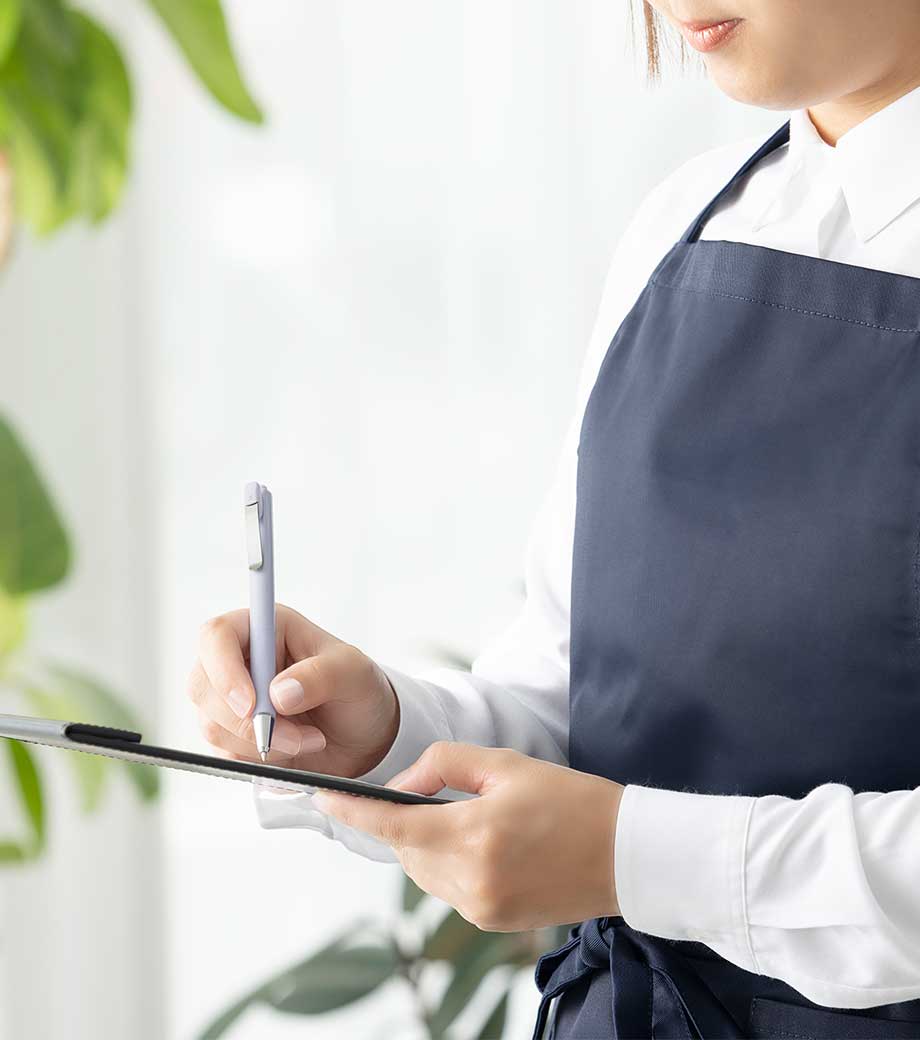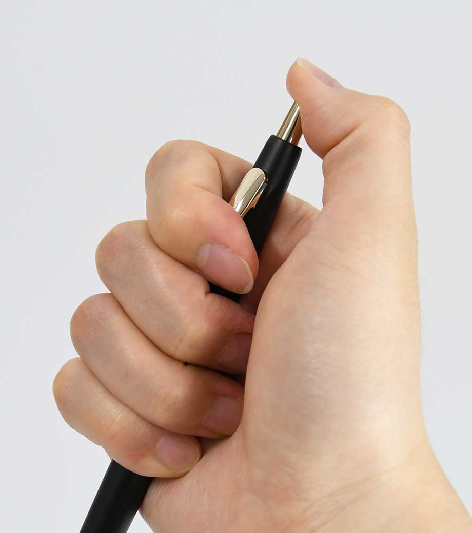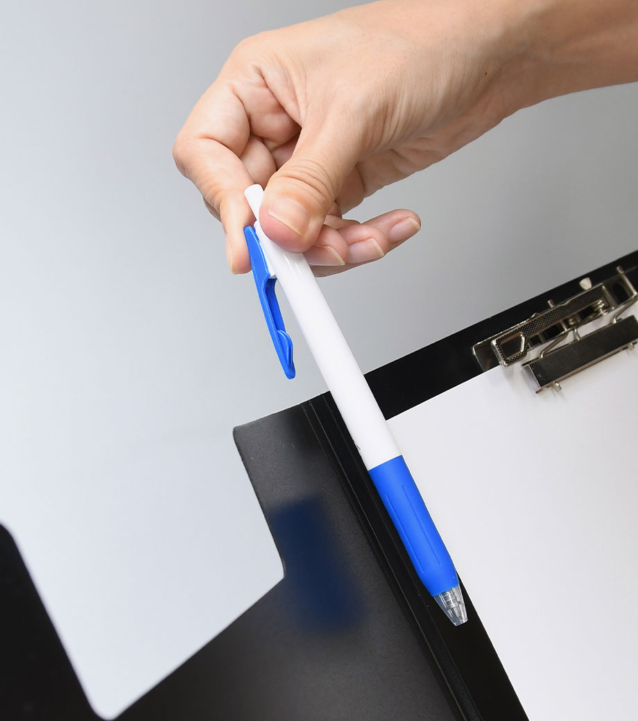 軽い力でもブレずに濃い文字が書ける、ペン先0.7mmの油性ボールペン。接客時など立ったままの筆記に重宝します。丈夫でスタイリッシュな金属クリップ。可動部にスプリング搭載してあるので軽い力で挟みやすく、薄いのでノートに挟んでもスッキリ納まります。
