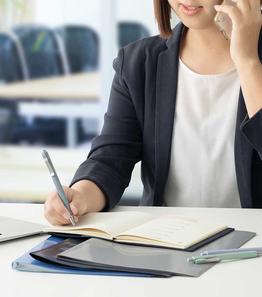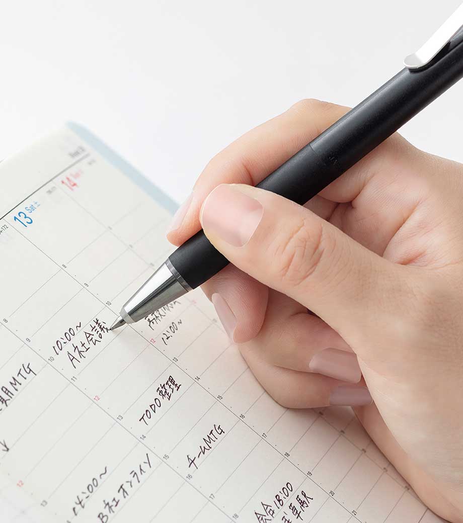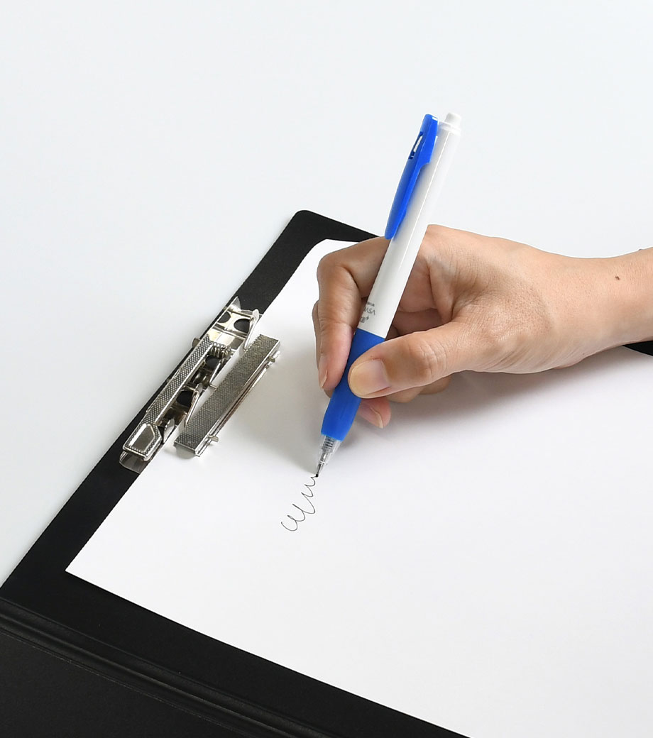 移動中や接客時など不安定な場所でもブレにくく読みやすい文字が書ける、ペン先0.5mmの油性ボールペンです。丈夫でスタイリッシュな金属クリップ。可動部にスプリング搭載してあるので軽い力で挟みやすく、薄いのでノートに挟んでもスッキリ納まります。