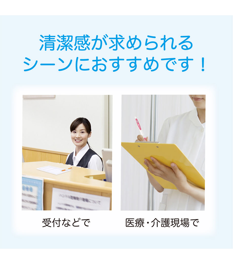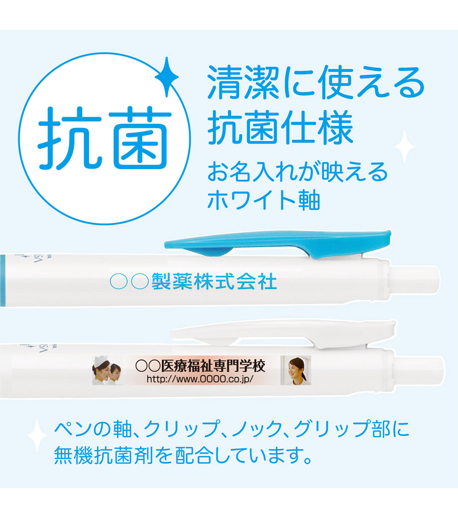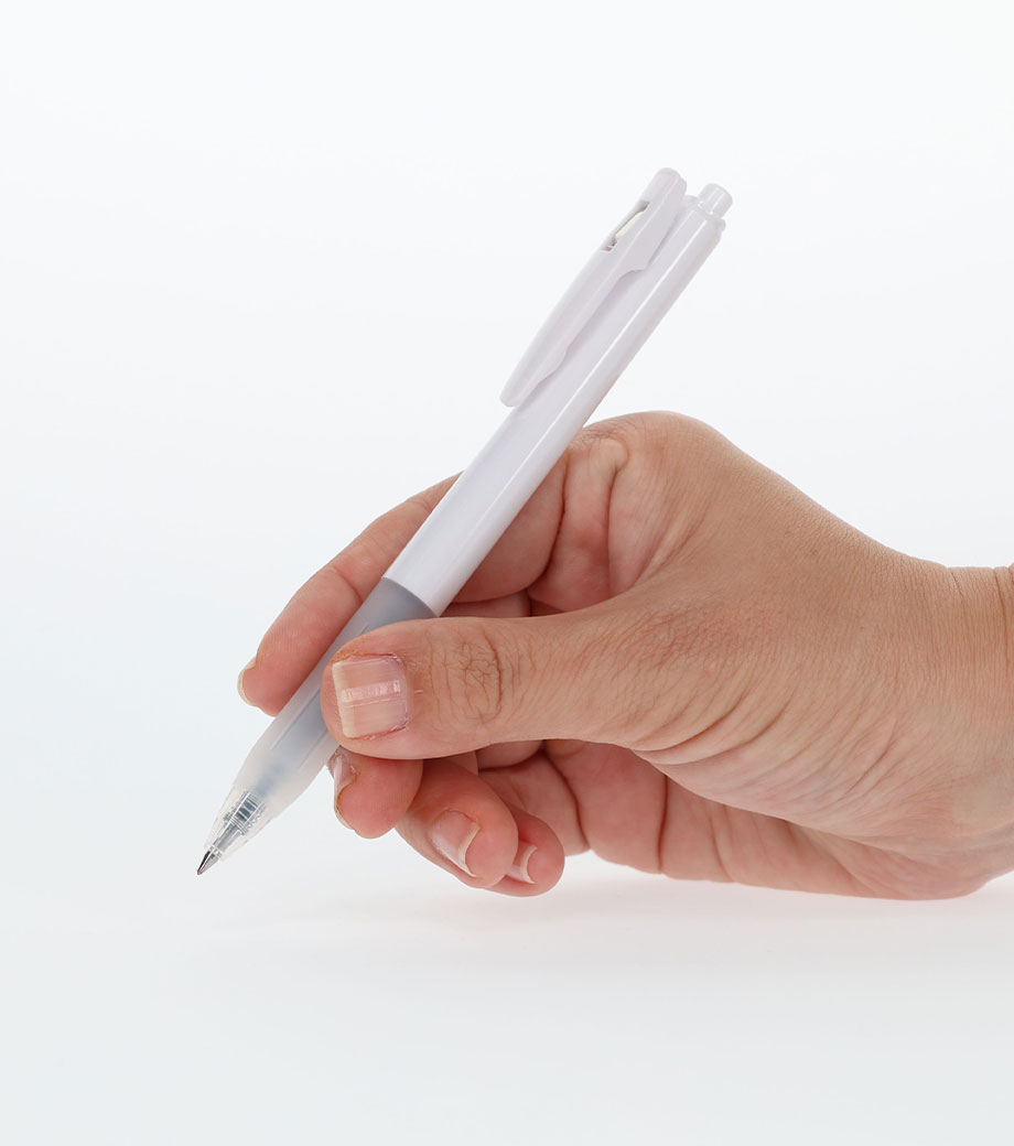 名入れが映える白軸にパステルカラーのグリップが優しい印象を与えます。清潔感や安心感が求められる病院など医療機関のノベルティにオススメ。軸等に再生材を使用しているので、環境にも優しいボールペンです。