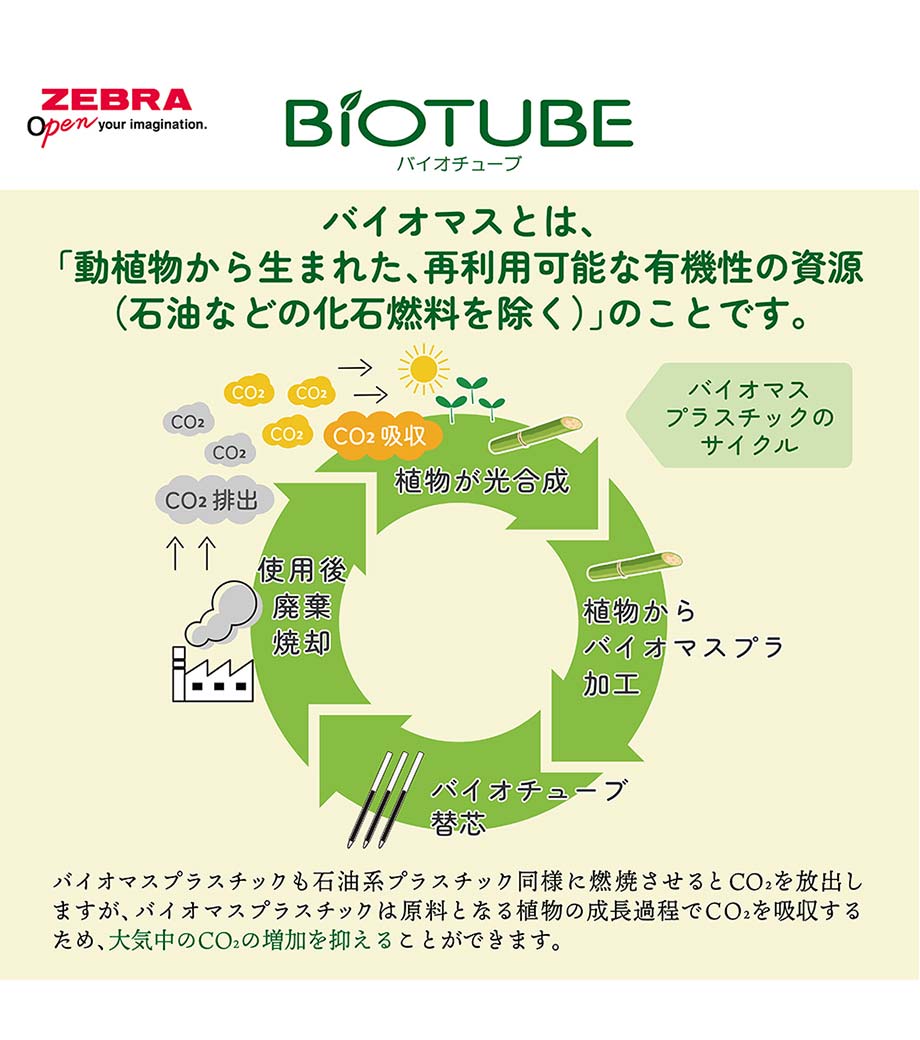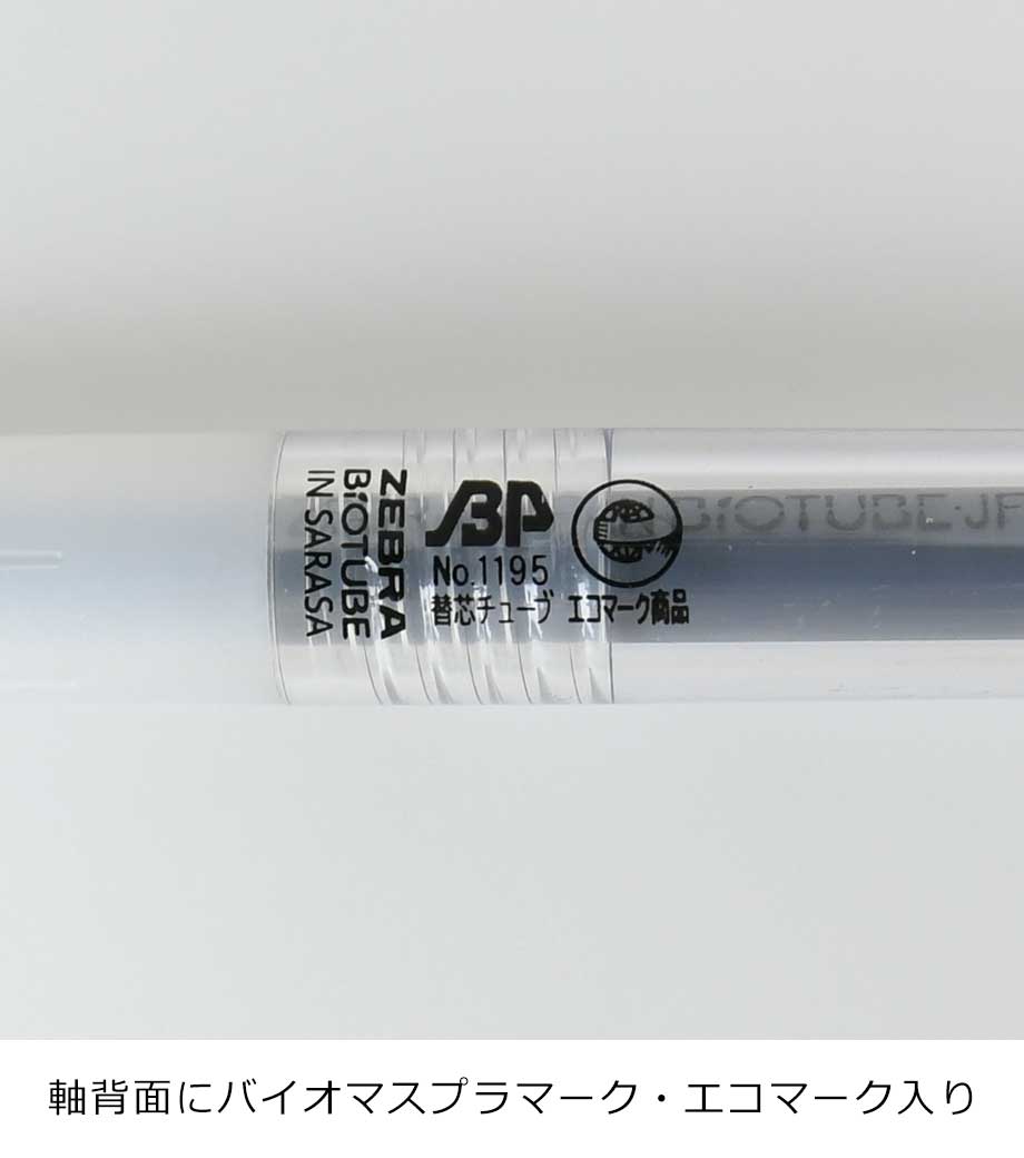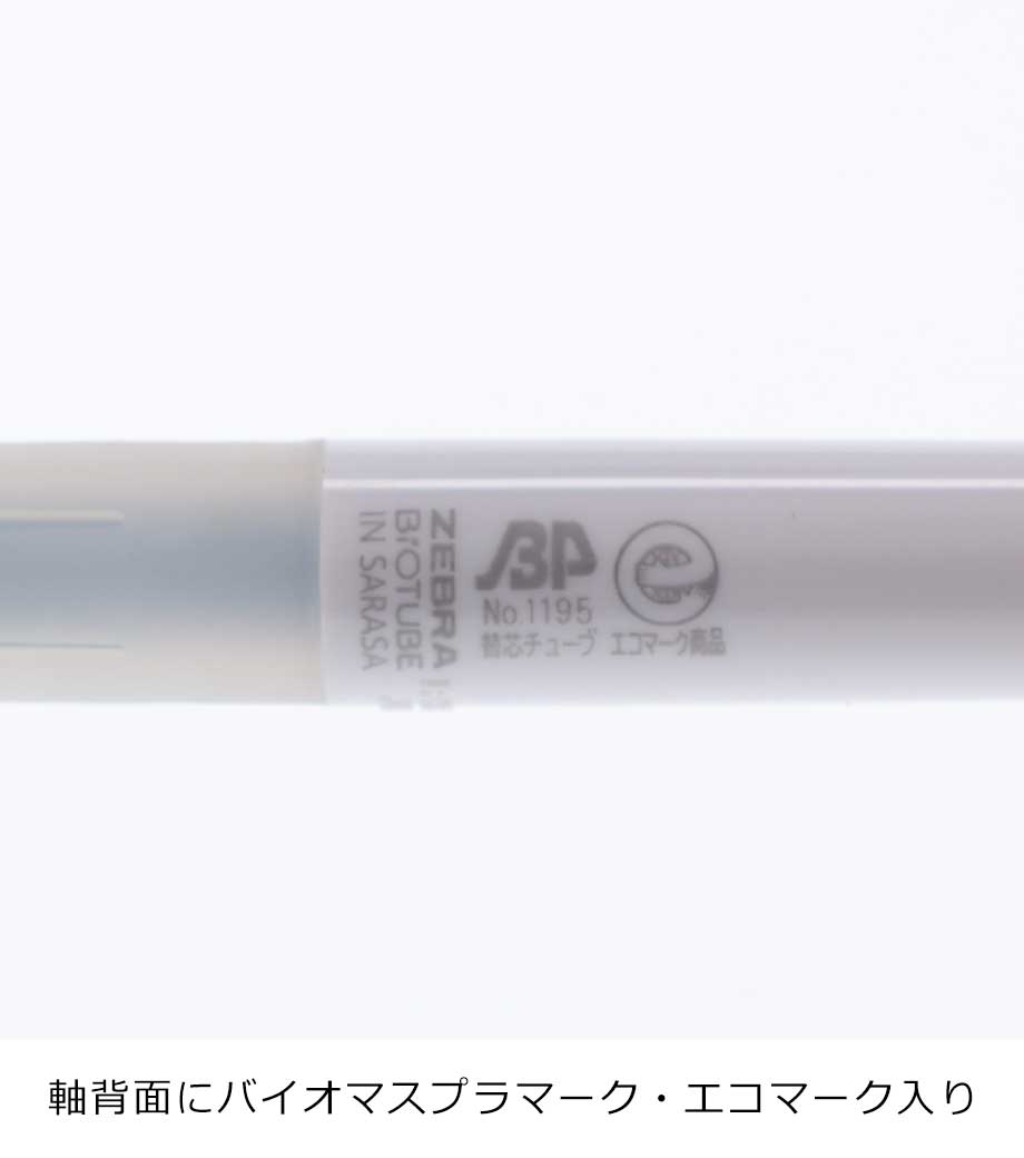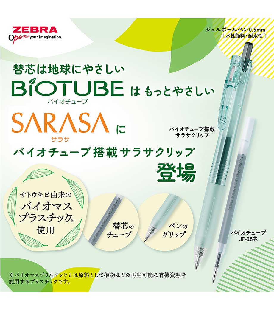 ゼブラの人気シリーズ「サラサ」に、環境に配慮したバイオチューブ搭載モデルが登場。中芯チューブとグリップにサトウキビ由来のバイオマスプラスチックを使用し、CO2排出量を抑えたエコ商品です。サラッとした書き心地はそのままに、地球にもやさしい1本。クリアボディが爽やかで、学生からビジネスパーソンまで幅広く使える定番アイテムです。