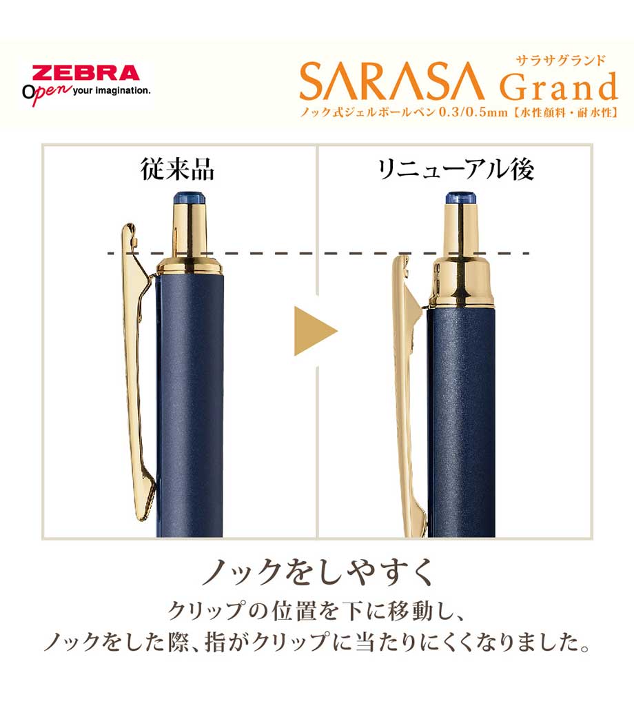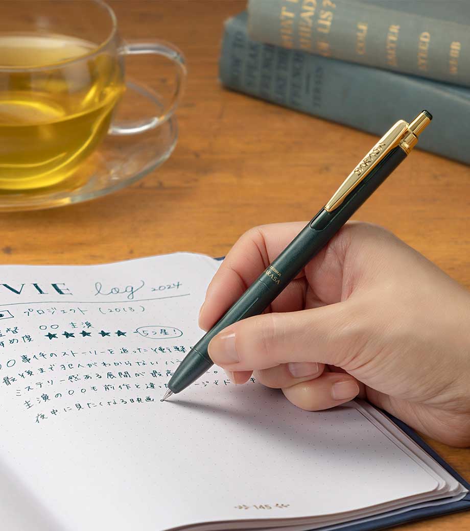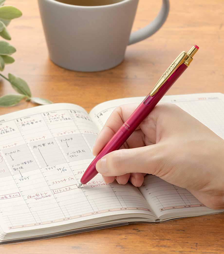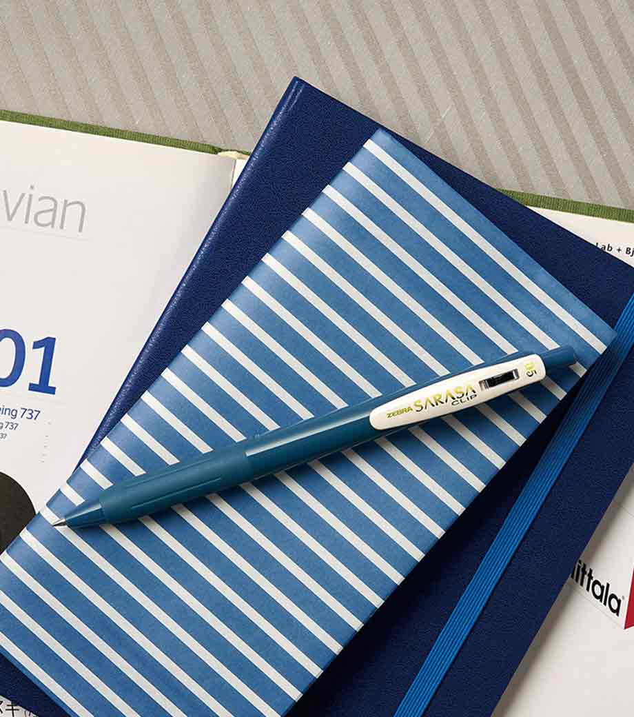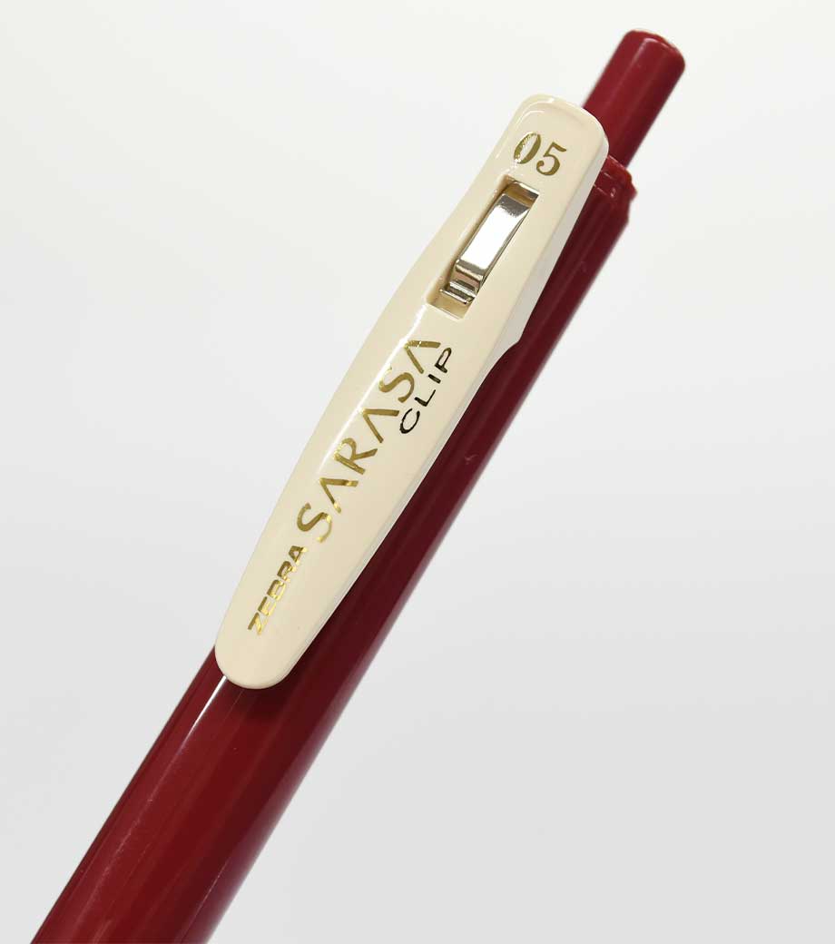 手帳にも書き込みやすいペン先0.3mmのジェルインクボールペンです。耐久性にも優れさらさらと書きやすく、ビンテージカラーは万年筆のインクのように落ち着いたシックな色合いです。サラサクリップのアイコンである挟みやすいバインダークリップは金属製。ノックする時に指が当たらないよう工夫され、会議や商談の場でも使いやすい静かなノック音です。