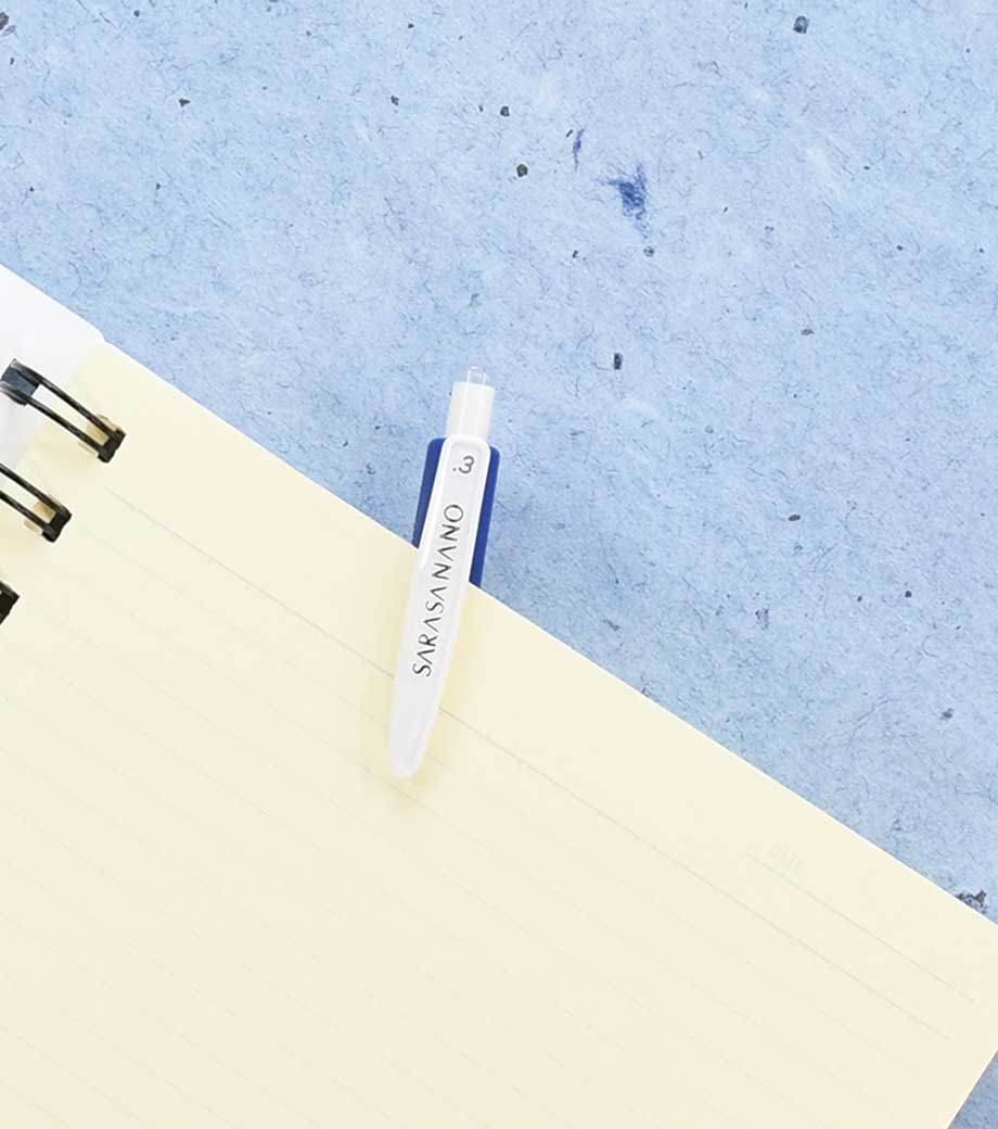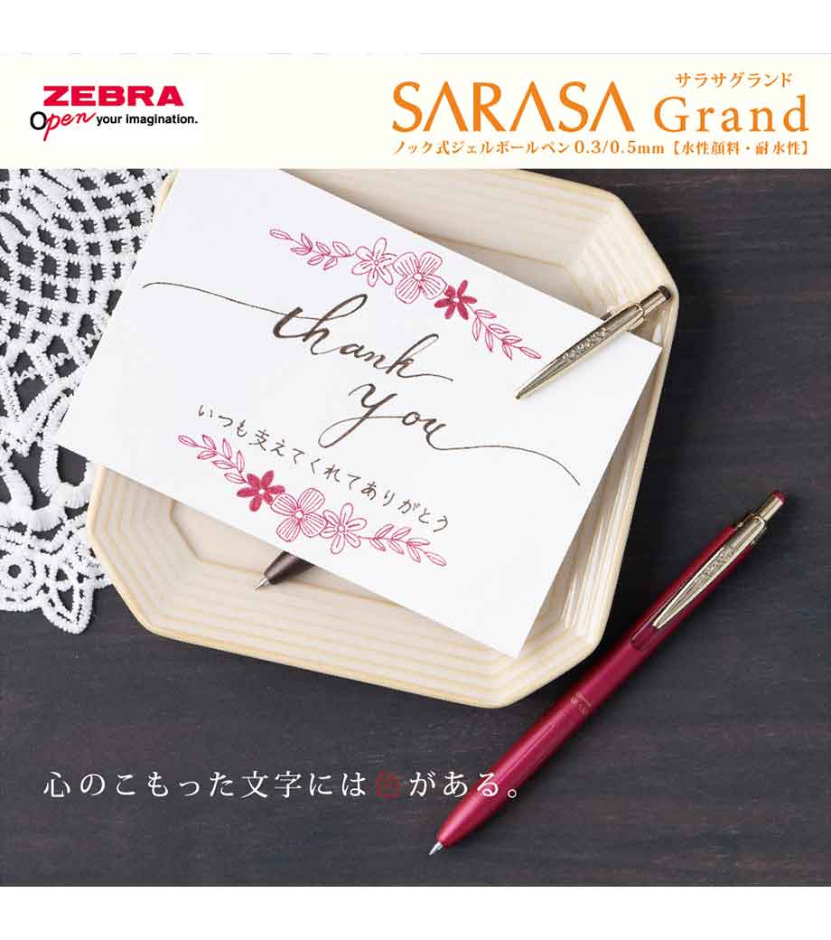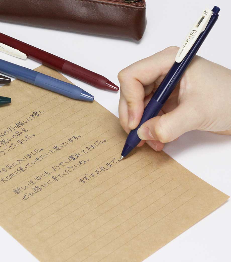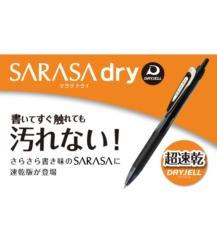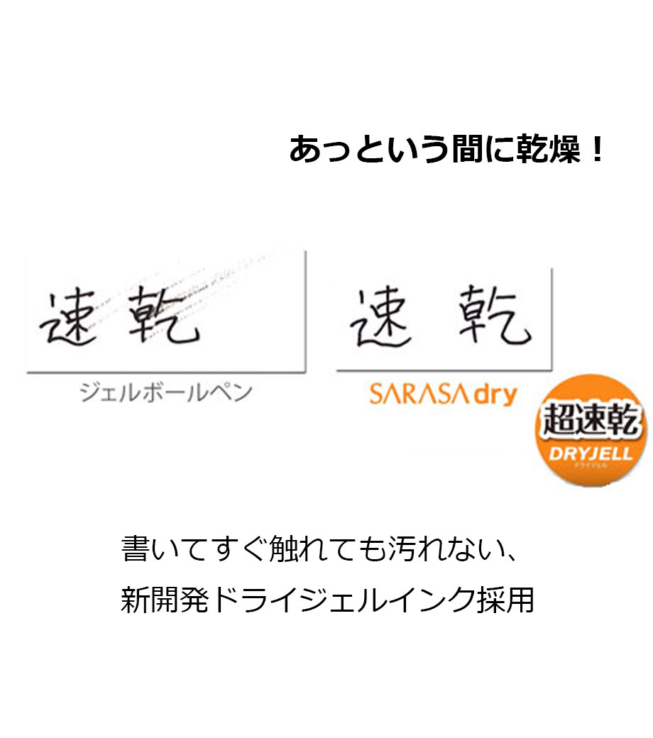 サラサの書き心地の秘密はジェルインクにあります。書いている人の筆圧を無意識に下げて、軽い力で書けて、より一層心地よい書き味を生み出しています。顔料インクのため耐水性、耐光性に優れているので、公式文書にも使用できます。