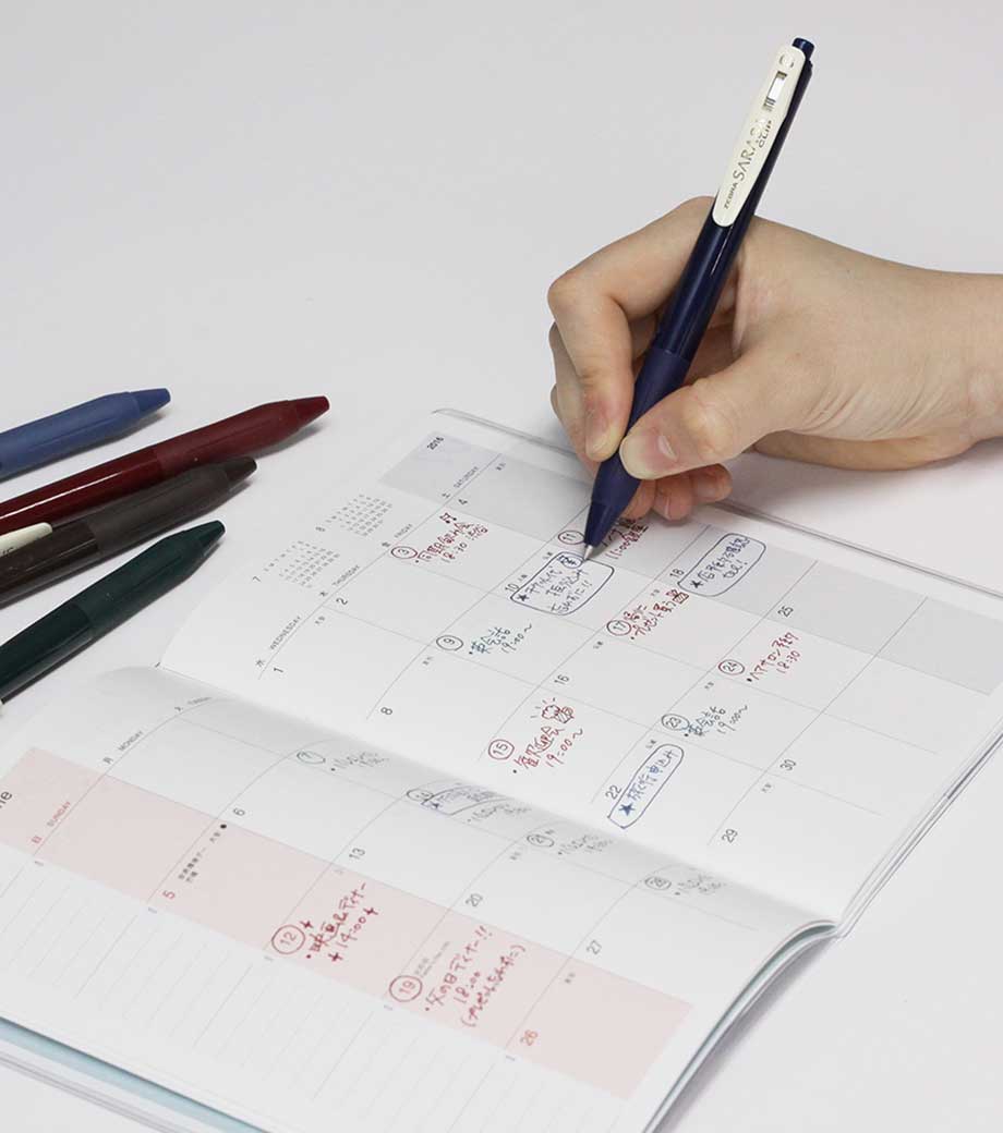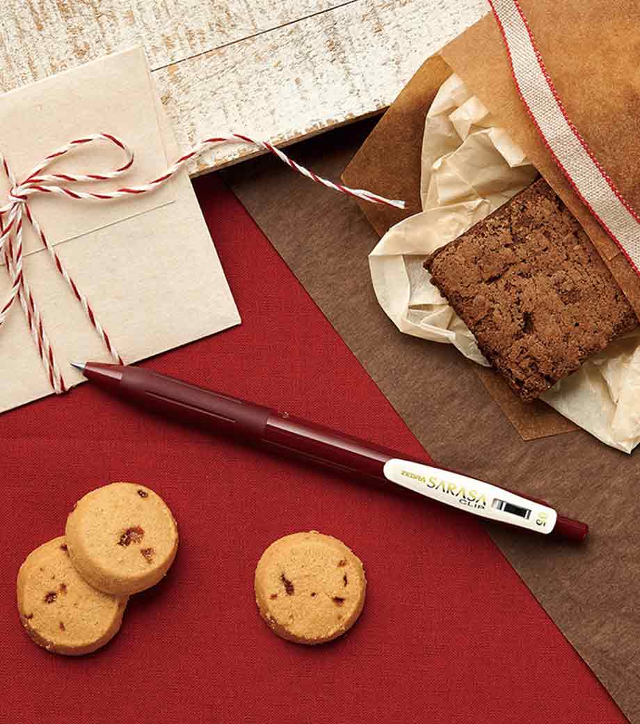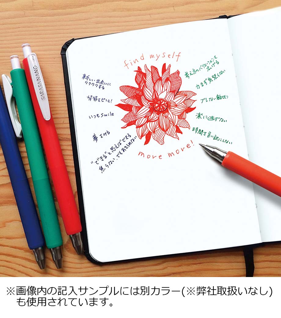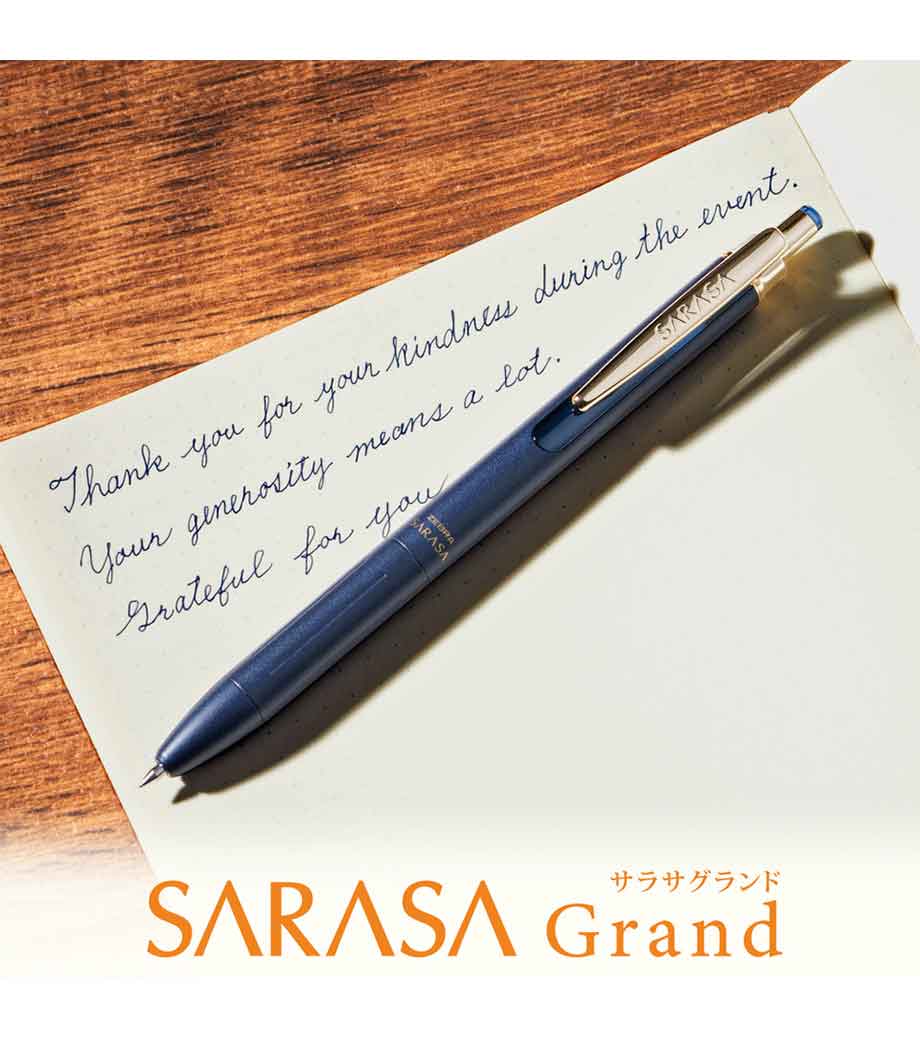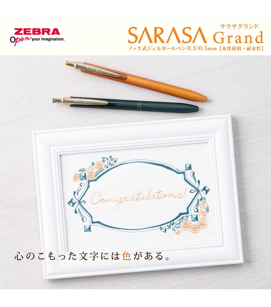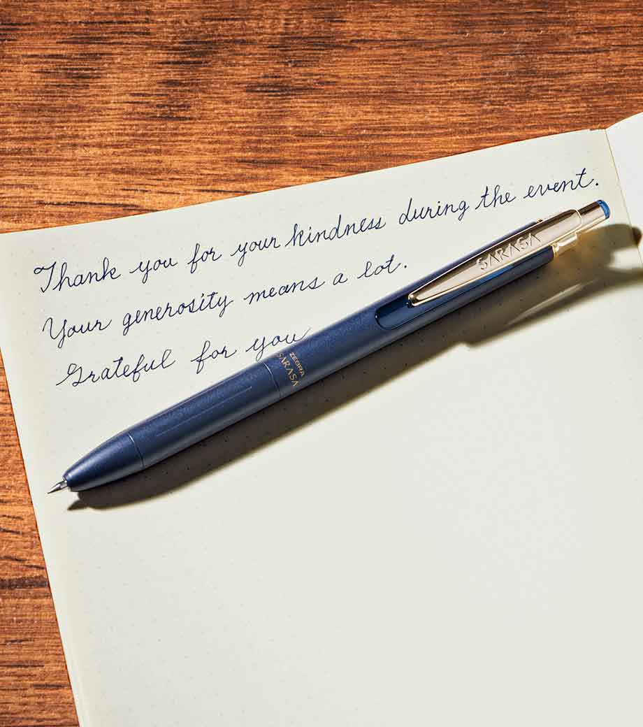 サラサの書き心地の秘密はジェルインクにあります。書いている人の筆圧を無意識に下げて、軽い力で書けて、より一層心地よい書き味を生み出しています。顔料インクのため耐水性、耐光性に優れているので、公式文書にも使用できます。
