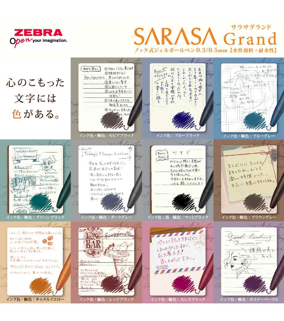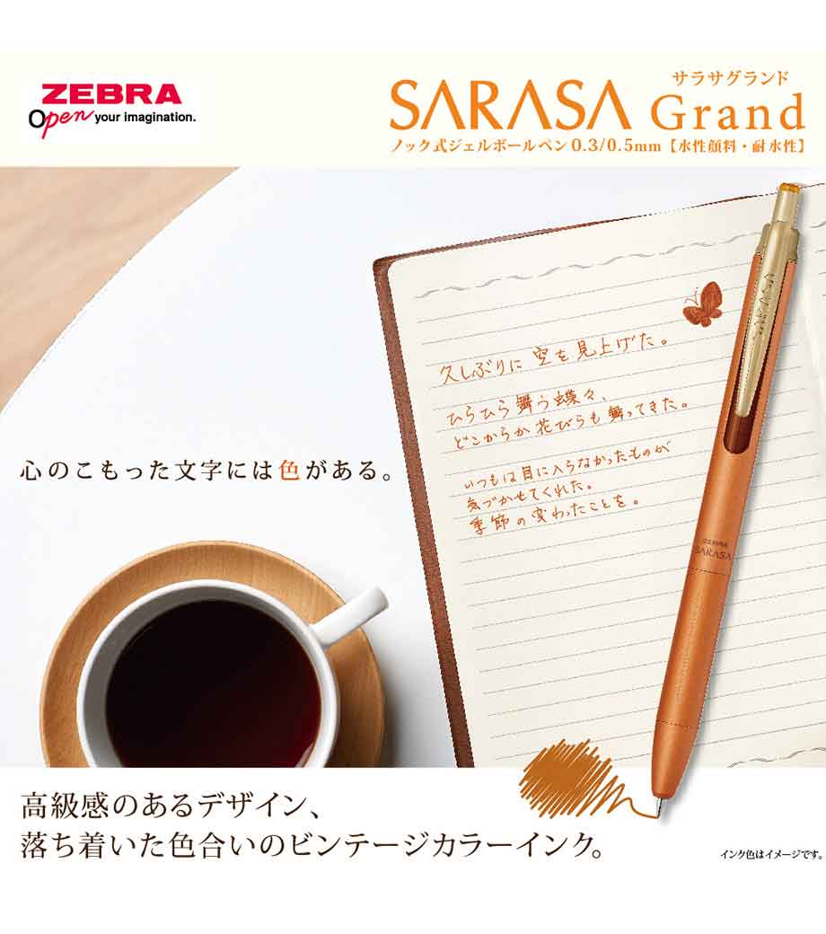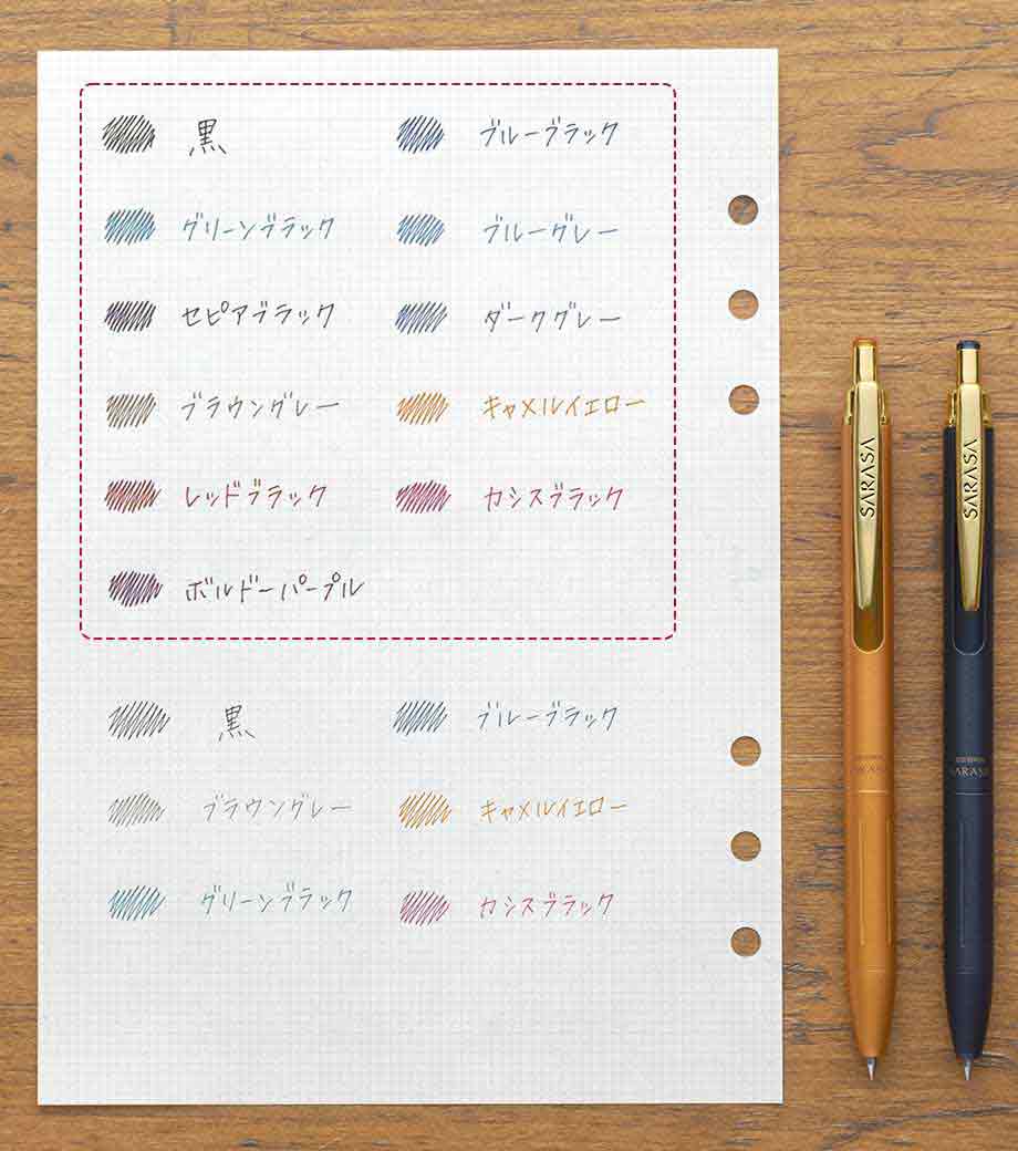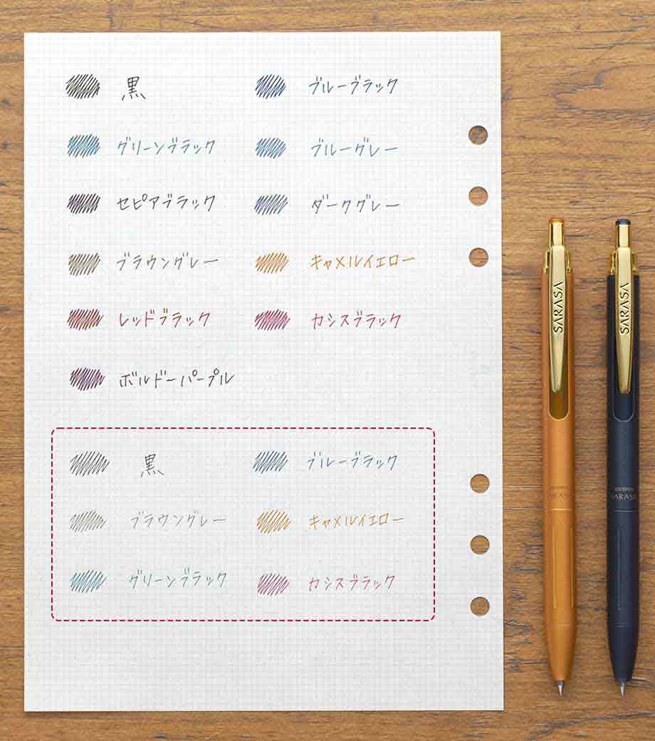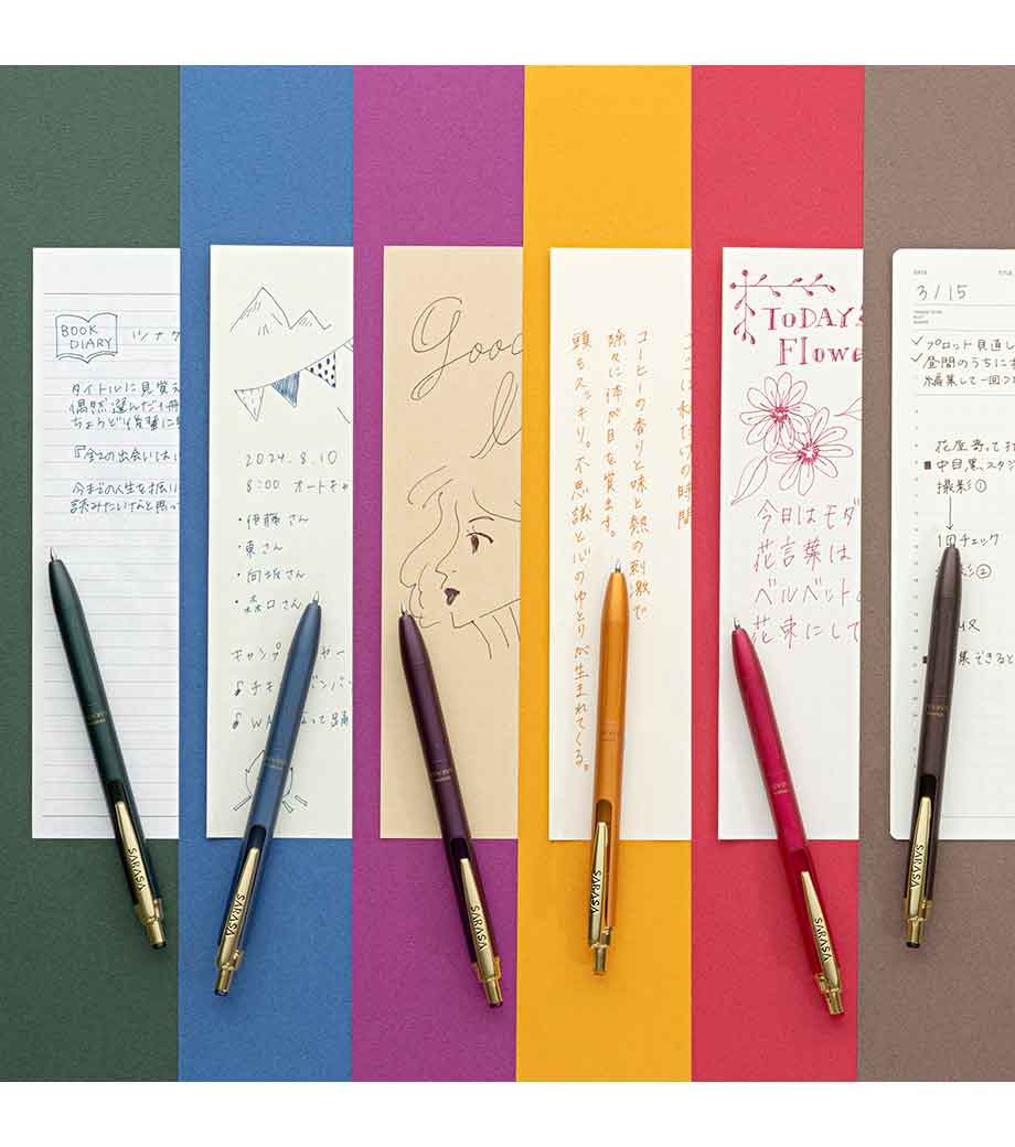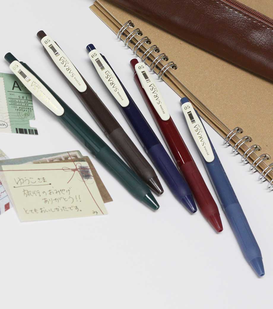 ゼブラ サラサクリップ0.5 ビンテージカラー 0.5mmは、落ち着きのある珍しい色合いのインクが楽しめます。普通の黒や赤のボールペンじゃ物足りないけど、カラフルなペンは子どもっぽくて使いにくい─そんな方におすすめしたい、絶妙な渋みカラーばかりです。軽やかな書き心地ながらくっきりした文字が書けるジェルインクで、ノートやメモへの書き込みも快適!