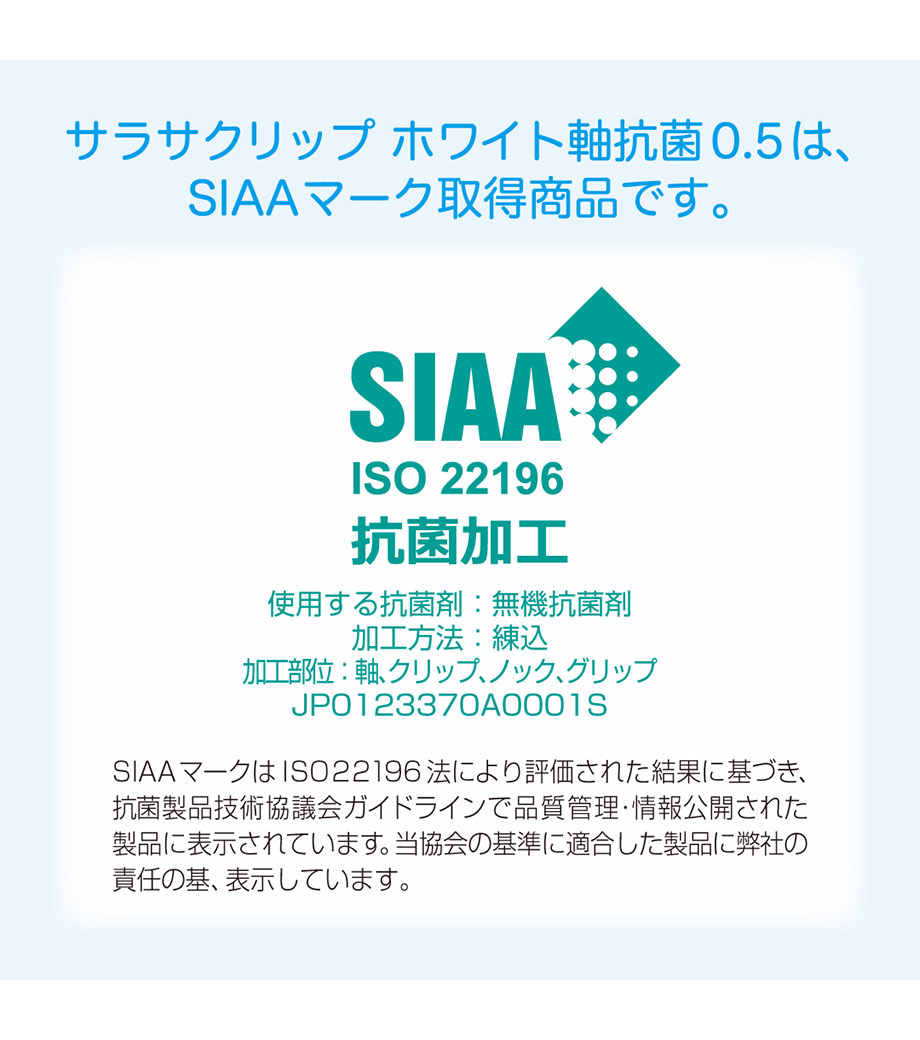 ゼブラ サラサクリップ ホワイト軸 抗菌 0.5【名入れ専用】は、抗菌仕様のノック式ジェルボールペンです。ペンの軸、クリップ、ノック、グリップ部に無機抗菌剤配合。細菌の増殖を抑制します。ZEBRAの大ヒット商品サラサクリップ。伸びやかでさらさらとした書き心地が特徴です。また可動式バインダークリップは厚みのあるボード等にもはさむことができ便利です。