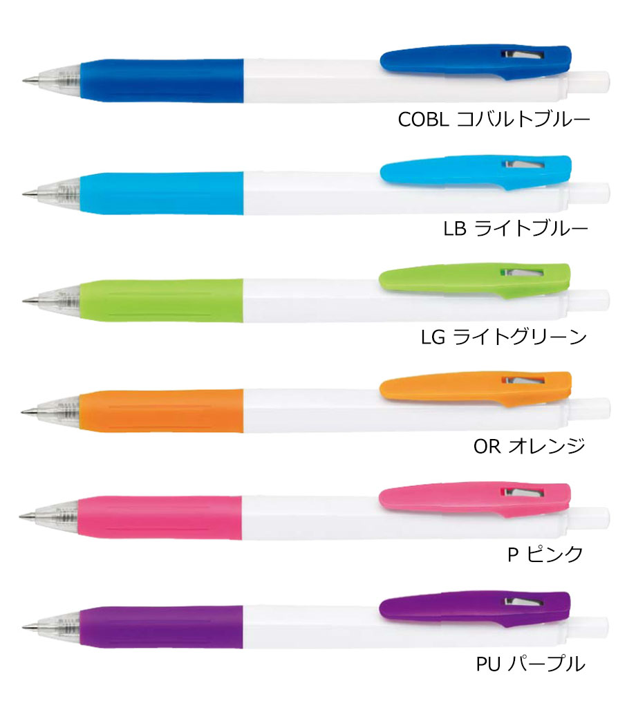白軸とクリップ部に印刷が可能。ばらまきノベルティとしても定番のボールペン。カラフルなグリップ色でコーポレートカラーに合わせたオリジナルグッズが作れます。