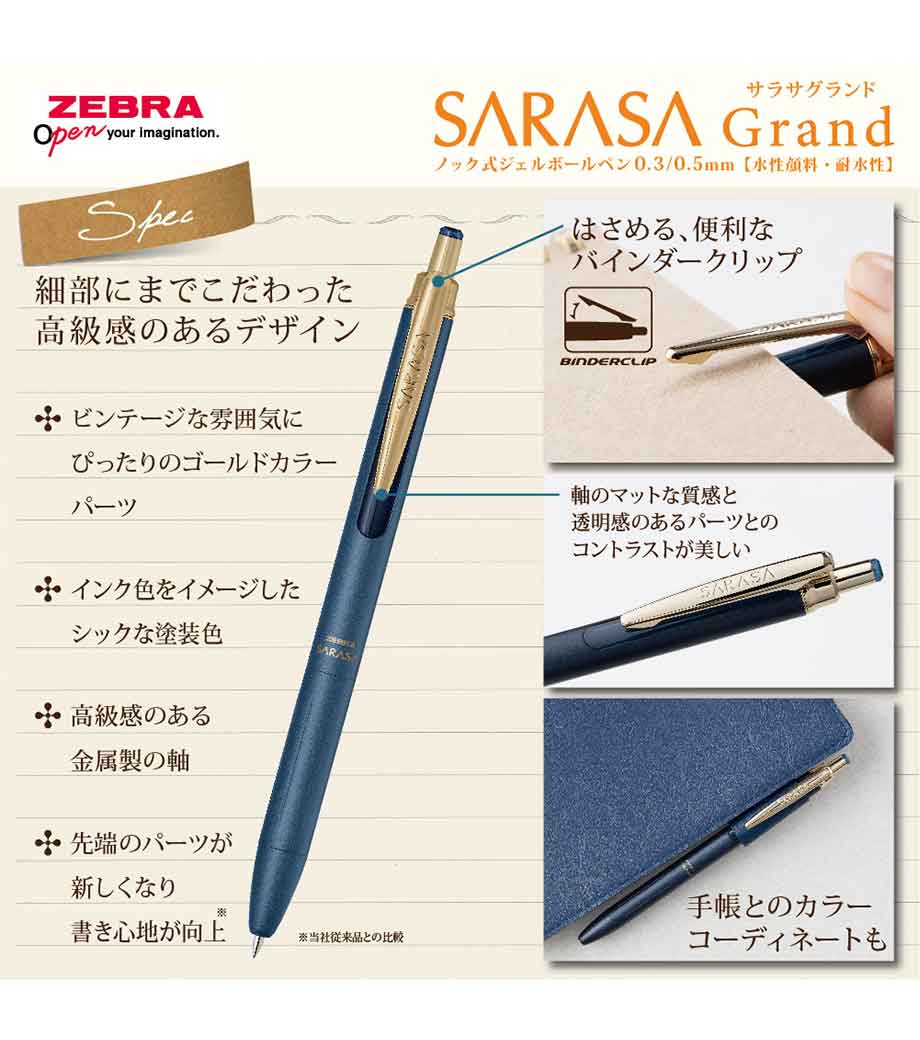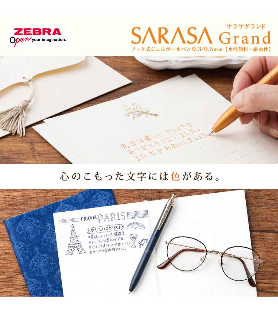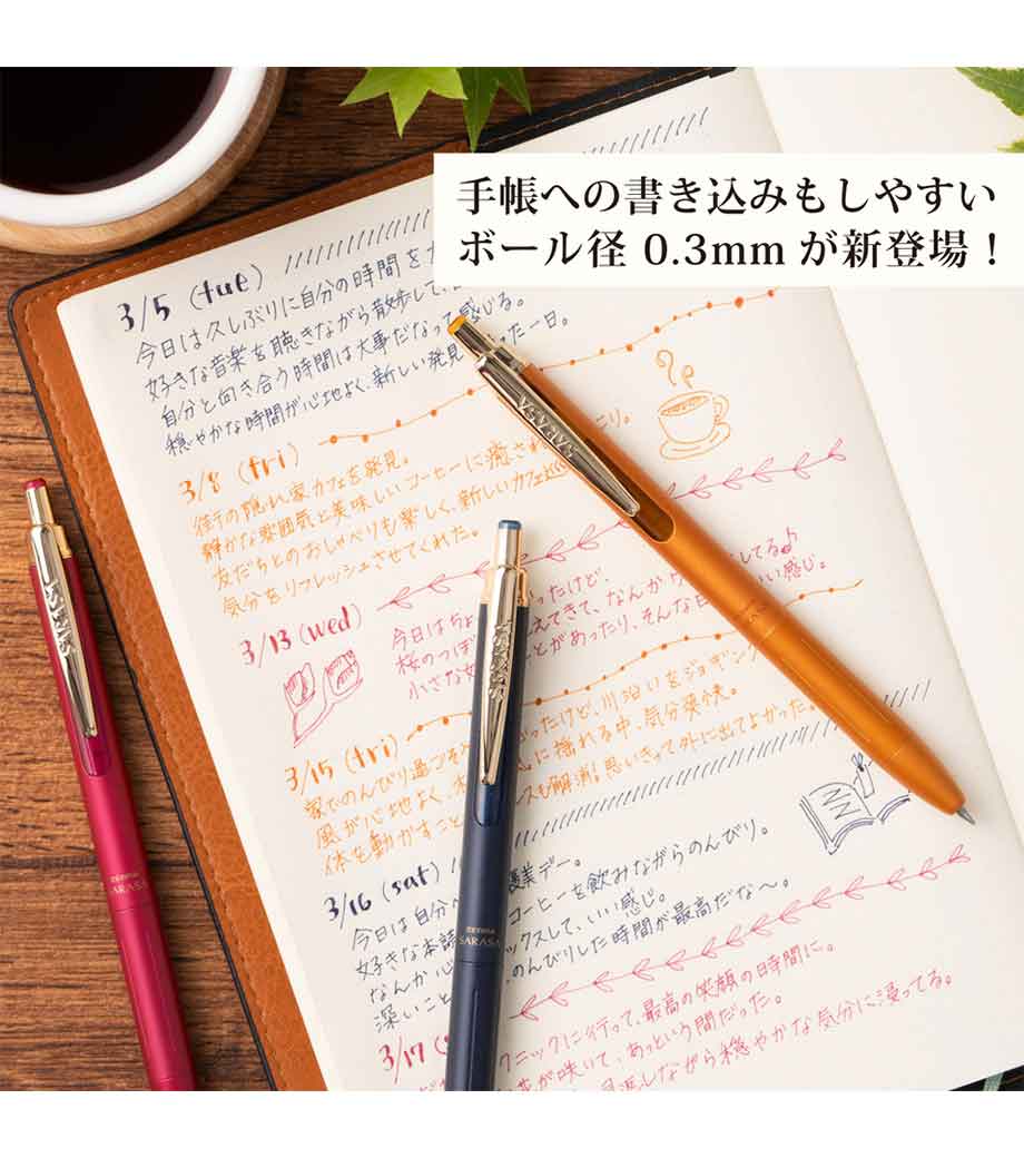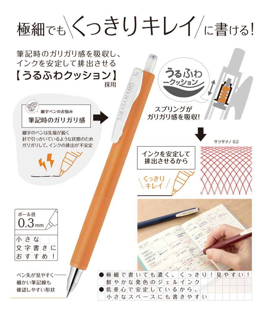 ゼブラ サラサナノ 0.3は極細のペン先でもくっきりキレイに書けるジェルインクボールペン。軸の内側にあるスプリングが、小さな字を書く時の紙をガリガリと削るような書き味を解消!口金が金属でペン先が重く、低重心なので安定感のある筆記ができます。さらに握りやすいラバーグリップ付き。インクの乾きが早く、スケジュール手帳への書き込みにも最適です。