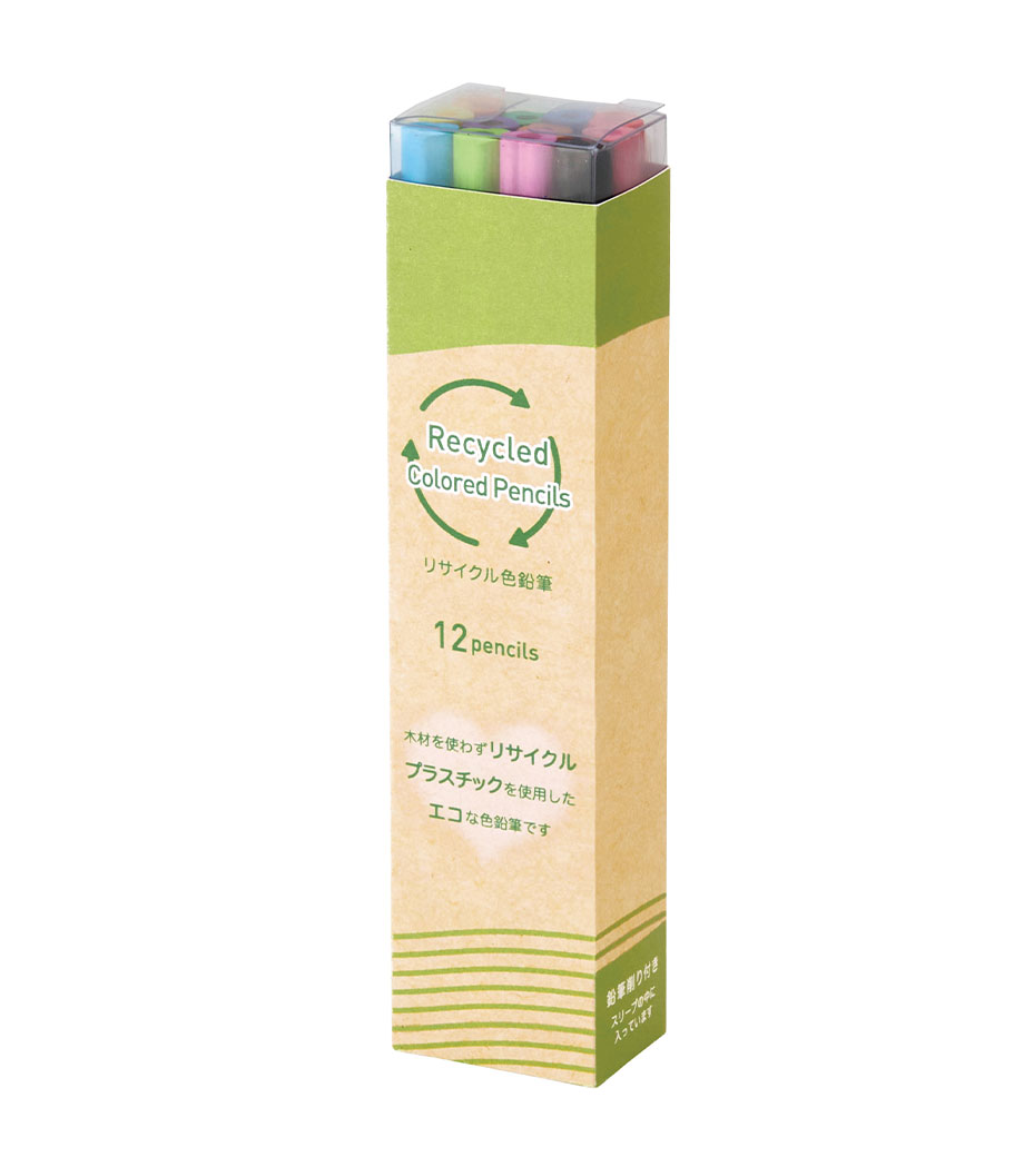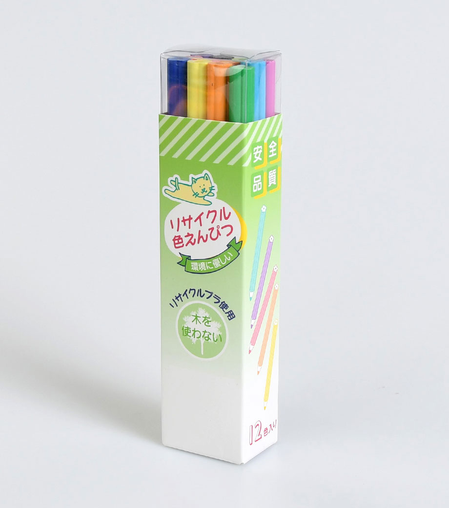 森林資源を守りながら、廃プラスチックの再利用でごみ削減にも貢献できる新しいタイプの色鉛筆。陳列しやすい紙スリーブ付クリアケース入り。鉛筆削りはスリーブケース内下部に入っています。キッズ向けイベントでの配布ノベルティなどにいかがでしょうか。