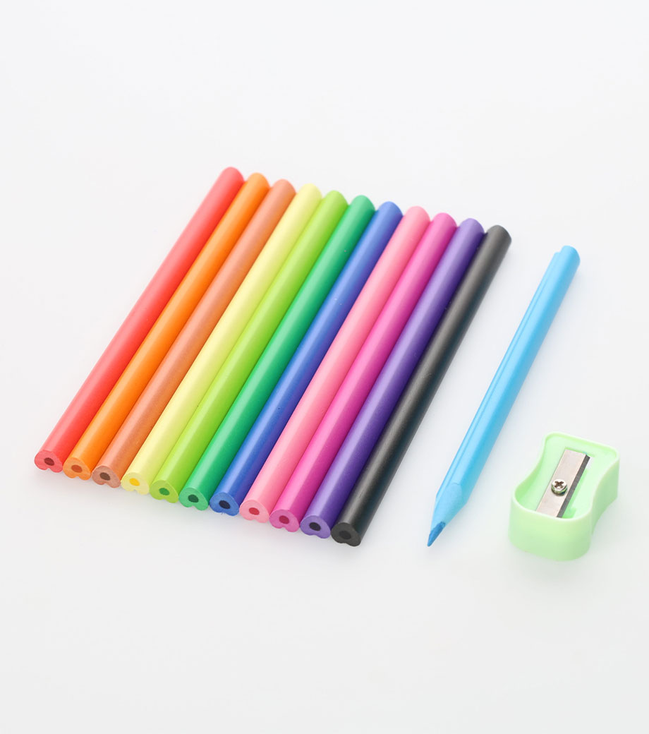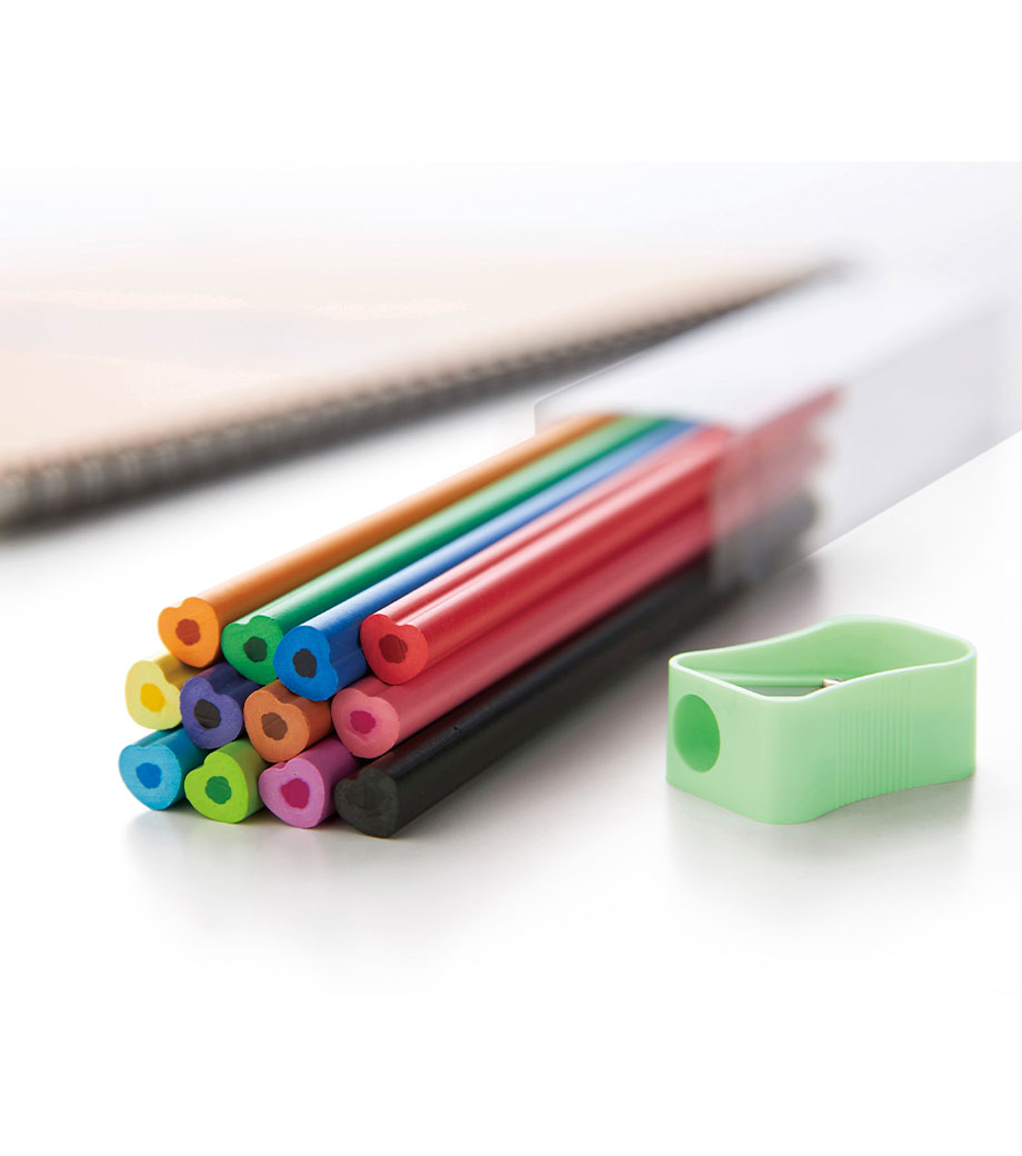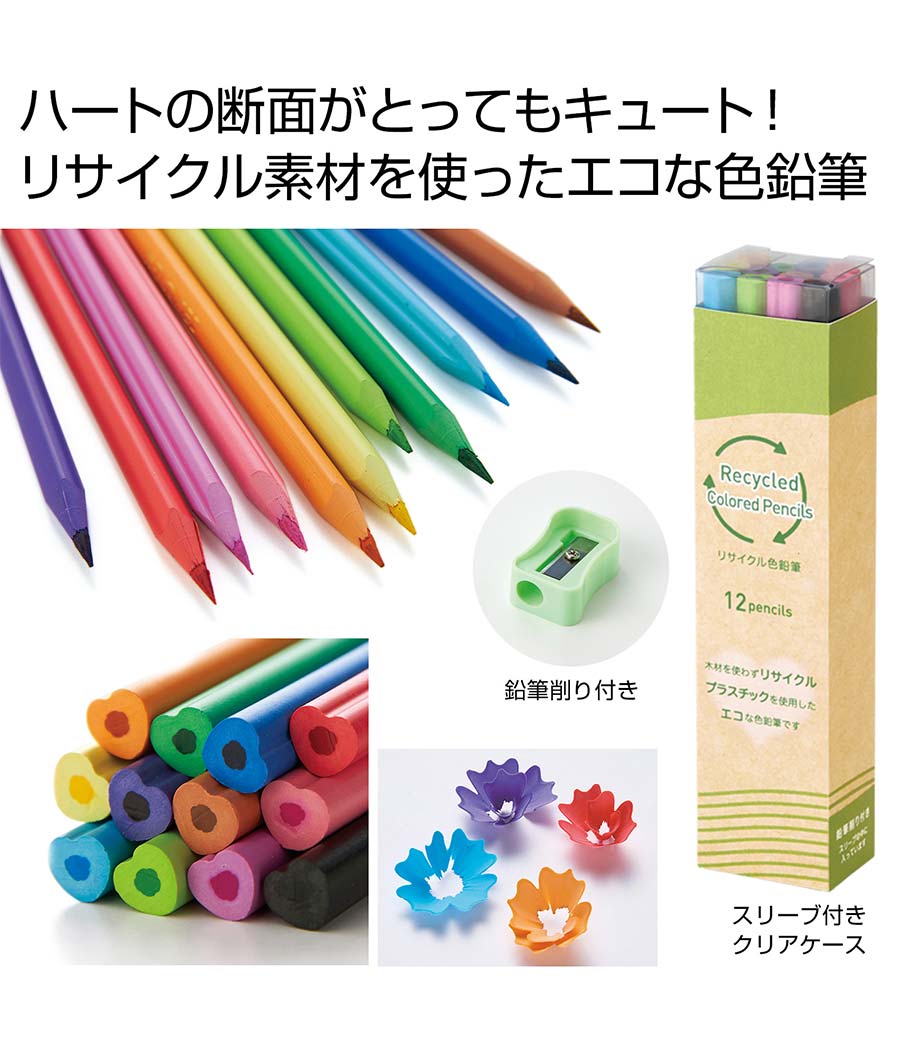 ハート型の断面が可愛らしい、12本の色鉛筆セット。木材を使わずリサイクルポリスチレンを使用したエコ商品です。鉛筆削り付きで、もらったらすぐに使えます。色鉛筆がハート型なので、削りくずが花びらのようになるのもポイントです。
