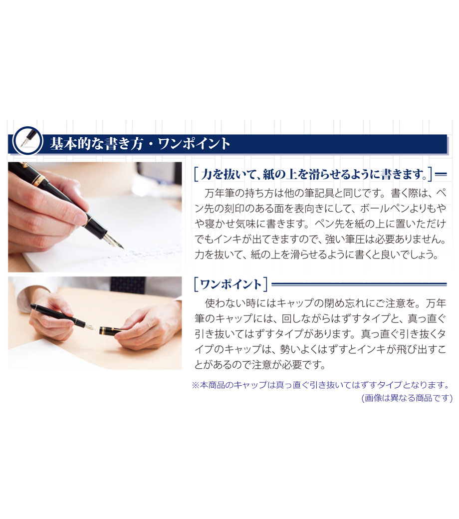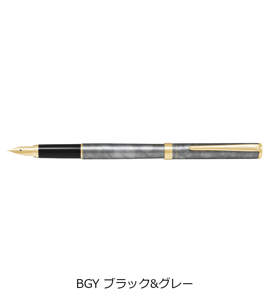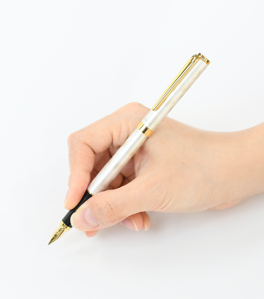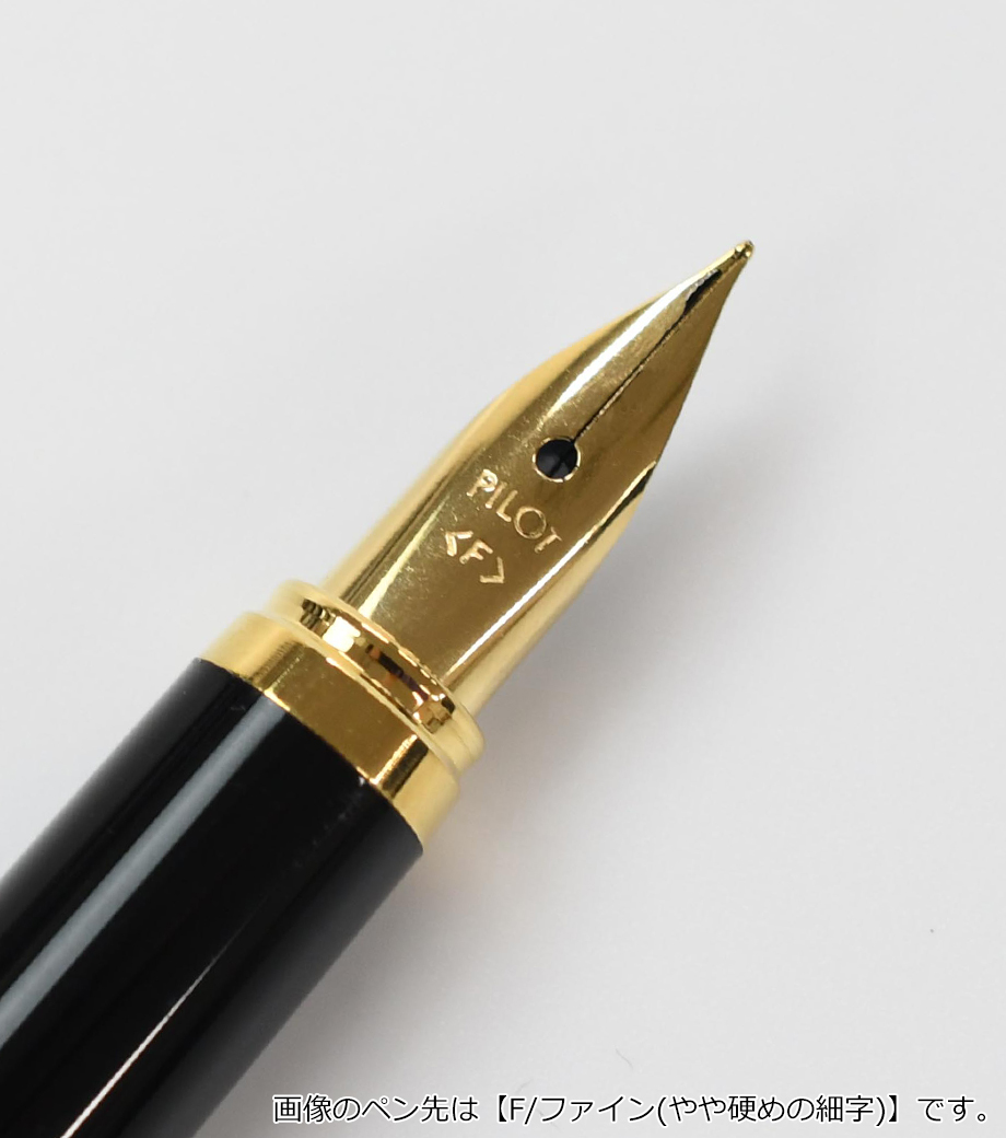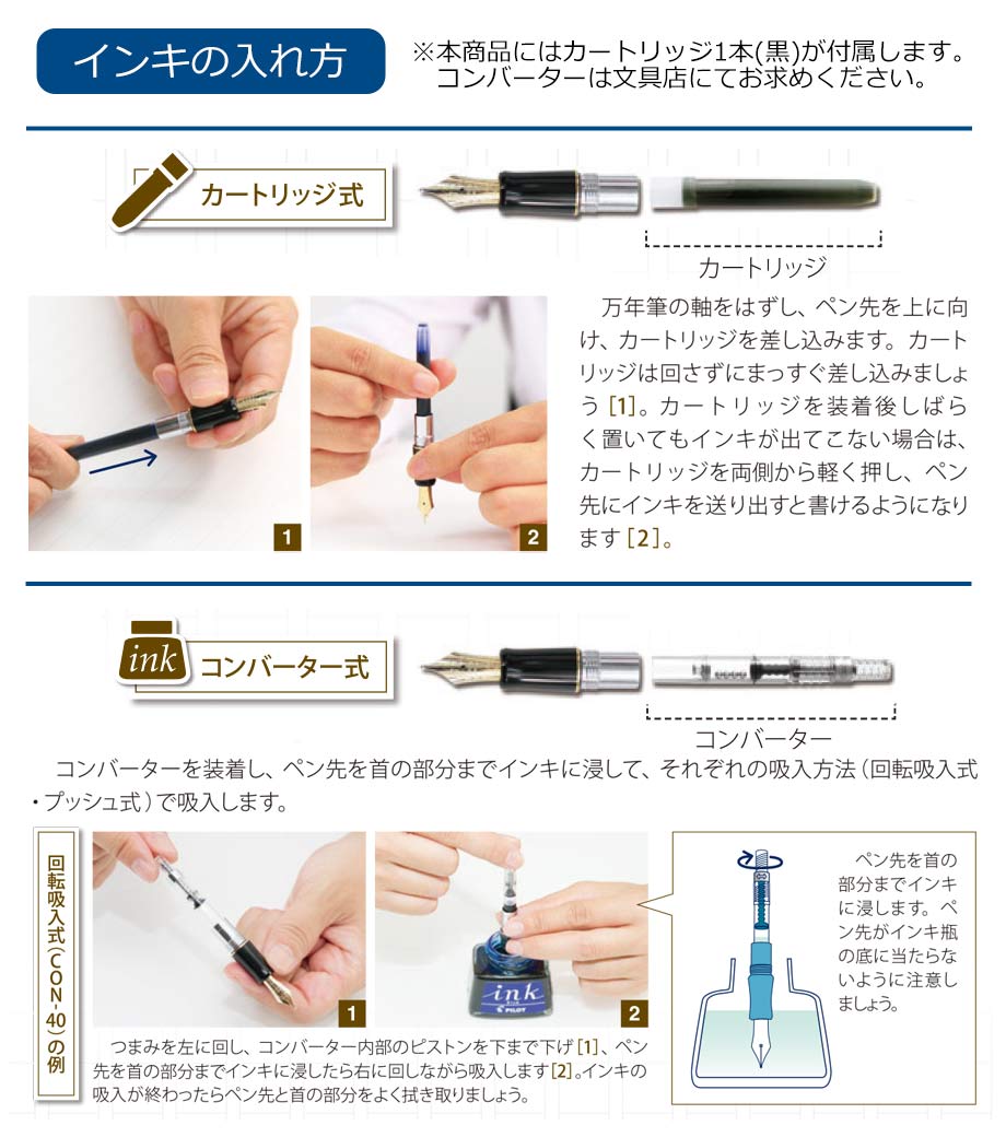 ペン先は耐久性の優れた特殊合金製で金メッキ仕上げ。ペン種は初めて万年筆を使用する方に最適な「F(ファイン)やや硬めの細字」です。インキはカートリッジとコンバーター(回転吸入式)両用。付属のカートリッジインキ(黒)の他、文具店で適合コンバーターをお求めいただき、お好きな色のインキを使用することも可能です。