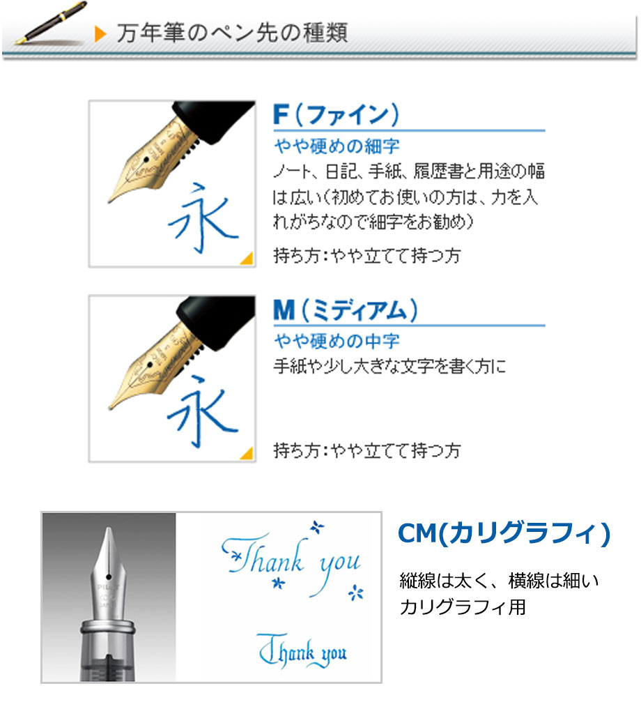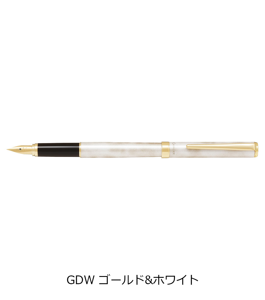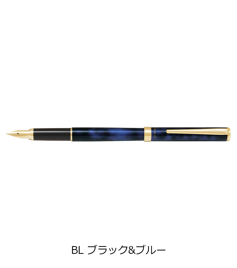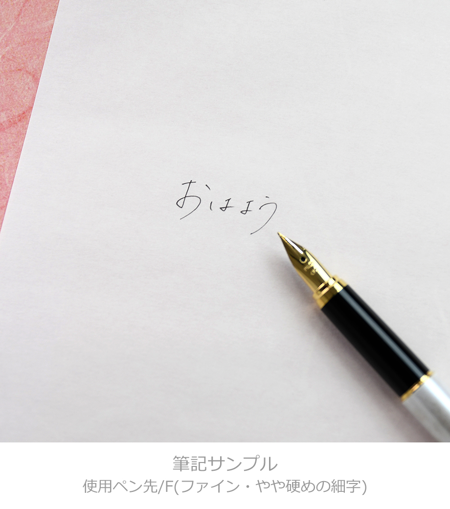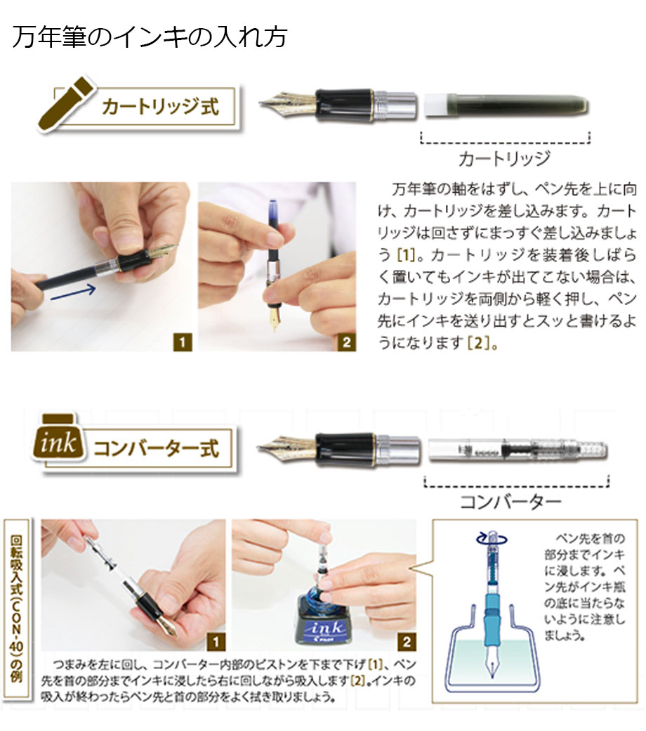 ペン先は耐久性の優れた特殊合金製で金メッキ仕上げ。ペン種は初めて万年筆を使用する方に最適な「F(ファイン)やや硬めの細字」です。インキはカートリッジとコンバーター(回転吸入式)両用。付属のカートリッジインキ(黒)の他、文具店で適合コンバーターをお求めいただき、お好きな色のインキを使用することも可能です。