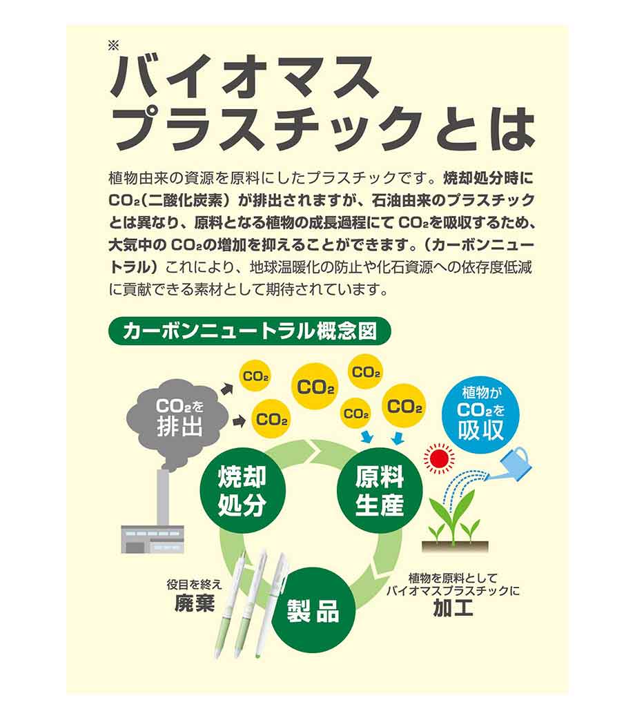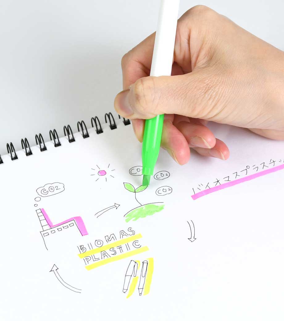 パイロット フリクションライト【バイオマスプラスチック】は植物から生まれたバイオプラスチックを使用した蛍光フリクションペン。後軸は、日本バイオプラスチック協会が定めるバイオマスプラ(BP)マークを取得しています。インクは摩擦熱で文字を消去でき、何度でも書き・消しが可能です。鮮やかなカラーペンは教科書や書類など重要ポイントにマーカーすれば目立ち、仕事や勉強に重宝します。