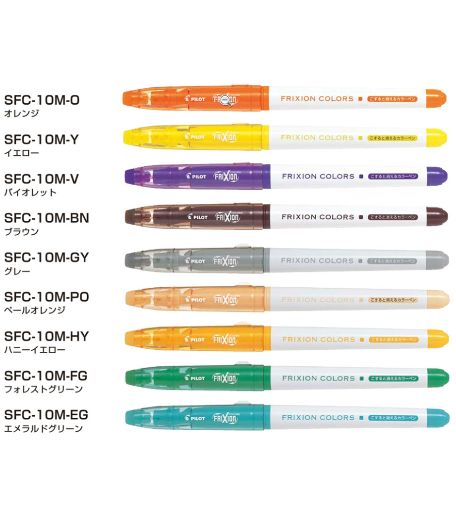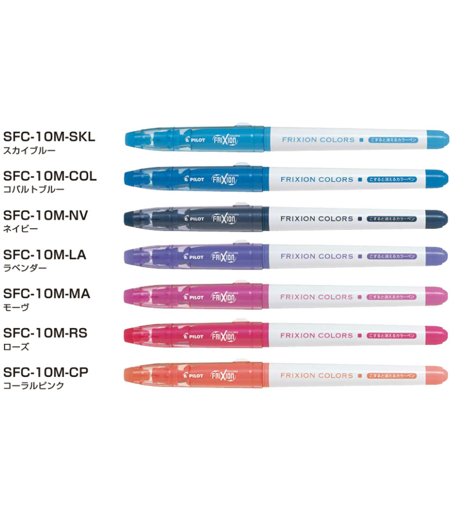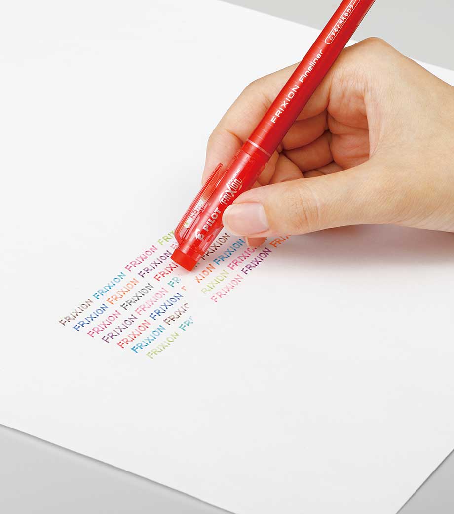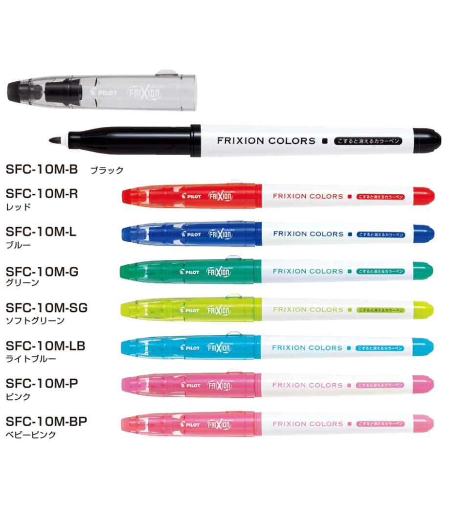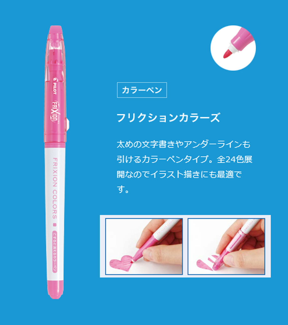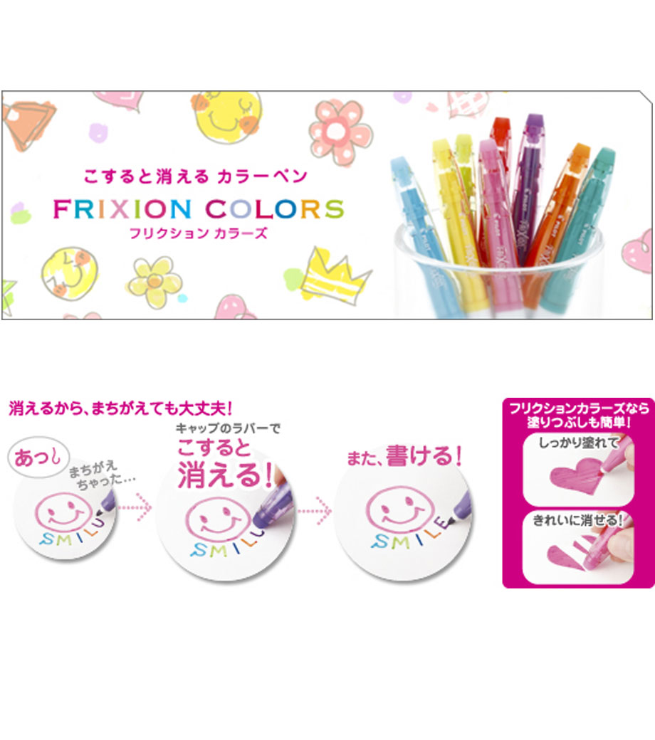 「フリクションカラーズ」は、こすると消えるフリクションペンシリーズの中でも12色と多彩な色を取り揃えており、太めの文字を書いたり、マーカーとしても使えるサインペンタイプです。イラストにも向いており、お子様の塗り絵やお絵描きにぴったりです。