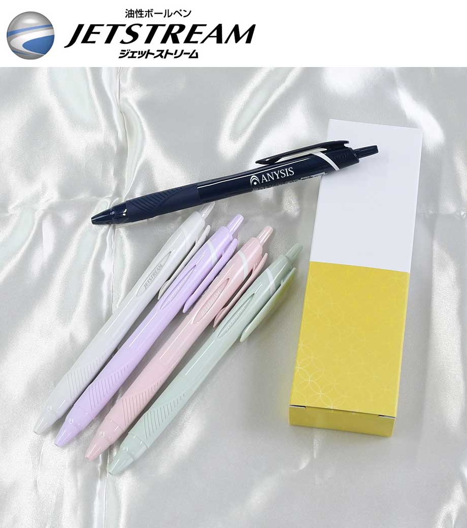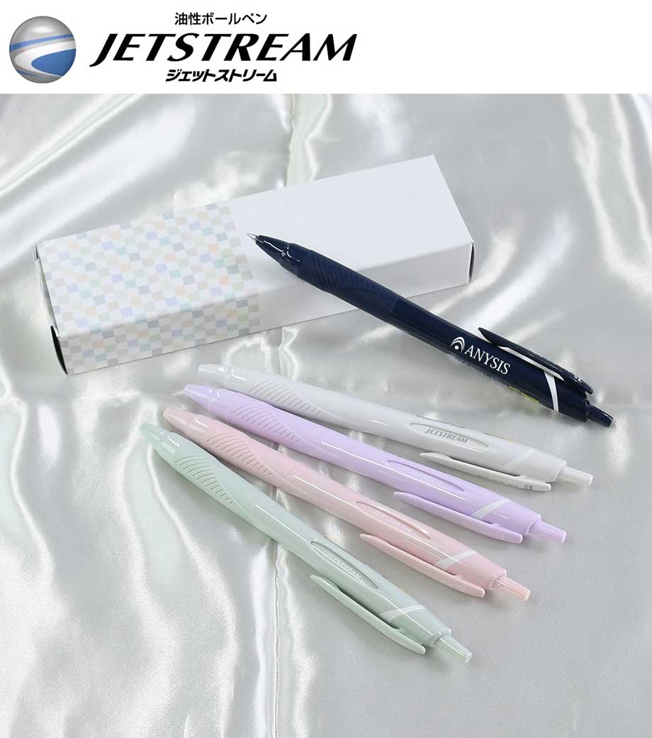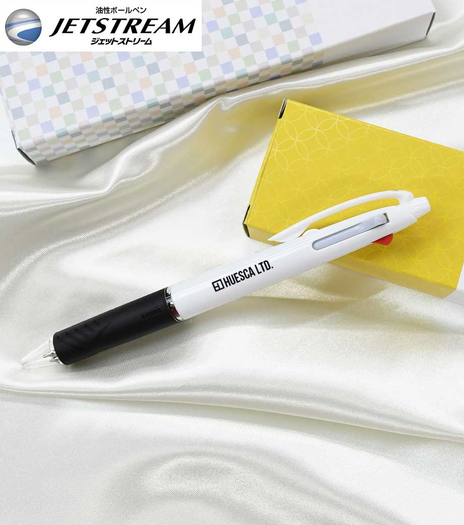 三菱鉛筆 ジェットストリーム白軸 0.5mmは、企業名やロゴを印刷するだけで宣伝効果の高いノベルティが製作できます。シンプルな白軸は1色でもフルカラーでも名入れが映えるので、大勢の人が来場する企業展示会やイベントでの配布にピッタリ!
