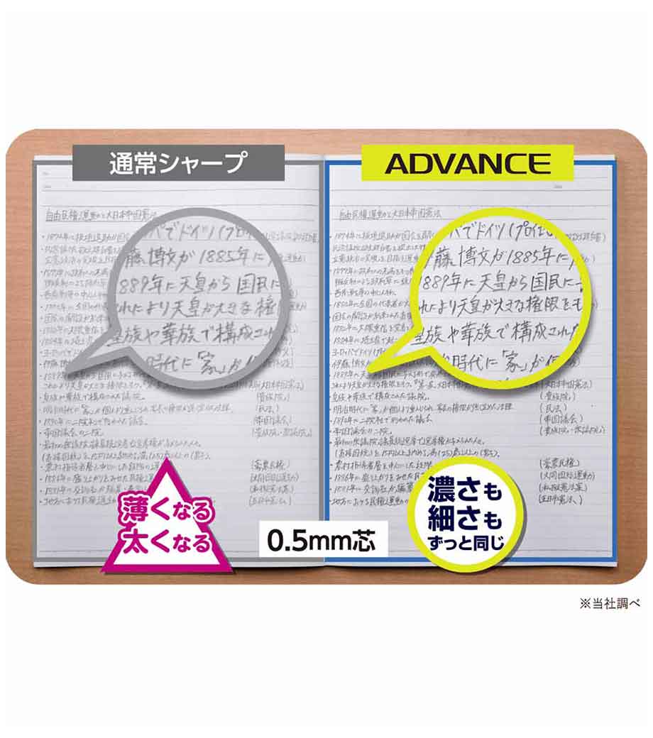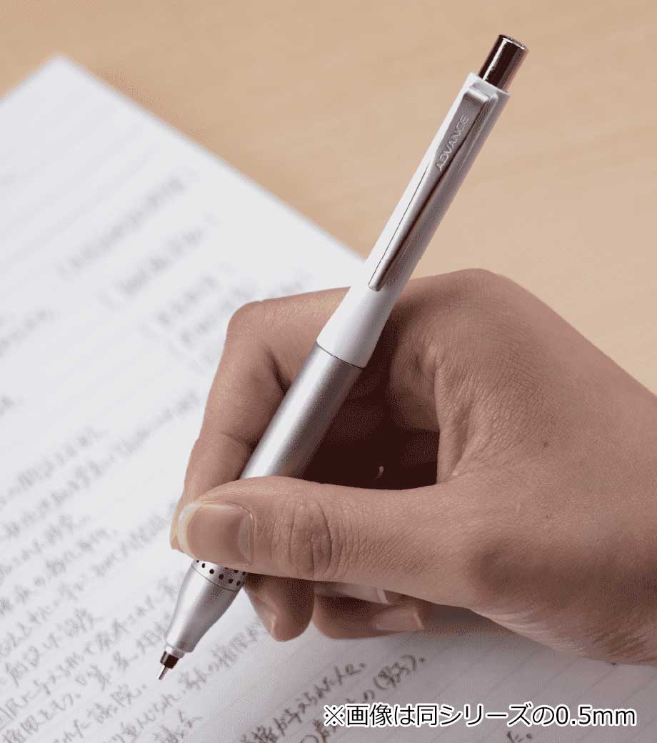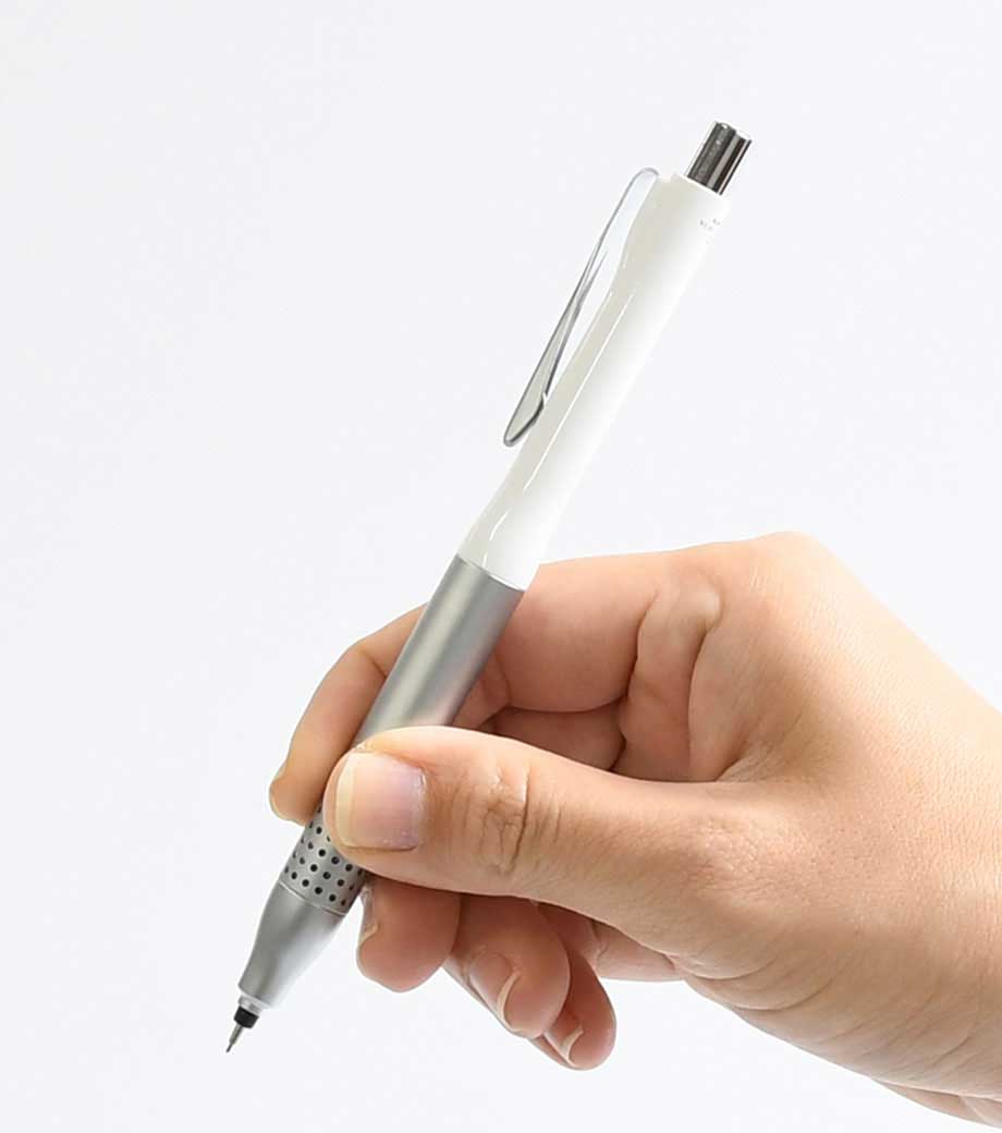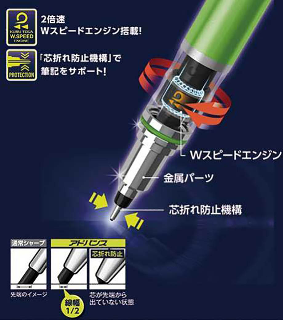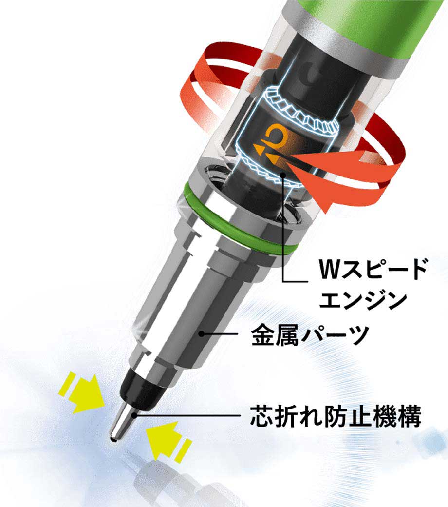 手帳などにも書きやすい芯径0.3mm。自慢のスピードエンジンW搭載で2倍の速さで芯がトガり、一定の線幅が続いて綺麗な筆記が可能になりました。芯折れ防止のスライドパイプもあり、芯がなくなるまでずっと書き続けることができます。