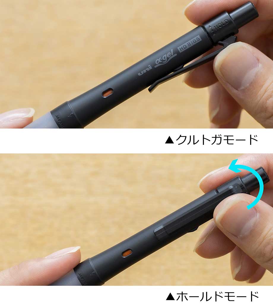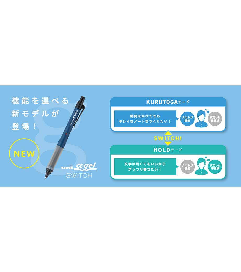 三菱鉛筆 ユニ アルファゲル スイッチは、クリップ部分を回すことで2つのモードを切り替えられるシャープペンシル。均一な太さの文字できれいなノートを作りたい時は「クルトガモード」、安定した筆記感でたくさん文字を書きたい時は「ホールドモード」と、使用シーンに合わせて使い分けることができます。握りやすい適度な硬さのグリップが、快適な筆記をサポート。学生さんの勉強のお供に最適です。