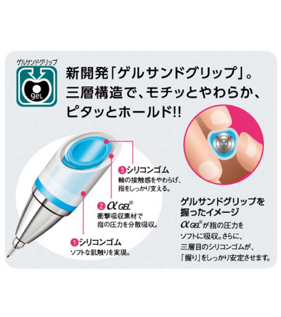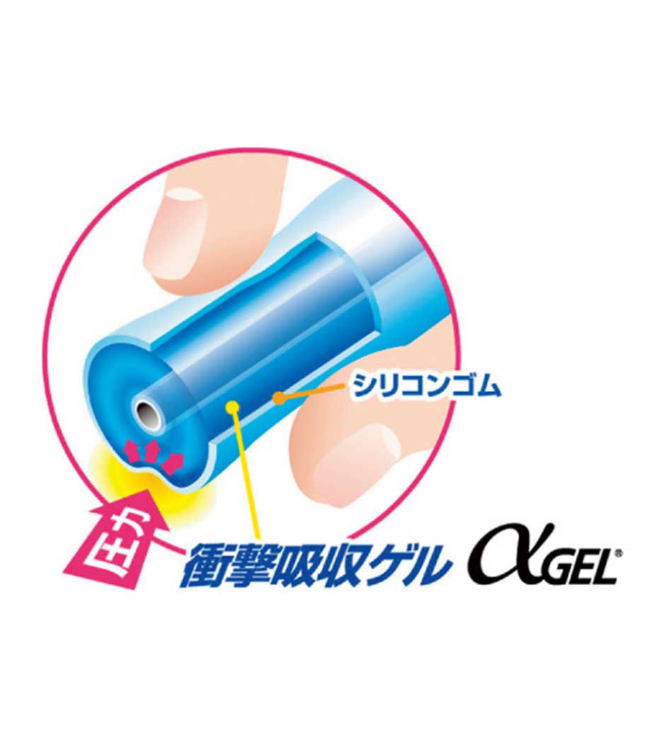 三菱鉛筆 ユニ アルファゲル(かため) 0.5mmのグリップはシリコーン素材の硬め高反発ゲル。太めで握りやすく安定感があり、快適な筆記をサポートしてくれます。ペン先は0.5mmで「シャカシャカ機構」搭載。ペンを振るだけで芯が出て学生さんの勉強のお供に最適です。
