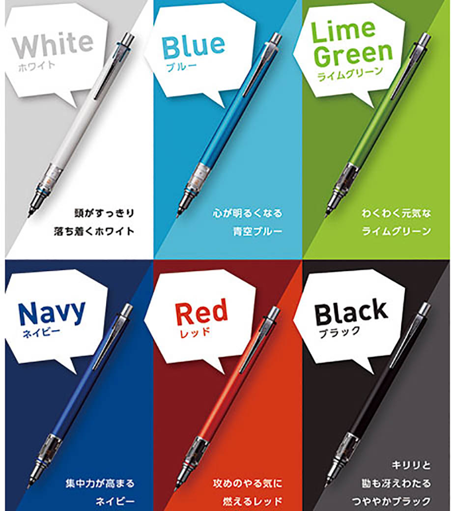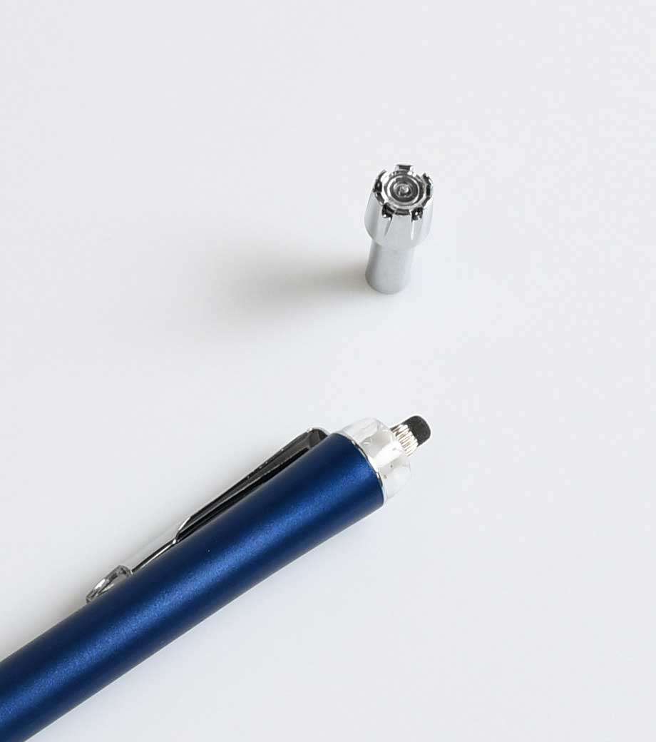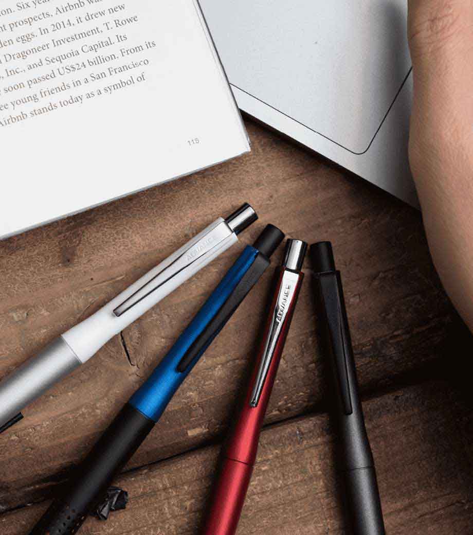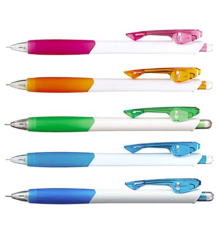 打合せや外出の時にこれ1本あれば他の筆記具は必要ないので便利です。本体カラーは黒、青、緑、白、透明の5色。本体側面に1色印刷が可能です。記念品としておすすめです。