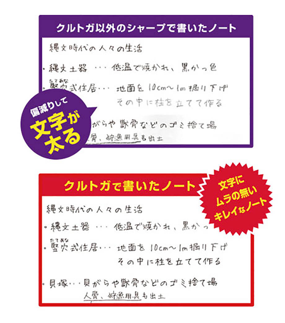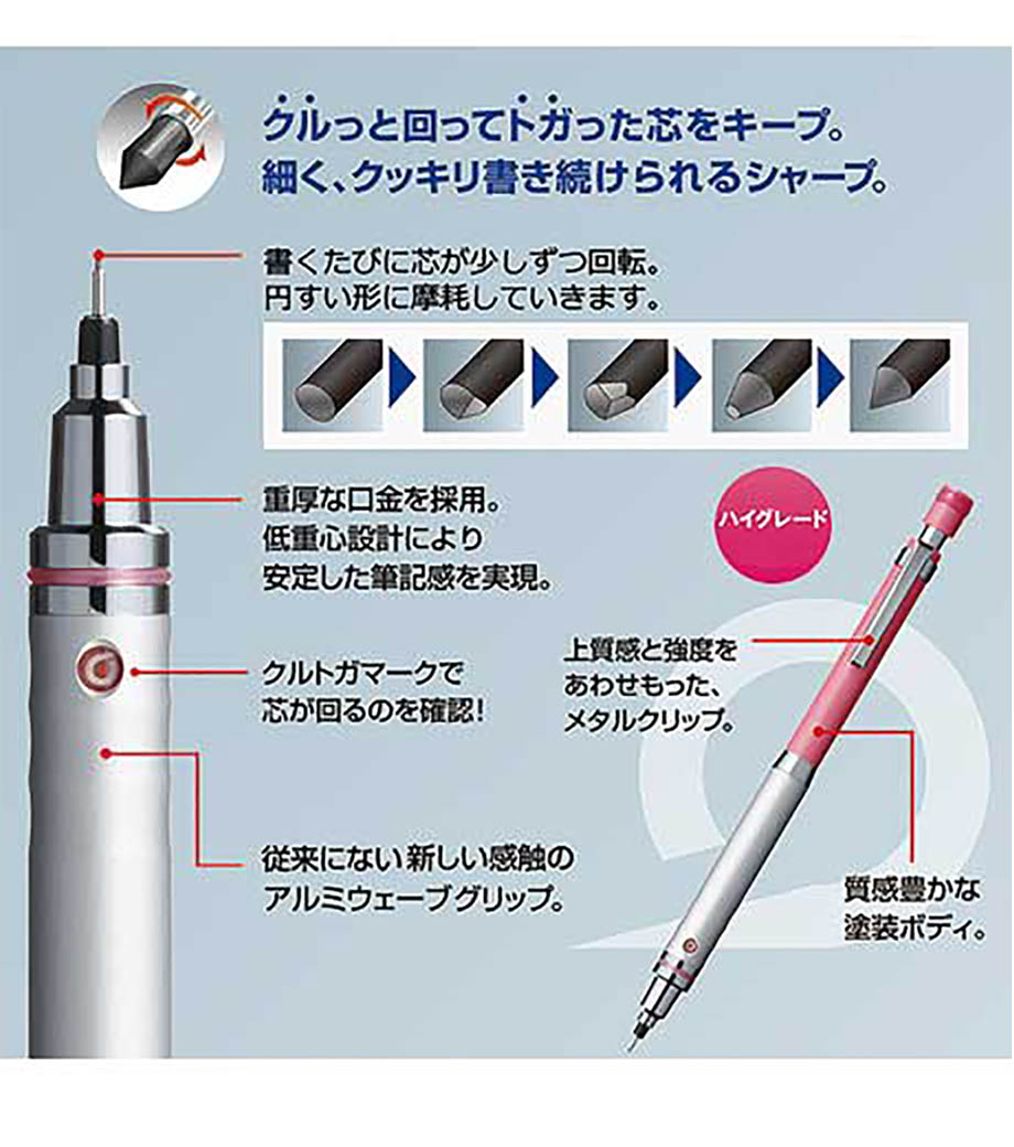 「三菱鉛筆 クルトガ」は自動新回転機構クルトガエンジンを搭載。芯に連結された内部ギアが、文字を書くときの筆圧を利用して、上下に運動。書くたびに芯を少しずつ回転させるクルトガエンジンによって、円心形に芯が摩耗し、いつまでも均等にとがった書きやすい芯の状態をキープします。だんだん太くなる、薄くなるといった文字ムラをなくし、くっきり見やすいノートや資料が書きあがります。