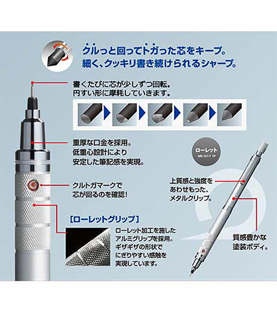 低重心構造で安定した書き心地が自慢のハイスペックシャープペン。日本のテクノロジーを駆使した逸品は、海外へのお土産などにも好評です。学生の普段使いだけでなく、プロの製図用シャープペンとしても選ばれています。