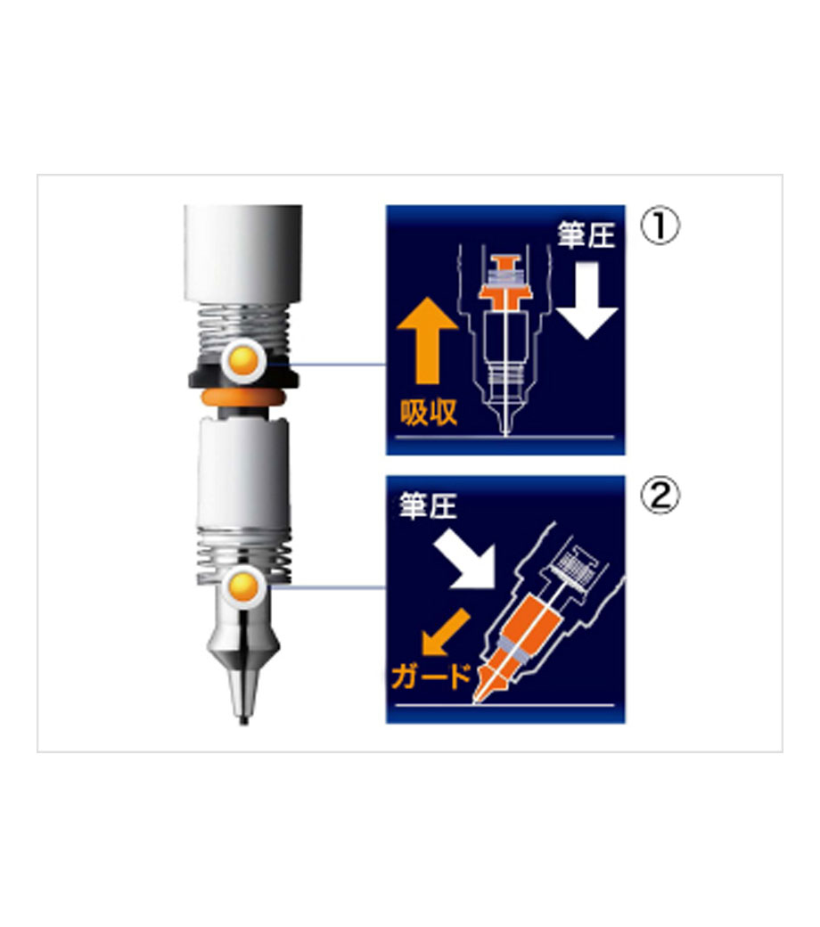 2.ペン先がモグることで、筆圧を吸収し芯が折れにくい「アクティブサスペンション」機構を搭載。