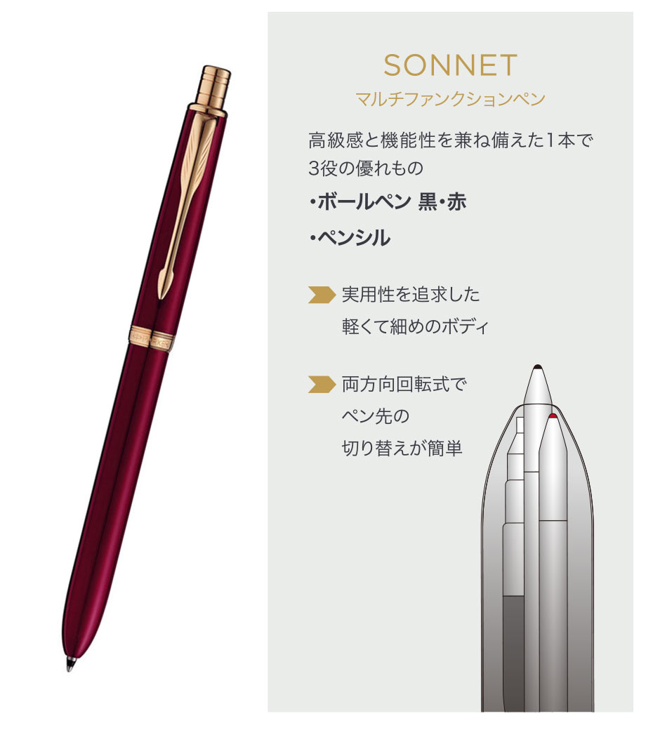 パーカー ソネット オリジナル マルチファンクションペンは、海外ブランド品では珍しい日本製(インクを除く)のマルチペン。「優美さのシンボル」として、英国の老舗筆記具ブランド「パーカー」を代表するシリーズの一つです。