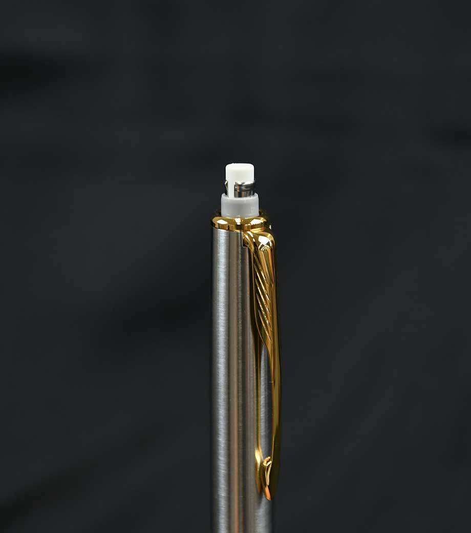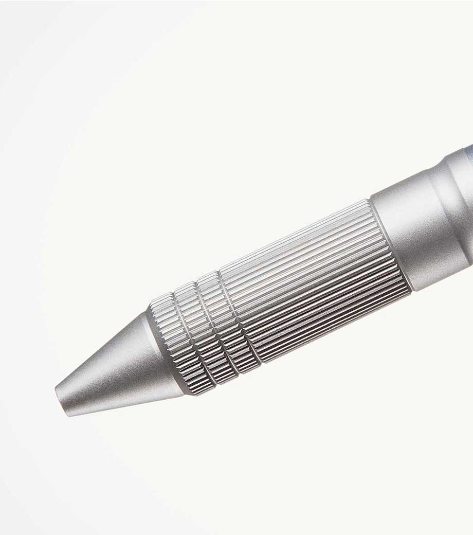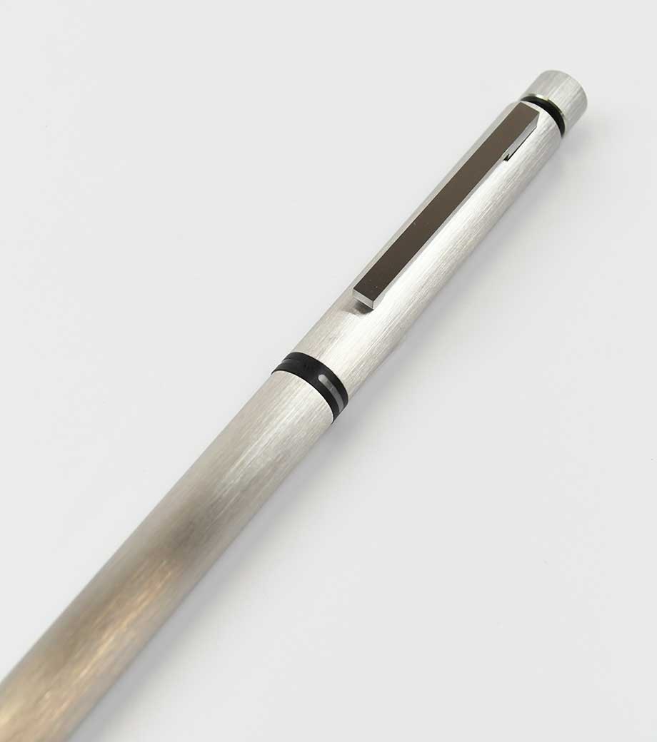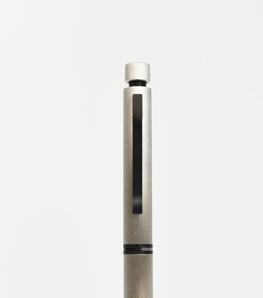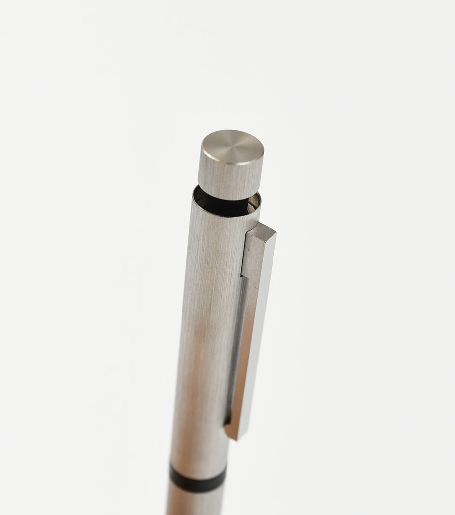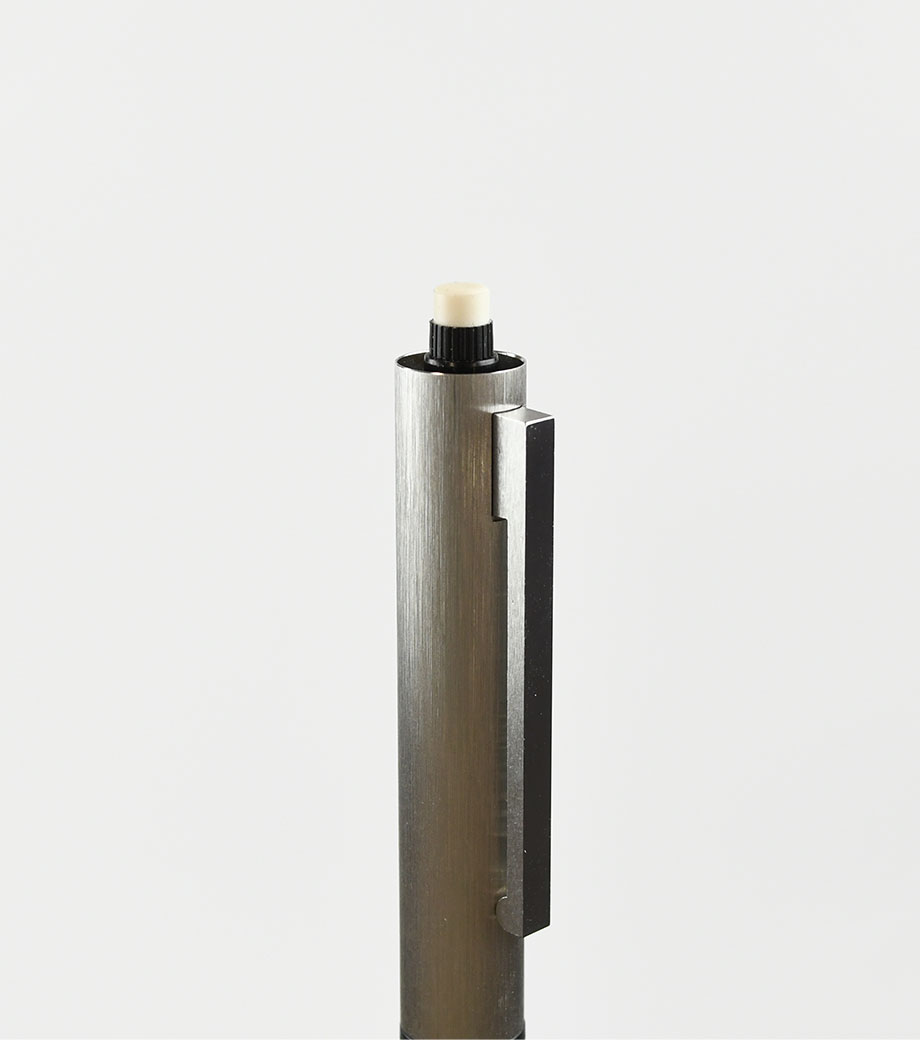 中心の色の付いた印にクリップの向きを合わせると、対応する種類のペン先が出てきます。ザラっとした独特な軸の質感が印象的です。重量は重めですが、筆記の際に重心がブレにくく安定して字を書けます。落ち着いたマットなシルバーの輝きは、持っているだけでハイステータスな印象に。シンプルで無駄のない洗練されたフォルムは、どんなシーンにも馴染みやすくなっています。