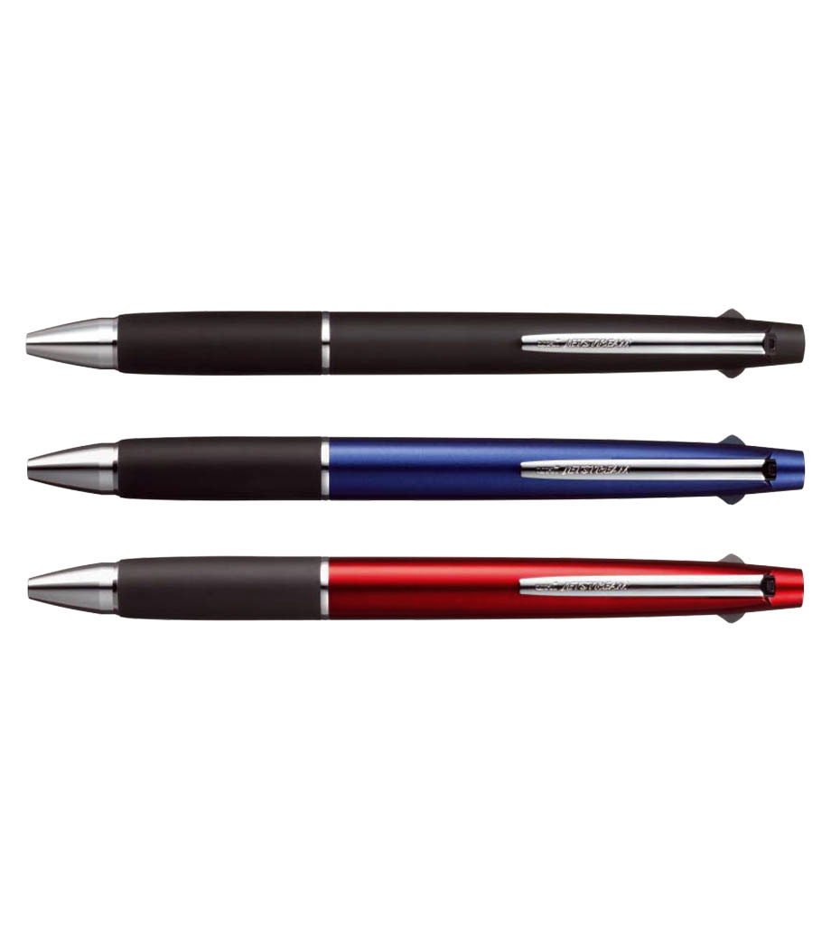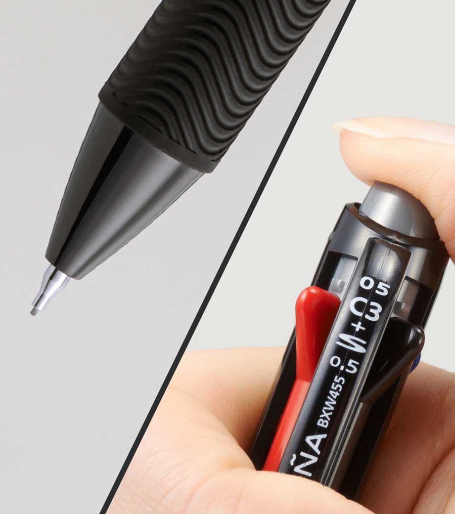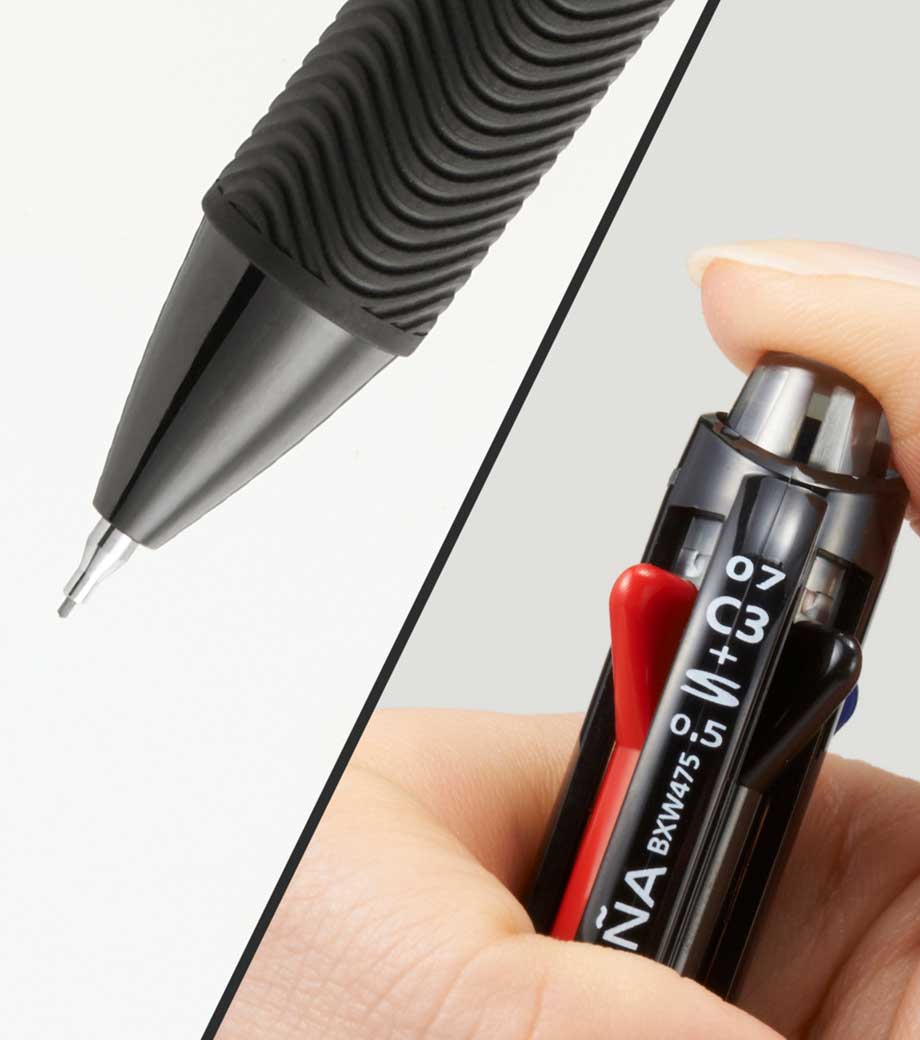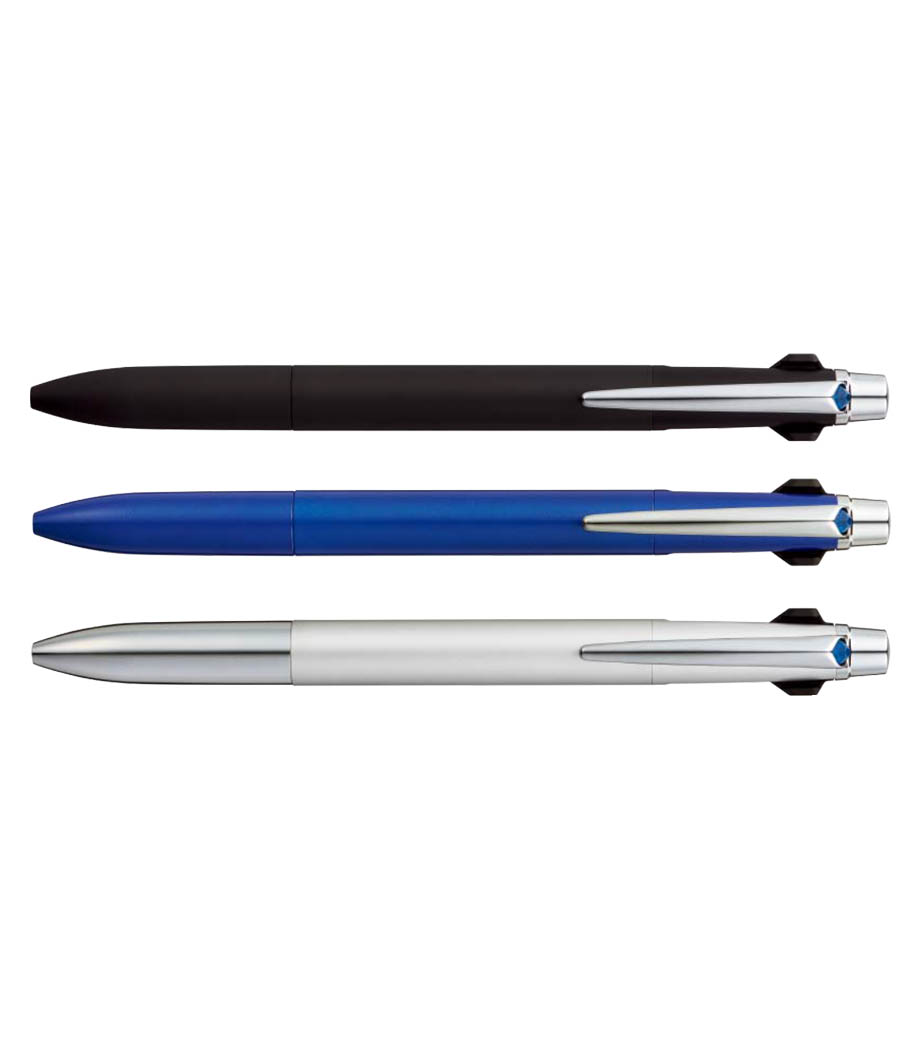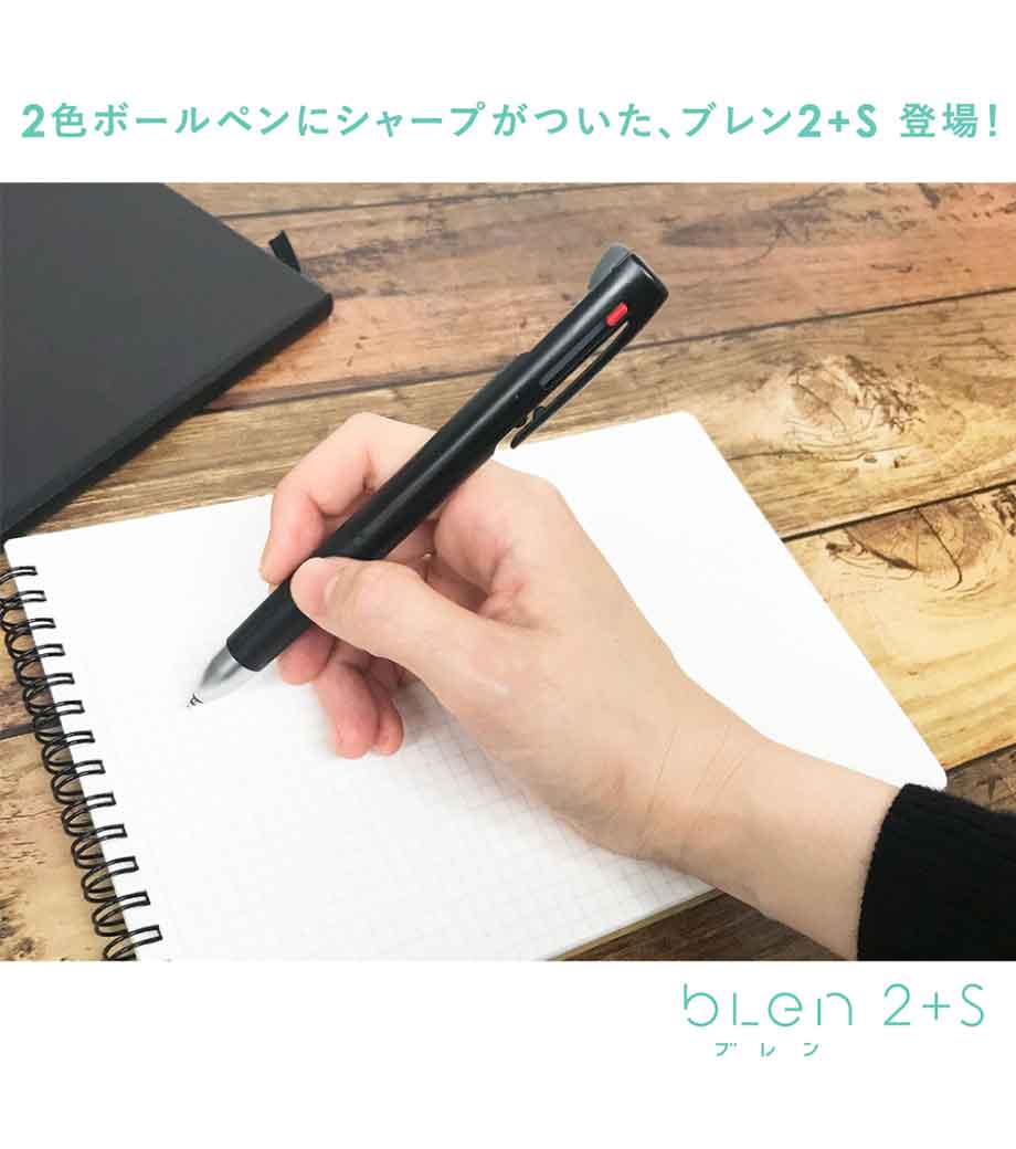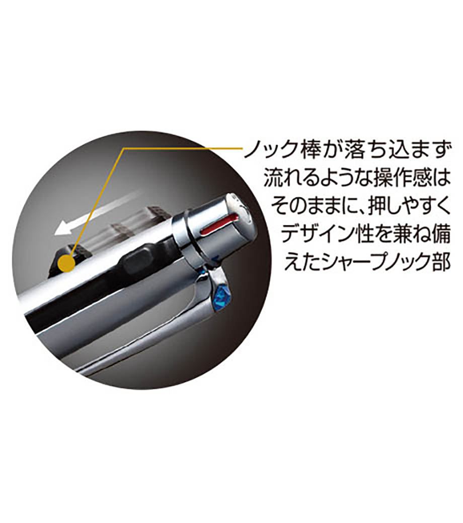ストレスフリーな書き心地が魅力の多機能ペンです。筆記時の振動を抑える独自の「ブレンシステム」を搭載しています。単色タイプと変わらないスリムボディで携帯に便利。背面のノック部を押すとシャーペンが出せます。ボールペンは耐水性・耐光性に優れたエマルジョンインクを採用。細すぎず太すぎない0.5mmのボール径です。公式文書への記入にも使えるので、オンオフ問わず活躍します。