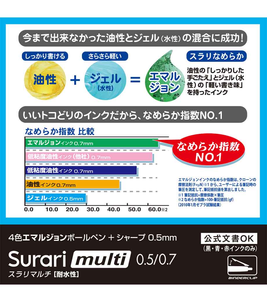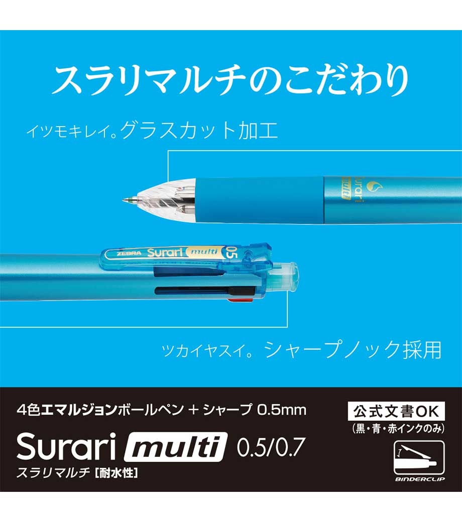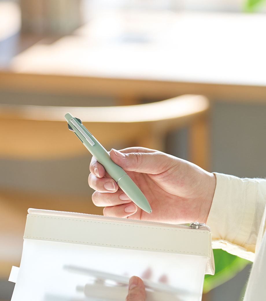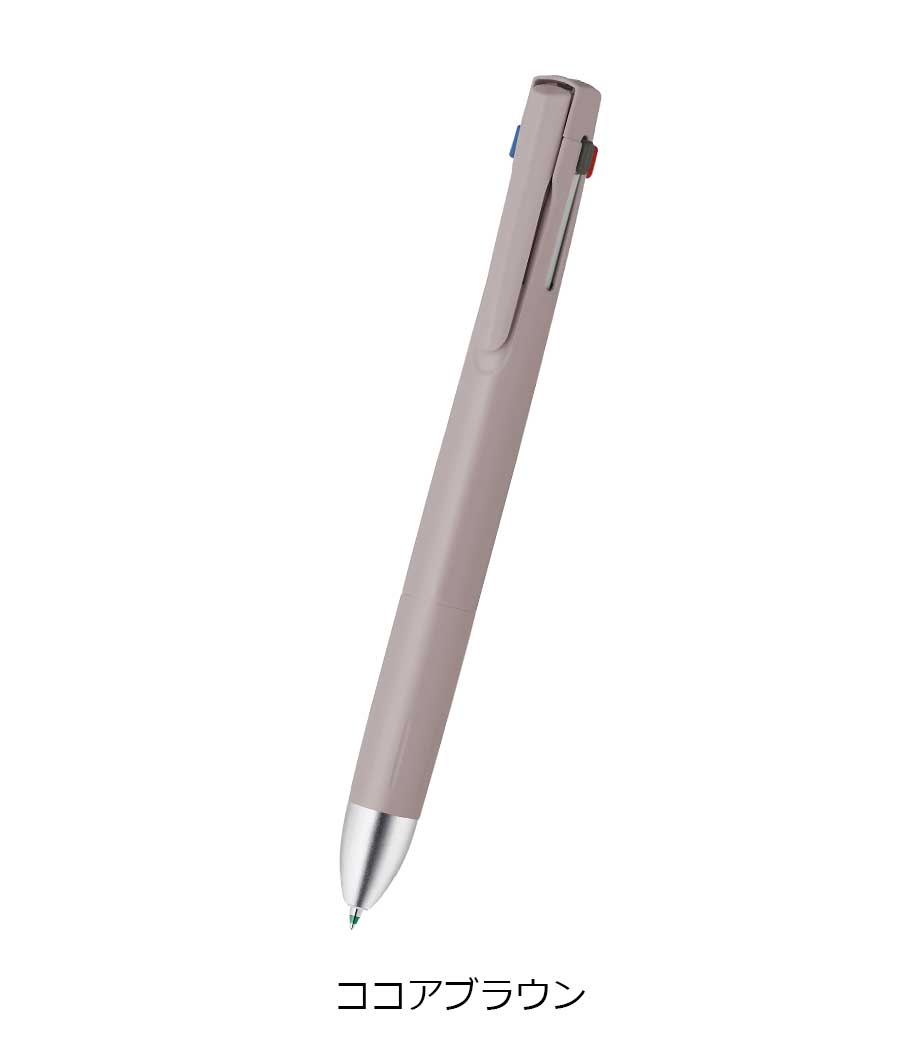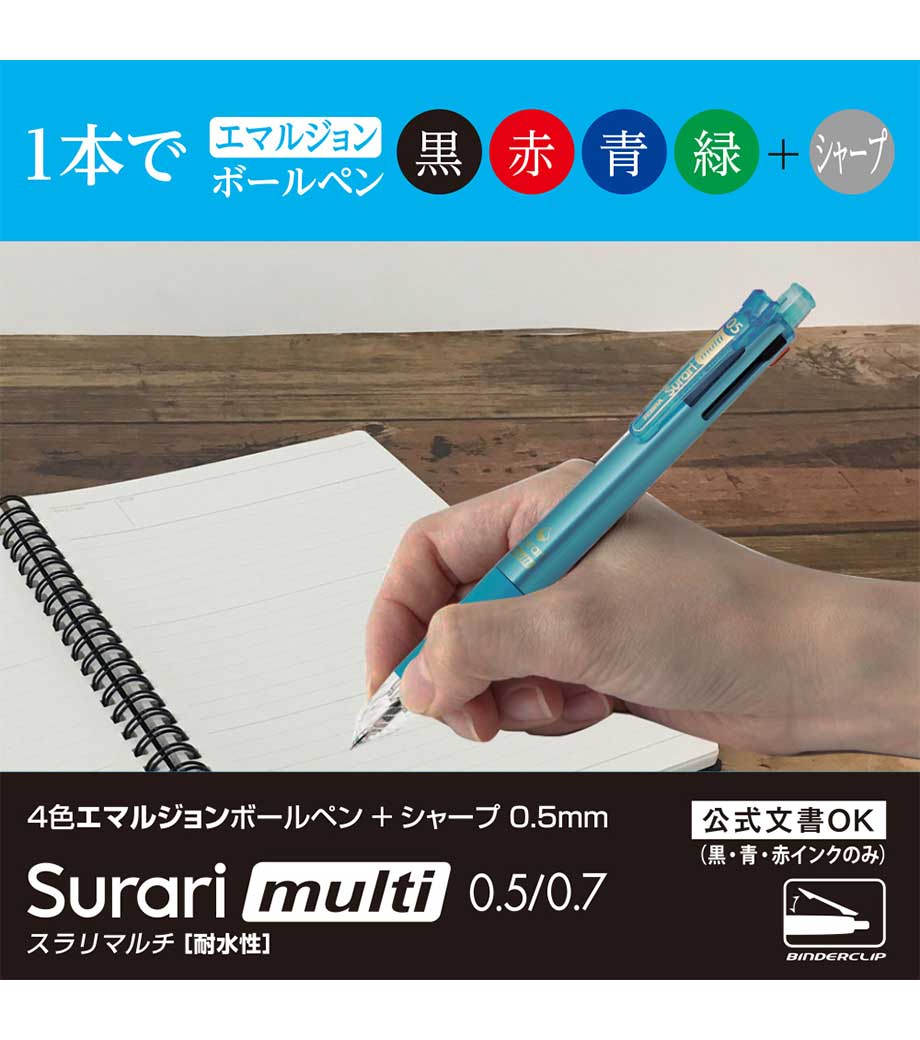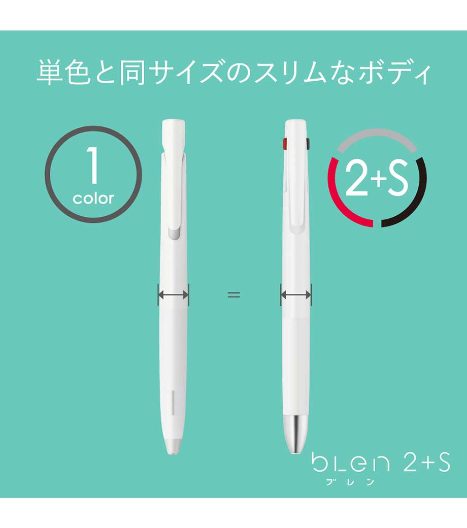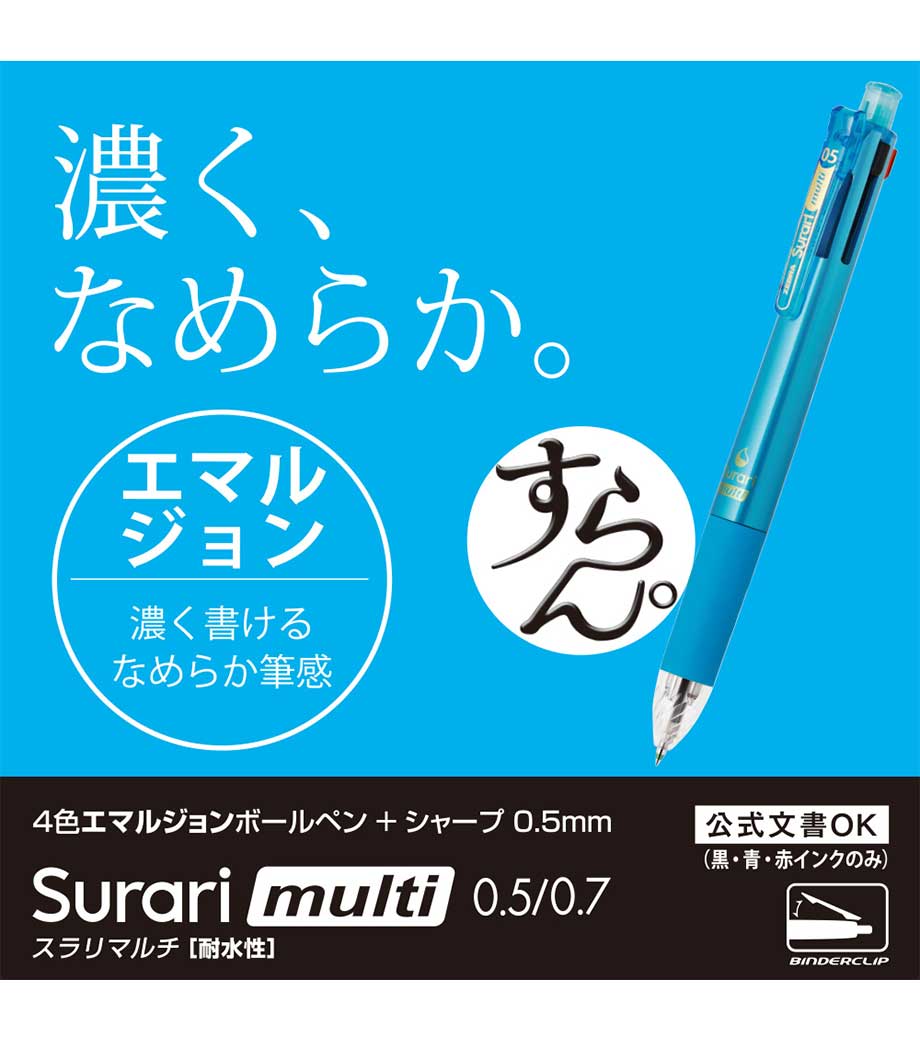 ストレスフリーな書き心地が魅力の多機能ペンです。筆記時の振動を抑える独自の「ブレンシステム」を搭載しています。単色タイプと変わらないスリムボディで携帯に便利。背面のノック部を押すとシャーペンが出せます。ボールペンは耐水性・耐光性に優れたエマルジョンインクを採用。細すぎず太すぎない0.5mmのボール径です。公式文書への記入にも使えるので、オンオフ問わず活躍します。