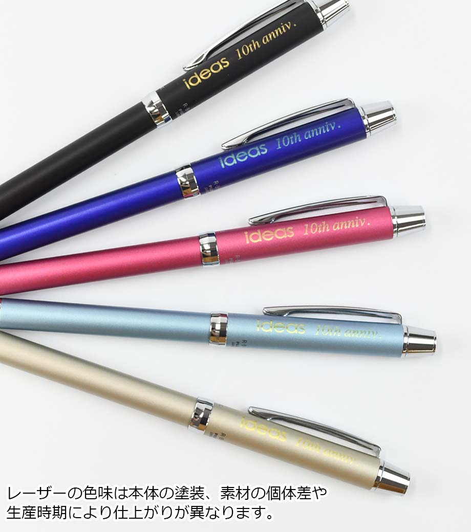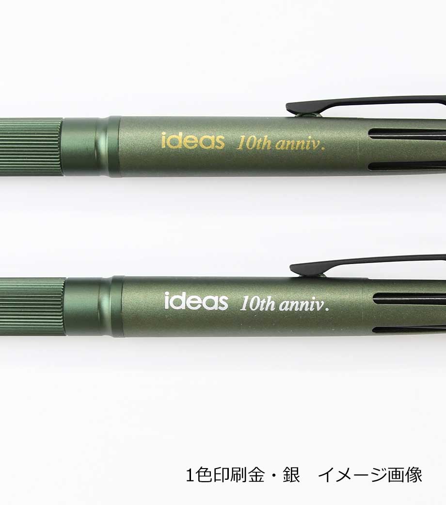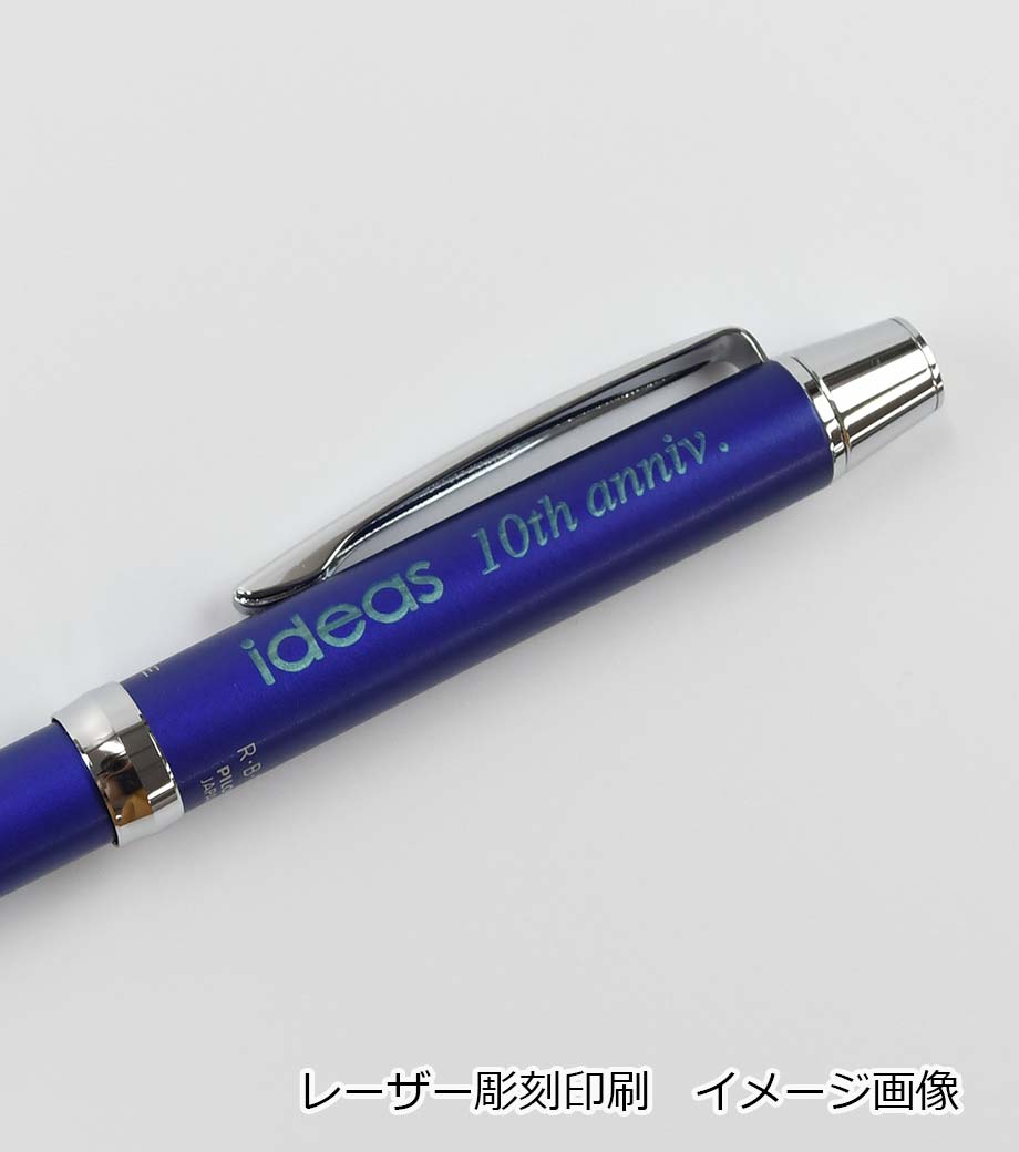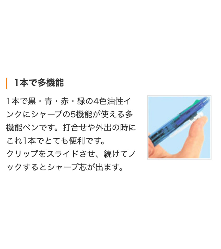 打合せや外出の時にこれ1本あれば他の筆記具は必要ないので便利です。本体カラーは黒、青、緑、白、透明の5色。本体側面に1色印刷が可能です。記念品としておすすめです。