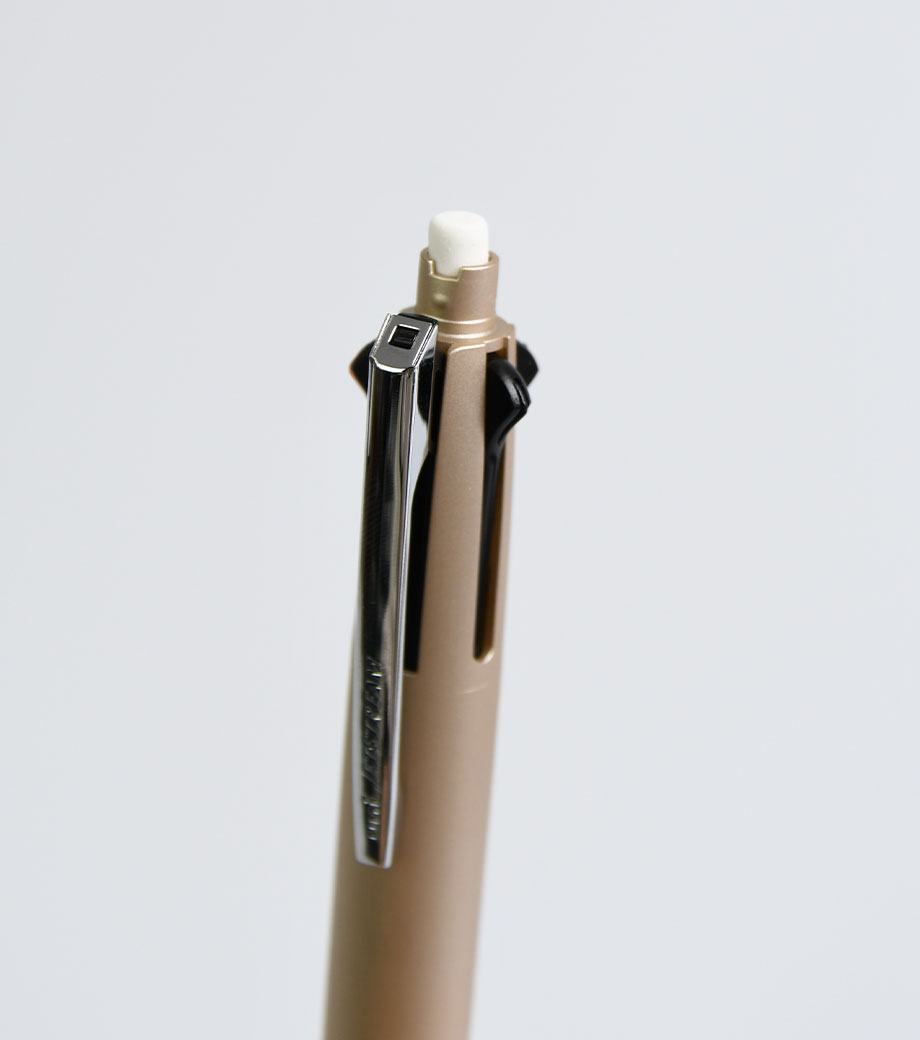 三菱鉛筆 ジェットストリーム 多機能ペン 4&1 Metal Edition(メタルエディション)は、消しゴムキャップとグリップ部分にアルミ素材を採用。滑り止めの役割があるローレット加工を施すことで、握りやすさを向上させています。軽い書き心地でジェットストリームインクとの相性抜群!汗や汚れにも強く、経年劣化を防いでくれます。1本あると便利なシャープペン付きの多色ボールペンです。