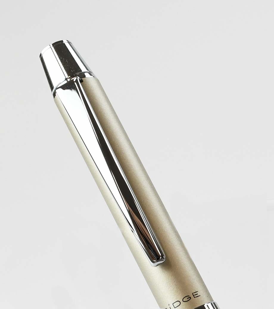 重すぎず軽すぎない絶妙な重量感で、持ち手にフィットする筆記感覚があります。軸は両方向に回転可能。複合ペンとは思えないほど細身のボディからは繊細さが感じられ、持っているだけで上品な印象に。中央のリング部分にはさりげなくブランド名とロゴマークが刻印されています。