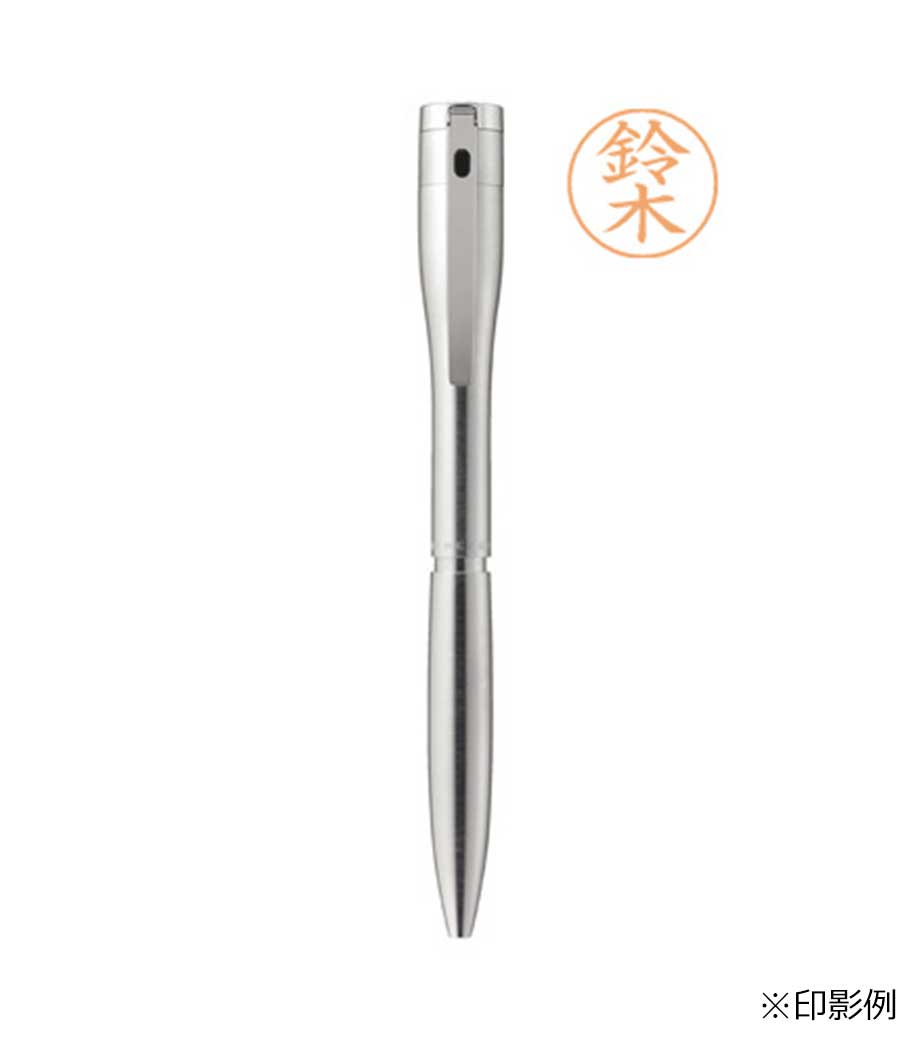 シヤチハタ ネームペン キャップレスエクセレント(シルバー)は、キャップを外さずに捺印できるネームペンです。印面キャップは指1本でオープン・クローズできるスライド式なので、キャップを紛失する心配もありません。ペン軸を左右に回転すると、ボールペンかシャープペンシルが繰り出す仕組み。このネームペン1本で、ボールペン・シャープペン・ハンコの3つの機能があるので、持ち歩きにも大変便利です。